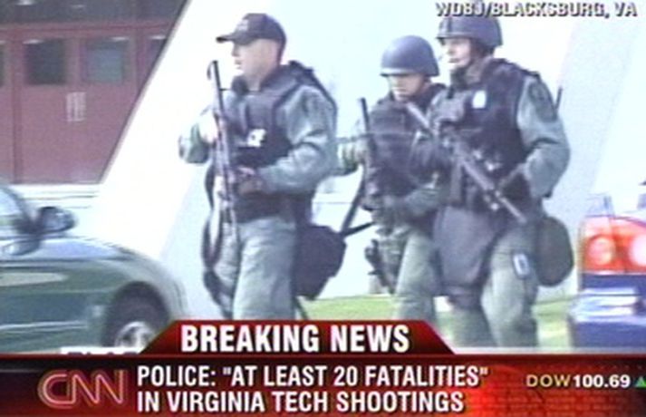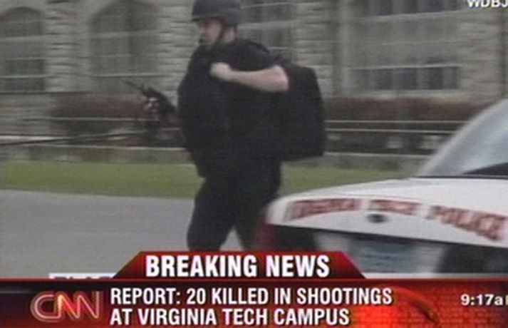 32 eru látnir eftir skotárás í Virgina-tækniháskólanum í Blacksburg í Virginiuríki í Bandaríkjunum í dag. Um 20 manns eru á spítala með skotsár. Talið er að einn maður hafi verið að verki í í tveimur árásum með um tveggja klukkustunda millibili. Samkvæmt nýjustu fregnum var byssumaðurinn ungur karlmaður af asískum uppruna. Hann mun hafa komið inn í skólann að leita að kærustunni sinni, vopnaður skammbyssu og hóf brátt skothríðina. Hann fór meðal annars inn í skólastofu og skaut á nemendur sem þar voru og síðan á heimavist skólans. Dagmar Kristín Hannesdóttir, sem er í doktorsnámi í sálfræði við skólann, sagðist í samtali við Stöð 2 að klukkustund hafi verið liðin af fyrstu kennslustund morgunsins þegar fréttir bárust af því að byssumaður væri laus í skólanum. Hún sagði að yfirmaður hefði komið og beðið um að kennslustofunni yrði læst þegar í stað. Það var gert strax og við tók bið í eina og hálfa klukkustund. Dagmar segir að þann tíma hafi takmarkaðar fréttir af ástandinu borist þeim. Síðan þegar ljóst hafi orðið hversu margir voru drepnir hafi alger skelfing gripið um sig í skólanum. "Ég brotnaði alveg saman, ég hafði ekki áttað mig á því að þetta væri svona rosalegt," sagði Dagmar í samtali við Stöð 2 í kvöld. George W. Bush, forseti Bandaríkjanna, hefur lýst yfir hryllingi vegna skotárásanna. Talsmaður hans sagði hann fyrst og fremst hugsa um fjölskyldur þeirra sem létu lífið og að hann samhryggðist þeim. Óstaðfestar fregnir herma að fleiri kunni að vera látnir en ekki liggur fyrir hvort árásarmaðurinn hafi svipt sig lífi. Sjónvottar sögðu að nemendur jafnvel stokkið út á fjórðu hæð skólans til að forðast árásarmanninn. Ekki er vitað hvort að byssumaðurinn hafi verið nemandi í skólanum. 26 þúsund manns eru í skólanum. Allri kennslu hefur verið hætt í honum og var fólki sem statt var á háskólasvæðinu ráðlagt að læsa að sér og halda sig frá gluggum. Tólf létu lífið í sams konar skotárás í Columbine-framhaldsskólanum í Littleton í Colorado árið 1999. Þá særðust 24. Lögreglumenn sjást hér bera fólk út úr skólanum.APFréttamynd úr CNN í dagAPLögreglumenn á vakt fyrir utan skólann.APLögreglumaður sést hér handtaka einn á skólalóðinni í tengslum við skotárásirnar.APÖnnur mynd úr útsendingu CNN í dag.APLögreglumenn að störfum á skólalóðinni.APSkjámynd úr útsendingu CNN í dag.APLögreglumenn bera saman bækur sínar áður en þeir fara inn á skólalóðina.APLögreglumenn bera sært fólk út úr skólabyggingunni.APLögreglumenn sjást hér bera sært fólk úr einni af byggingum skólans.AP