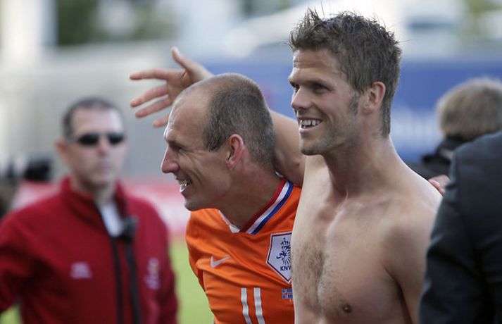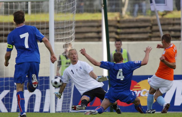 Það var fín stemning á Laugardalsvelli í gær þegar Ísland tók á móti stórliði Hollands í fínu veðri. Vilhelm Gunnarsson, ljósmyndari Vísis og Fréttablaðsins, var á staðnum og fangaði stemninguna. Afraksturinn má sjá hér að neðan. Flottir. Þessir landsliðsmenn framtíðarinnar löbbuðu inn á völlinn með hetjunum sínum.Mynd/VilhelmHermann Hreiðarsson hér í baráttu á teignum.Mynd/VilhelmHollensku áhorfendurnir settu sinn svip á stemninguna.Mynd/VilhelmTólfan stóð fyrir sínu.Mynd/VilhelmArjen Robben skapaði oft mikinn usla í gær en Gunnleifur sá við honum hvað eftir annað.Mynd/VilhelmHermann Hreiðarsson lét Van Persie finna fyrir því í gær.Mynd/VilhelmEiður Smári var brosmildur um tíma.Mynd/VilhelmPálmi Rafn var duglegur en mátti oftar en ekki við margnum.Mynd/VilhelmHermann og Robben voru mestu mátar eftir leikinn.Mynd/VilhelmLandsliðsþjálfarinn Ólafur Jóhannesson fylgist með boltanum.Mynd/VilhelmGunnleifur var frábær í markinu og ver hér frá Robben.Mynd/VilhelmGunnleifur öskrar sína menn áfram.Mynd/Vilhelm
