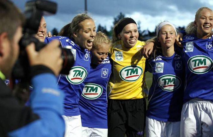 Stjörnukonur fögnuðu fyrsta Íslandsmeistaratitli félagsins eftir 3-0 sigur á Aftureldingu í gær. Stjarnan er sjöunda félagið sem nær að verða Íslandsmeistari kvenna í fótbolta en það eru liðin 18 ár síðan að nýtt nafn var skrifað á bikarinn. KR vann Íslandsbikarinn í fyrsta skiptið árið 1993 og varð þá sjötta félagið til að vinna hann en síðan hafa bara Breiðablik (6 sinnum), Valur (6 sinnum) og KR (6 sinnum) unnið Íslandsmeistaratitilinn hjá konunum. Stjarnan hefur unnið þrettán leiki í röð í Pepsi-deild kvenna og náð í 45 af 48 mögulegum stigum í deildinni í sumar. Þær eru því búnar að tryggja sér titilinn þótt að það eigi enn eftir að spila tvær umferðir af mótinu. Stefán Karlsson, ljósmyndari Fréttablaðsins og Vísis, var á leik Stjörnunnar og Aftureldingar á Stjörnuvellinum í gær og náði þessum skemmtilegu myndum. Myndirnar má sjá í albúminu hér að neðan. Hægt er að sjá myndirnar stærri með því að smella á þær.