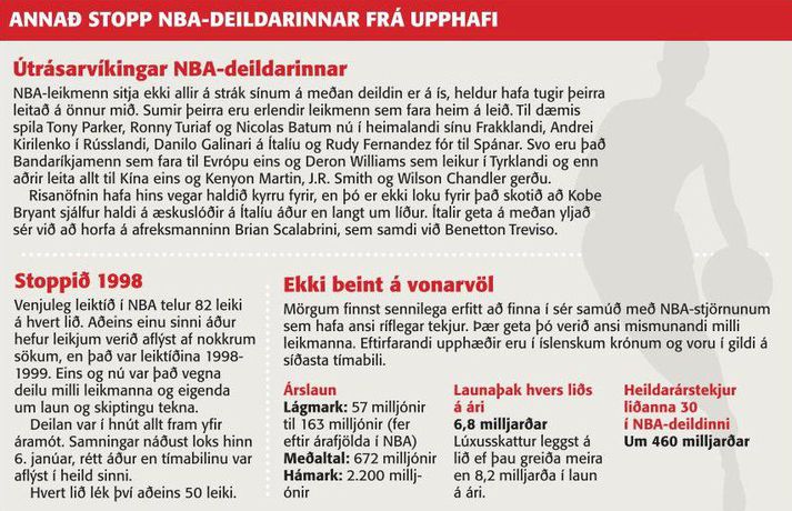 Samningar milli NBA og leikmanna hafa verið lausir frá í sumar og hart er deilt. Þegar hefur hundrað leikjum verið aflýst og ekki útséð um frekari áföll. Þorgils Jónsson kynnti sér kjaradeilu milljónamæringanna. Síðasta ár var eitt það allra besta í sögu NBA-deildarinnar, samkvæmt flestum mælikvörðum. Tekjur hafa aldrei verið meiri, sjónvarpsáhorf jókst stórum sem og aðsókn á leiki, þannig að flestir NBA-áhugamenn horfðu með tilhlökkun til komandi leiktíðar sem átti að hefjast um næstu mánaðamót. Þeir mega hins vegar bíða enn um sinn. Um fjögurra mánaða vinnustopp vegna kjaradeilu hefur lamað deildina þar sem ekki hefur einu sinni verið leyfilegt að skiptast á leikmönnum, og miðað við fullyrðingar forystusveita leikmanna og eigenda liða ber enn mikið á milli. Þegar hefur tveimur leikvikum, samtals 100 leikjum, verið aflýst og ef ekki fer að ganga saman með deiluaðilum gæti farið svo að ekki yrði leikið fyrr en eftir áramót. Í allra versta falli verður tímabilinu aflýst, en það mun þá sennilega ekki skýrast fyrr en á nýju ári. Samningar runnu út í sumar, en í mörg ár þar á undan hefur legið fyrir að þessi deila yrði gríðarhörð. Það sem helst er deilt um er annars vegar fyrirkomulag á launaþaki leikmanna og hins vegar skipting tekna sem NBA-deildin tekur inn.Launaþakið Núverandi launaþak í NBA veitir ákveðið svigrúm andstætt því sem gildir um margar aðrar stórdeildir vestra. Það þýðir að þótt launaþakið sjálft sé um 58 milljónir dala á ári fyrir hvert lið er hægt að fara upp fyrir það með ýmsum undanþágum. Þar mega lið til dæmis semja upp á nýtt við leikmann sem hefur verið hjá því í nokkur ár þótt það þýði að viðkomandi lið fari yfir hámarkið. Nú er málum þannig háttað að lið mega, strangt til tekið, greiða í laun allt að 70,3 milljónir dala á ári án þess að líða mikið fyrir það, en fari þau upp fyrir það mark er þeim gert að greiða svokallaðan lúxusskatt til deildarinnar. Fyrir hvern dal sem lið fer yfir lúxusmarkið verður það að greiða annan dal til deildarinnar, sem skiptist að mestu jafnt milli liðanna sem eru undir lúxusmarkinu. Eigendur benda á að deildin í heild sinni hafi verið rekin með 300 milljóna dala tapi á síðustu leiktíð, og þar að auki hafi langflest liðin verið rekin með tapi. Aðeins stærstu liðin, sem trekkja flesta á völlinn og fá mestar sjónvarpstekjur, hafa verið ofan við núllið. Þessa þróun vilja eigendurnir stöðva með því að herða á launaþakinu og meðal annars hækka lúxusskattinn til muna, en við það myndu launagreiðslur að sjálfsögðu lækka. Leikmennirnir eru vitanlega mótfallnir þessum hugmyndum og benda sumir á að eigendum sé í sjálfsvald sett hvort þeir sprengi sig upp úr öllu í yfirboðum í meðalleikmenn eins og oft hefur verið raunin.Skipting auðsins Seinna atriðið og sennilega það veigameira er skipting tekna deildarinnar. Tekjurnar eru margvíslegar, en fyrir utan aðgangseyri, sjónvarpstekjur og auglýsingatekjur eru talin með atriði eins og sala á veitingum og búningum, bifreiðastöðugjöld og tekjur af sýningum liðsdansara og lukkudýra annars staðar en á leikjum. Sá samningur sem er nýútrunninn var í gildi frá 2005 og kvað á um að leikmenn fengju 57 prósent af tekjum, en liðin og deildin sjálf 43 prósent. Í yfirstandandi viðræðum hafa báðir aðilar lagt áherslu á að halda 53 prósentum fyrir sig. Leikmönnum finnst þar fulllítið gert úr hlutverki sínu, en án þeirra hæfileika væri auðvitað engin deild og þar af leiðandi engar tekjur. Þarna er um stórmál að ræða þar sem hvert prósentustig jafngildir um 40 milljónum dala á mánuði.Kreppir að Fleiri atriði eru umdeild, meðal annars gildistíminn. Eigendur vilja gera tíu ára samning en leikmenn vilja gera samning til sex ára. Möguleiki er á að málamiðlun náist um uppsagnarákvæði eftir sjö ár. Flestra mat er að eigendurnir hafi sterkari stöðu þar sem stór hluti hinna 450 leikmanna NBA, þá aðallega þeir sem hafa verið í deildinni í nokkur ár á meðallaunum, eru jafn háðir mánaðarlegum launagreiðslum og hinn almenni borgari. Jafnvel telja margir sérfræðingar vestan hafs að eigendurnir séu reiðubúnir til að fórna heilu tímabili til að hafa sitt fram en það yrði reiðarslag fyrir fjárhag hundraða leikmanna.Vonarglætan dofnar Reynt var til þrautar í síðustu viku að ná samningum til að bjarga því sem bjargað yrði, og sat sáttasemjari yfir deiluaðilum á löngum fundum sem stóðu í þrjá daga. Það þótti lofa góðu en stór orð voru látin falla á fimmtudag og engar frekari viðræður hafa verið boðaðar. Allt útlit er fyrir að leikjum verði aflýst fram yfir jól, en ef allt fer á versta veg gæti þetta orðið fyrsta tímabilið í sögunni sem fellur alfarið niður. Það yrði döpur niðurstaða fyrir NBA-unnendur um heim allan.
