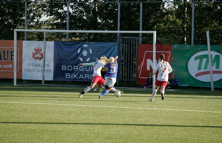 Stjarnan tryggði sér í kvöld sæti í úrslitaleik Borgunarbikars kvenna í knattspyrnu eftir 2-1 sigur á Þór/KA í framlengdum leik í Garðabænum. Stjarnan tefldi fram tveimur nýjum erlendum leikmönnum í kvöld. Kate Deines og Veronica Perez, sem voru síðast á mála hjá Seattle Sounders í Bandaríkjunum, stóðu sig vel í kvöld. „Mér líður frábærlega af þeirri ástæðu einni að við lönduðum sigri eftir þvílíka baráttu allan leikinn. Ég er stolt af okkur að hafa klárað þetta," sagði Deines í leikslok. Deines átti frábæran leik með Stjörnunni, sérstaklega í fyrri hálfleik þegar hún réð gangi mála á miðjunni. „Ég man ekki eftir því hvenær ég spilaði síðast í framlengingu þ.a. seinustu þrjátíu mínúturnar voru erfiðar. En stelpurnar voru allar orkumiklar og hjálpuðu mér í gegnum þetta," segir Deines. Hún segir þær Perez hafa leikið saman sem hálfatvinnumenn hjá Seattle Sounders FC en tímabilinu þar sé nýlokið. „Eftir að atvinnumannadeildin var lögð niður vildum við reyna fyrir okkur utan landsteinanna og því komum við hingað," segir Deines og vill meina að getustigið hjá Sounders. „Ég myndi segja að meira sé um baráttu og vinnslu hérna eins og sást í framlengingunni þar sem allar gáfu allt sem þær áttu í leikinn," sagði Bandaríkjakonan geðþekka. Daníel Rúnarsson, ljósmyndari Fréttablaðsins og Vísis, mætti í Garðabæinn í kvöld og tók þessar myndir.