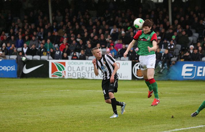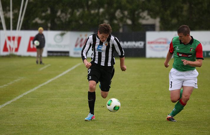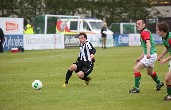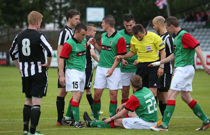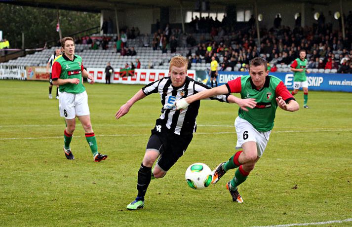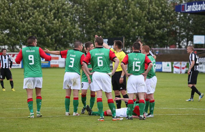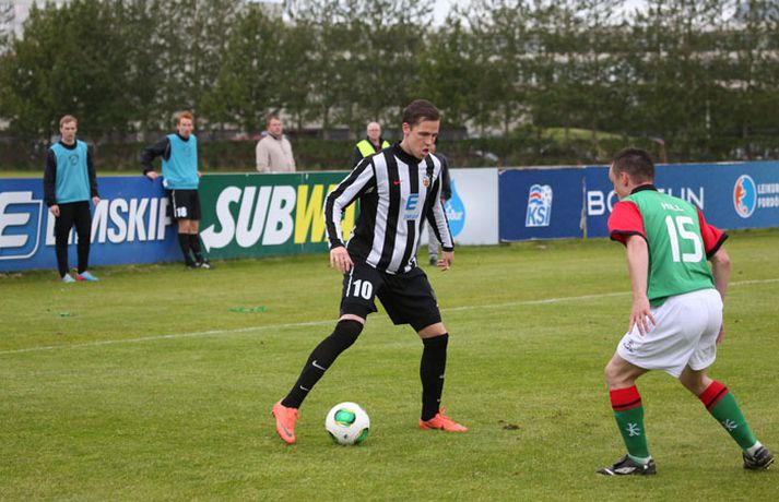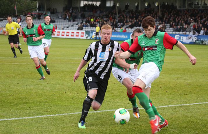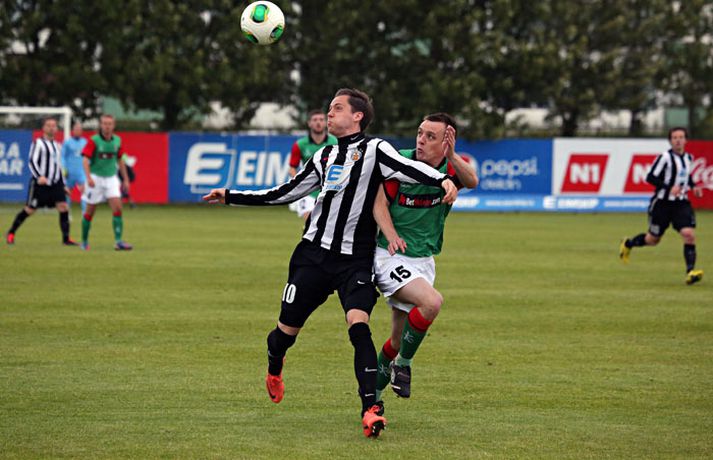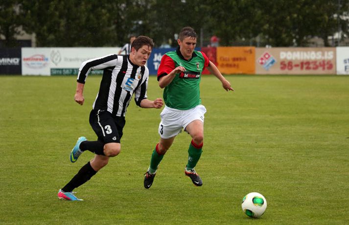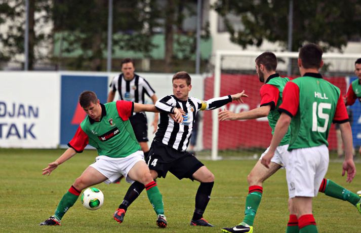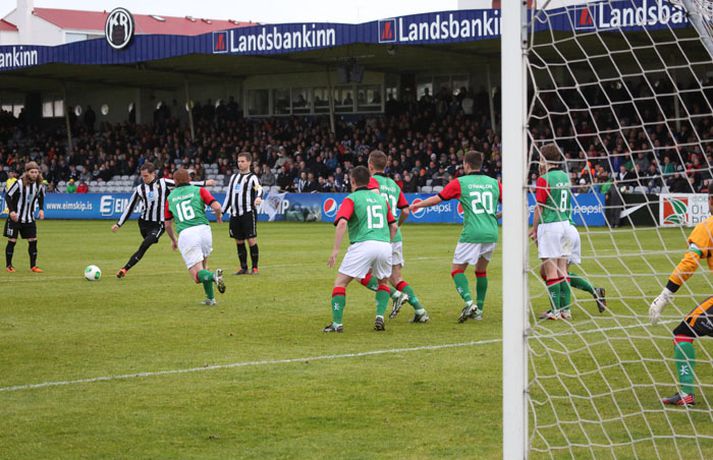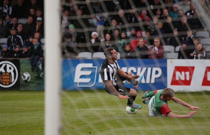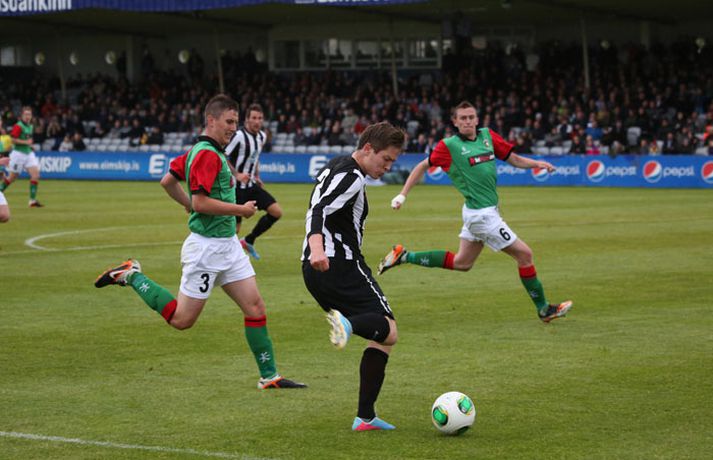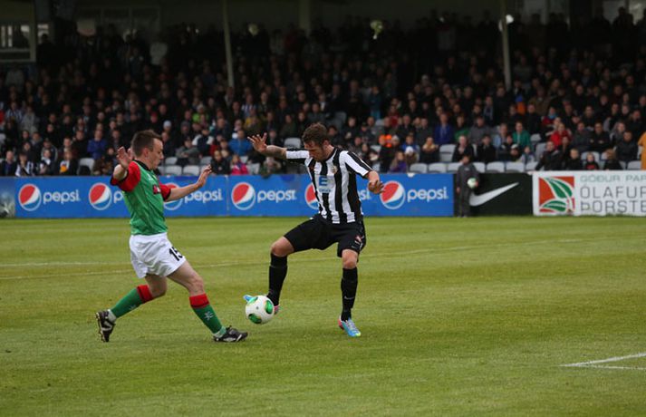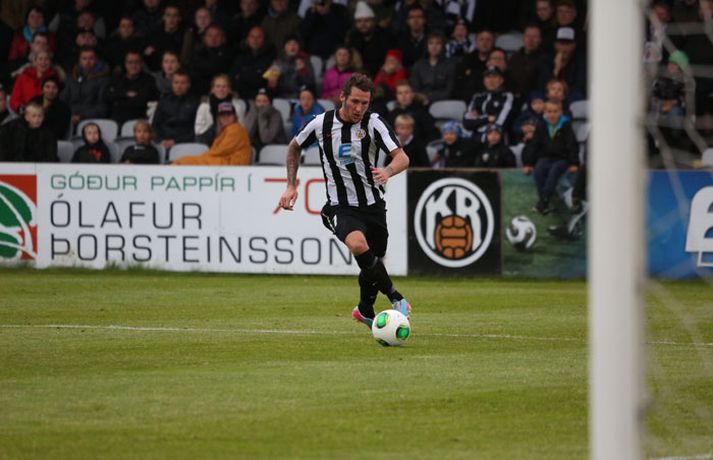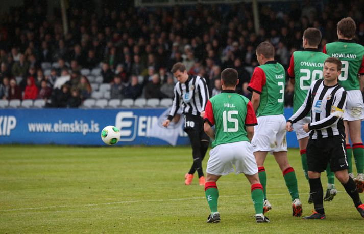 Umfjöllun, viðtöl og myndir: KR - Glentoran 0-0 Stefán Árni Pálsson á KR-velli skrifar 4. júlí 2013 11:29 KR og Glentoran gerðu markalaust jafntefli í fyrstu umferð forkeppni Evrópudeildarinnar en leikurinn fór fram á KR-velli í kvöld. Heimamenn náðu sér ekki almennilega á strik en aftur á móti voru greinilega skilaboð til leikmanna Glentoran, að tefja leikinn eins mikið og mögulegt var. Leiktafir gestanna gjörsamlega drápu allt tempó í leiknum og hann komst aldrei á flug. Daníel Rúnarsson, ljósmyndari Vísis og Fréttablaðsins, var á KR-vellinum í kvöld og tók þessar myndir hér fyrir ofan. KR-ingar byrjuðu leikinn að krafti og voru verulega ákveðnir í sínum aðgerðum. Það leit allt út fyrir að heimamenn myndu setja fyrsta markið fljótlega en gestirnir voru á öðru máli. Leikmenn Glentoran nýttu sér hvert einasta tækifæri til þess að tefja leikinn og undirritaður hefur í raun aldrei orðið vitni að öðru eins en þeir nýttu hvert innkast til að tefja leikinn og lágu um allan völl. Spiltími fyrri hálfleiksins var í raun svona 35 mínútur, ekki 45 mínútur. Gestirnir náðu með þessu að drepa allt tempó í leiknum og var staðan 0-0 í hálfleik. Í upphafi síðari hálfleiks var bara eitt lið á vellinum og KR-ingar réðu lögum og lofum á vellinum, en náðu samt sem áður ekki að setja mark sitt almennilega á leikinn og sköpuðu sér enginn hættuleg færi. Leikmenn Glentoran héldu áfram að tefja leikinn þar til að dómari leiksins fékk alveg nóg og byrjaði að spjalda fyrir það allt saman. Það er skemmst frá því að segja að leiknum lauk með 0-0 jafntefli í verulega bragðdaufum leik þar sem annað liðið var reiðubúið að spila fótbolta, hitt liðið gerði eitthvað allt annað. Síðari leikurinn fer fram í Norður-Írlandi eftir slétta viku. Þetta verða að teljast fín úrslit fyrir Glentoran. Baldur: Þetta var eins og að spila gegn liði frá Makedóníu„Það vildi bara eitt lið spila fótbolta hér í kvöld,“ sagði Baldur Sigurðsson, leikmaður KR, eftir jafnteflið í kvöld. „Það var mjög skrítið að mæta svona liði frá Norður-Írlandi og þeir spila eins og þeir séu frá Makedóníu, henda sér niður og tefja allan leikinn. Dómari leiksins tók í raun bara þátt í því með þeim og fór rétt svo að taka í taumana undir lokin.“ „Þetta fór greinilega í taugarnar á okkur, við vorum alltof æstir og náðum ekki að nýta okkur þá yfirburði sem við höfum framyfir þetta lið.“ „Þetta var allt annað lið en við mættum fyrir þremur árum. Leikurinn úti verður erfiðari og þeir hljóta að leggja þann leik töluvert öðruvísi upp.“ Hægt er að sjá myndband af viðtalinu hér að ofan. Kjartan: Komu fram við okkur eins og við værum í Real Madrid„Ég hefði kannski skilið þessa taktík frá þeim ef liðið hefði komist yfir í leiknum, en maður er bara orðlaus eftir svona leik,“ sagði Kjartan Henry Finnbogason, leikmaður KR, eftir leikinn í kvöld. „Mér fannst bara eins og þeir héldu að mótherjinn væri Real Madrid. Þeim datt ekki í hug að sækja á markið. Þetta var samt sem áður þeirra nálgun á leiknum og það tókst.“ „Þeir héldu hreinu og náðu að tefja allan leikinn. Ég held að liðið hafi tekið svona 1-2 mínútur í hvert innkast í leiknum.“ „Dómarinn tók ekki á málinu fyrir en í lokin og þá vorum við löngu orðnir vel pirraðir. Þetta hafði mikil áhrif á okkar leik og við verðum að læra af þessu í kvöld. Liðið þarf að sýna mun meiri ró í síðari leiknum og vera þolinmóðari.“ „Ég get ekki beðið eftir því að komast út í næsta leik gegn þessu liði, við erum betri.“Hægt er að sjá myndband af viðtalinu með því að ýta hér. Evrópudeild UEFA Mest lesið Bíll Shaquille O'Neal enn ófundinn Körfubolti Óskar Hrafn fer ekki fet Íslenski boltinn Epicbet sýni handboltann í leyfisleysi: „Enda ólöglegar síður“ Handbolti Hákon Rafn hélt hreinu þegar Brentford flaug áfram Enski boltinn Arteta óttast ekki að keppinautarnir steli undrabarninu frá honum Enski boltinn FH bíður með að tilkynna nýjan þjálfara Íslenski boltinn Spánn og Þýskaland mætast í úrslitum Fótbolti Dagskráin í dag: Íslenskur körfubolti í sviðsljósinu Sport Verstappen telur sig ekki geta barist um titilinn Formúla 1 Anguissa hetja meistaranna Fótbolti Fleiri fréttir Sú leikjahæsta leggur skóna á hilluna og klárar læknanámið Stuðningsmaður RB Leipzig lést á bikarleiknum í gærkvöldi Arteta óttast ekki að keppinautarnir steli undrabarninu frá honum FH bíður með að tilkynna nýjan þjálfara Óskar Hrafn fer ekki fet Spánn og Þýskaland mætast í úrslitum Anguissa hetja meistaranna Hákon Rafn hélt hreinu þegar Brentford flaug áfram Jón Dagur gulltryggði sigurinn með sínu fyrsta marki Leikið á Þróttaravelli á miðvikudag Vinícius Júnior íhugar að yfirgefa Real Madríd Kaupir sér tveggja milljarða króna hús Alexander Máni með fimm mörk í tveimur leikjum og Ísland áfram Birnir frá Akureyri í Garðabæ Klobbaði íslensku strákana og fór á flug á netmiðlum Hættir með Fram Landsliðskonur aðstoðuðu ökumenn í vanda Landsleiknum aflýst og framhaldið óljóst Segir að Slot verði að taka tvo leikmenn út úr Liverpool-liðinu Vonast til að komast í Kórinn: „Menn hafa aldrei séð annað eins“ „Alltaf gaman að fá nýjar raddir inn“ Gleðifréttir fyrir Argentínumenn: Messi vill spila á HM Stöðufundur í Laugardal klukkan 10:30 Enska úrvalsdeildin í jólaköttinn Nýi íþróttastjóri Kjartans stal mörgæs og endaði í fangelsi í Singapúr Tyrkneska sambandið segir dómara hafa veðjað á þúsundir leikja Brendan Rodgers sagði starfinu sínu lausu eftir ásakanir Segir sitt fyrrum lið í krísu Fylltu í eyð