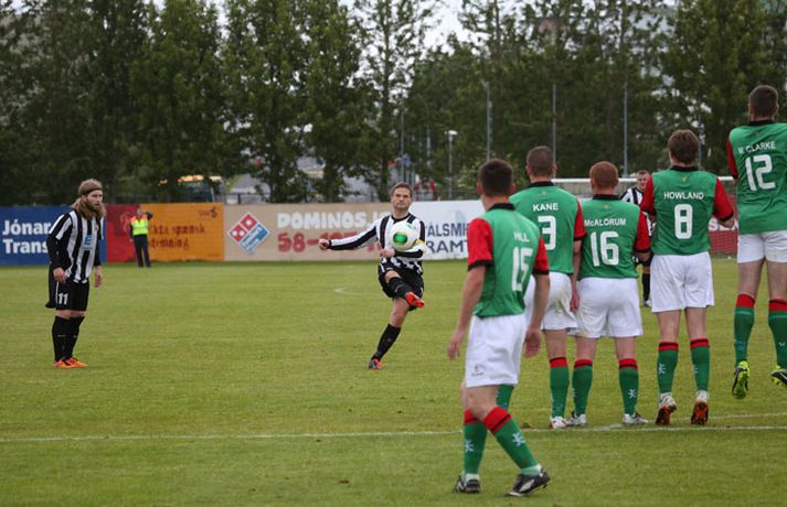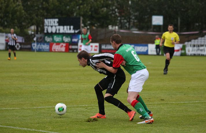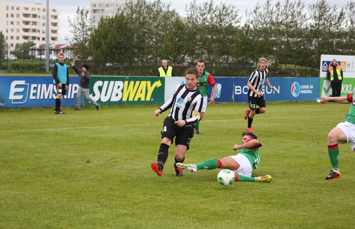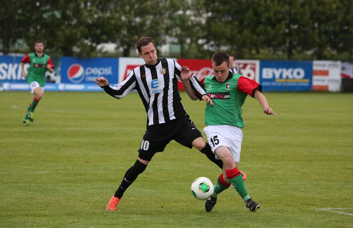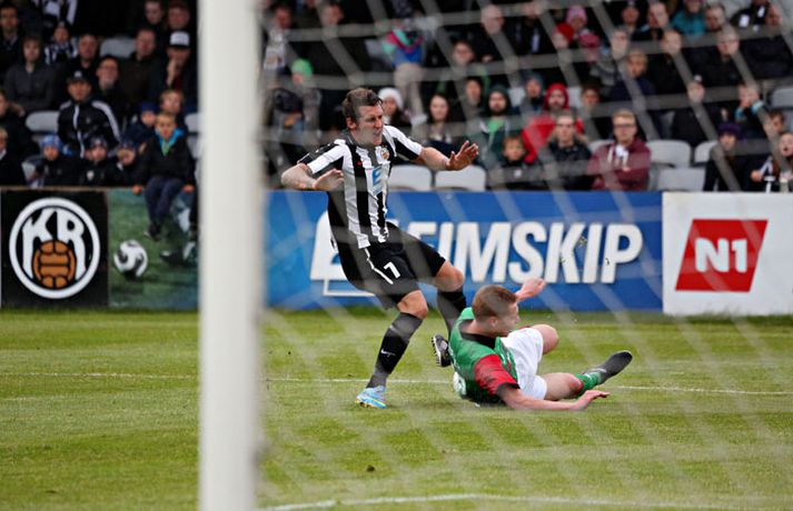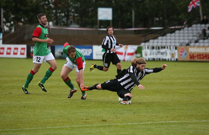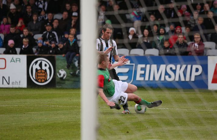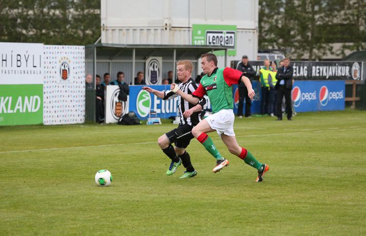 KR og Glentoran gerðu markalaust jafntefli í fyrstu umferð forkeppni Evrópudeildarinnar en leikurinn fór fram á KR-velli í kvöld. Heimamenn náðu sér ekki almennilega á strik en aftur á móti voru greinilega skilaboð til leikmanna Glentoran, að tefja leikinn eins mikið og mögulegt var. Leiktafir gestanna gjörsamlega drápu allt tempó í leiknum og hann komst aldrei á flug. Daníel Rúnarsson, ljósmyndari Vísis og Fréttablaðsins, var á KR-vellinum í kvöld og tók þessar myndir hér fyrir ofan. KR-ingar byrjuðu leikinn að krafti og voru verulega ákveðnir í sínum aðgerðum. Það leit allt út fyrir að heimamenn myndu setja fyrsta markið fljótlega en gestirnir voru á öðru máli. Leikmenn Glentoran nýttu sér hvert einasta tækifæri til þess að tefja leikinn og undirritaður hefur í raun aldrei orðið vitni að öðru eins en þeir nýttu hvert innkast til að tefja leikinn og lágu um allan völl. Spiltími fyrri hálfleiksins var í raun svona 35 mínútur, ekki 45 mínútur. Gestirnir náðu með þessu að drepa allt tempó í leiknum og var staðan 0-0 í hálfleik. Í upphafi síðari hálfleiks var bara eitt lið á vellinum og KR-ingar réðu lögum og lofum á vellinum, en náðu samt sem áður ekki að setja mark sitt almennilega á leikinn og sköpuðu sér enginn hættuleg færi. Leikmenn Glentoran héldu áfram að tefja leikinn þar til að dómari leiksins fékk alveg nóg og byrjaði að spjalda fyrir það allt saman. Það er skemmst frá því að segja að leiknum lauk með 0-0 jafntefli í verulega bragðdaufum leik þar sem annað liðið var reiðubúið að spila fótbolta, hitt liðið gerði eitthvað allt annað. Síðari leikurinn fer fram í Norður-Írlandi eftir slétta viku. Þetta verða að teljast fín úrslit fyrir Glentoran. Baldur: Þetta var eins og að spila gegn liði frá Makedóníu„Það vildi bara eitt lið spila fótbolta hér í kvöld,“ sagði Baldur Sigurðsson, leikmaður KR, eftir jafnteflið í kvöld. „Það var mjög skrítið að mæta svona liði frá Norður-Írlandi og þeir spila eins og þeir séu frá Makedóníu, henda sér niður og tefja allan leikinn. Dómari leiksins tók í raun bara þátt í því með þeim og fór rétt svo að taka í taumana undir lokin.“ „Þetta fór greinilega í taugarnar á okkur, við vorum alltof æstir og náðum ekki að nýta okkur þá yfirburði sem við höfum framyfir þetta lið.“ „Þetta var allt annað lið en við mættum fyrir þremur árum. Leikurinn úti verður erfiðari og þeir hljóta að leggja þann leik töluvert öðruvísi upp.“ Hægt er að sjá myndband af viðtalinu hér að ofan. Kjartan: Komu fram við okkur eins og við værum í Real Madrid„Ég hefði kannski skilið þessa taktík frá þeim ef liðið hefði komist yfir í leiknum, en maður er bara orðlaus eftir svona leik,“ sagði Kjartan Henry Finnbogason, leikmaður KR, eftir leikinn í kvöld. „Mér fannst bara eins og þeir héldu að mótherjinn væri Real Madrid. Þeim datt ekki í hug að sækja á markið. Þetta var samt sem áður þeirra nálgun á leiknum og það tókst.“ „Þeir héldu hreinu og náðu að tefja allan leikinn. Ég held að liðið hafi tekið svona 1-2 mínútur í hvert innkast í leiknum.“ „Dómarinn tók ekki á málinu fyrir en í lokin og þá vorum við löngu orðnir vel pirraðir. Þetta hafði mikil áhrif á okkar leik og við verðum að læra af þessu í kvöld. Liðið þarf að sýna mun meiri ró í síðari leiknum og vera þolinmóðari.“ „Ég get ekki beðið eftir því að komast út í næsta leik gegn þessu liði, við erum betri.“Hægt er að sjá myndband af viðtalinu með því að ýta hér.