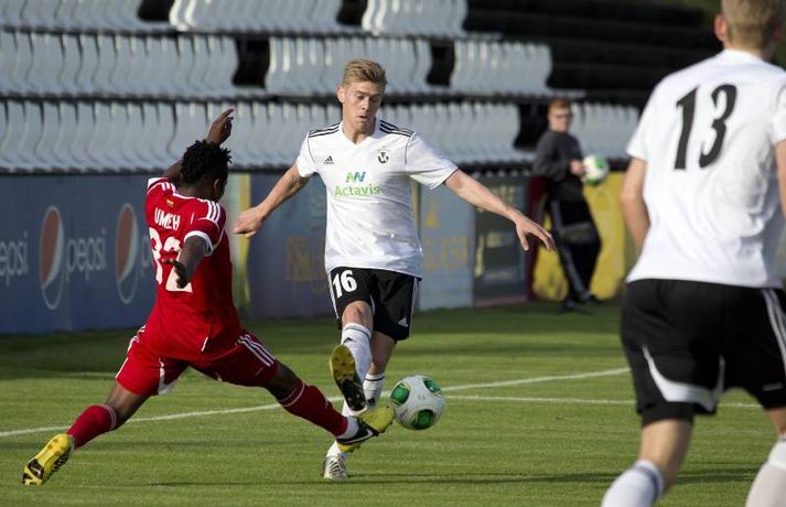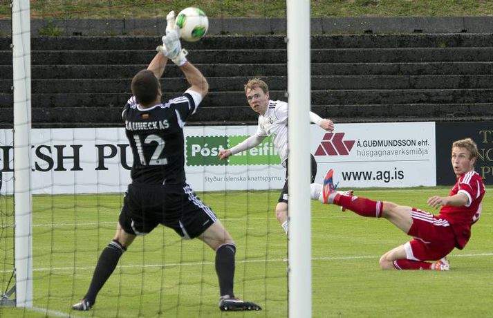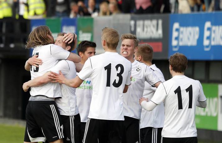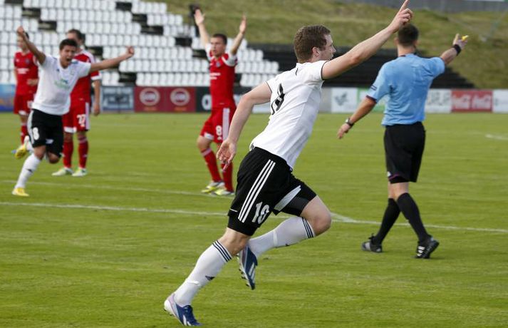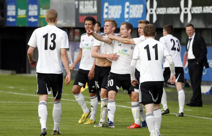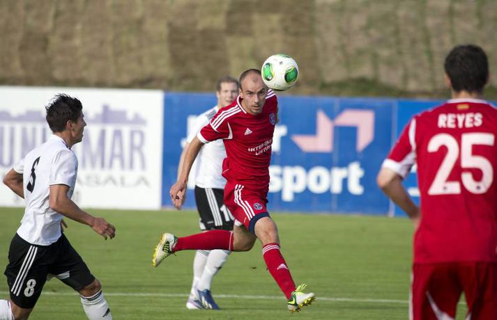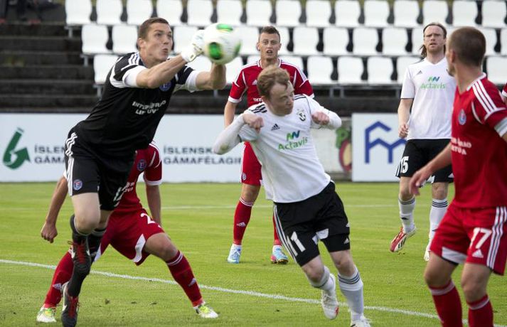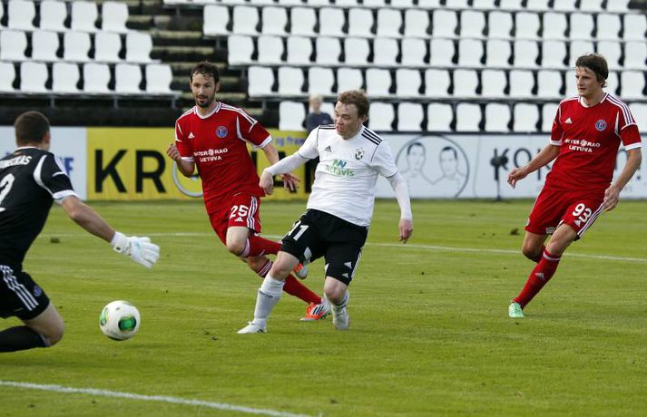 Umfjöllun og viðtöl: FH - Ekranas 2-1 Kristinn Páll Teitsson í Kaplakrika skrifar 23. júlí 2013 17:18 FH-ingar tryggðu sig áfram í undankeppnini í Meistaradeildinni með 2-1 sigri á FK Ekranas í kvöld og mæta Austria frá Vín í næstu umferð. Sigurinn í kvöld var verðskuldaður og gáfu FH-ingar fá færi á sér í leiknum. Fyrri leikur liðanna sem fór fram í Litháen í síðustu viku lauk með 1-0 sigri FH-inga og tóku þeir því vænlega stöðu inn í leikinn í kvöld. Bæði lið fóru varfærnislega inn í leikinn og gáfu fá færi á sér. Fyrsta mark leiksins kom eftir að liðin færðu sig aðeins framar á völlinn, fyrirgjöf kom inn af hægri kanti og Pétur Viðarsson braut á Egidijus Varnas. Arsenij Buinickij steig á vítapunktinn og skoraði örugglega framhjá Róberti og jafnaði einvígið. Heimamenn fóru beint í sókn og fengu nokkur ákjósanleg færi en Tadas Kauneckas í marki Ekranas var í miklu stuði. Jöfnunarmark FH-inga kom loks rúmlega tíu mínútum eftir marki gestanna. Eftir hornspyrnu sendi Sam Tillen fyrirgjöf sem Guðmann Þórisson fleytti á Björn Daníel og náði hann að pota boltanum í netið framhjá markmanni Ekranas. Þetta var það síðasta markverða sem gerðist í fyrri hálfleik og gengu liðin jöfn inn í búningsklefanna. Möguleikar Ekranas minnkuðu verulega þegar Oscar Reyes, miðvörður þeirra reif niður Atla Viðar sem var sloppinn einn í gegn. Ivan Kruzliak, dómari leiksins hafði úr engu öðru að velja en að vísa Reyes af velli og voru FH-ingar því manni fleiri í rúmlega hálftíma. Heimamönnum gekk þó illa að skapa færi og var það ekki fyrr en á lokamínútunum sem vörn Ekranas fór að opnast. Fyrst fékk Kristján Gauti sannkallað dauðafæri til að klára einvígið en skot hans fór framhjá fyrir tómu marki. Á lokamínútu leiksins lögðu gestirnir allt í sölurnar og fór Tadas í sóknina í aukaspyrnu sem Ekranas fékk. Úr aukaspyrnunni varði Róbert skot frá Vitalijus Kavaliauskas og var fljótur að finna Atla Viðar aleinan á vallarhelmingi Ekranas og rak hann boltann í netið. Markið gerði út um leikinn og flautaði góður dómari leiksins leikinn af stuttu síðar. Gríðarlega sterkur sigur hjá heimamönnum sem eru komnir í þriðju umferð undankeppninnar. Þar mæta þeir Austria frá Vín og verður það verkefni erfitt en jafnframt spennandi. Sigurinn tryggir þeim 22 milljónir fyrir áframhaldandi þátttöku ásamt því að gefa þeim fjóra auka leiki. Tapi þeir gegn Austria fara þeir í Evrópudeildar undankeppnina en með sigri fara þeir í umspil um sæti í Meistaradeildinni. Heimir: Skipti mér ekkert af fjármálunum„Ég er gríðarlega ánægður, mér fannst við spila vel nánast allan leikinn. Það kom stuttur kafli í fyrri hálfleik þar sem við dettum aðeins niður en við löguðum það í seinni hálfleik,“ sagði Heimir Guðjónsson, þjálfari FH eftir leikinn. „Mér fannst þetta sanngjarn sigur og flottur leikur af hálfu FH. Mér fannst við fá góð færi í leiknum og klaufar að nýta ekki færin þegar leið á leikinn. Í stöðunni 2-1 þurfa þeir tvö mörk og það hefði farið betur um mann, það þarf ekki mikið að gerast í stöðunni 1-1,“ Gestirnir misstu mann af velli í upphafi seinni hálfleiks og gerði það FH-ingum auðveldara fyrir. „Það er auðvitað betra að vera einum fleiri en mér fannst við ráða betur við þá strax í upphafi seinni hálfleiks. Við fórum að halda bolta betur innan liðsins og þegar við komumst framhjá fyrstu pressunni þeirra fengum við oft fína möguleika sem við náðum ekki að nýta okkur nógu vel,“ Eftir að hafa lent undir voru FH-ingar fljótir að svara. „Við höfum sýnt karakter í þessum leikjum, við sýndum frábæran karakter úti að vinna 1-0 þótt þeir hafi átt nokkur góð færi. Við töluðum um það fyrir leikinn að halda leikskipulagi og það gekk upp í kvöld,“ Í stöðunni 1-1 setti Heimir Atla Viðar inná fyrir Pétur Viðars, sóknarsinnuð skipting þrátt fyrir að leiða í einvíginu. Það átti aldeilis eftir að borga sig, Atli veiddi Oscar Reyes útaf og skoraði svo að lokum sigurmarkið. „Pétur meiddist og við þurftum að bregðast við því. Mér fannst ekki rétt að setja inn fleiri varnarsinnaða menn og Atli kom flottur inn. Hann setti tvö á móti Keflavík og er oft heitur hérna í krikanum. Hann stóð sig mjög vel í kvöld,“ Með sigrinum fer FH áfram í þriðju umferð undankeppninnar sem þýðir að það eru allaveganna fjórir leikir í viðbót og meiri tekjur í kassann. „Þetta er gríðarlega mikilvægt fótboltalega séð, ég veit ekkert um fjármálin og skipti mér ekkert af þeim. Við fáum fjóra leiki í viðbót og við erum með góða blöndu leikmanna sem fær dýrmæta reynslu að fá allavegana sex leiki í Evrópukeppni,“ sagði Heimir. Arvydas: Svekkjandi að detta út á þessu stigi„Ég er auðvitað vonsvikinn, þegar þú dettur út á þessu stigi í þessari keppni er það alltaf svekkjandi. Ef horft er á báða leikina fannst mér við eiga meira skilið,“ sagði Arvydas Skrupskis, þjálfari Ekranas eftir leikinn. „Svona er fótbolti og íþróttir. Stundum komast liðin sem eiga það skilið ekki áfram. Ef við hefðum náð öðrum úrslitum í fyrri leiknum hefðum við komið allt öðruvísi inn í þennan leik og hann hefði spilast öðruvísi. Við klúðruðum færum úti og við þurftum að sækja í kvöld,“ Þrátt fyrir að hafa klúðrað fjölda færa í fyrri leiknum fannst Arvydas einvígið tapast í kvöld. „Við töpuðum einvíginu hérna í kvöld, við byrjuðum leikinn mjög vel og spiluðum hann eins og við vildum. Í seinni hálfleik þegar staðan er 1-1 missum við mann af velli og það skipti sköpum. FH-ingar hefðu farið að detta aftar á völlin á lokamínutu