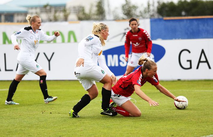 Valskonur upp í annað sætið eftir sigur á Blikum | Myndir Óskar Ófeigur Jónsson skrifar 8. ágúst 2013 17:15 Mynd/Arnþór Valskonur eru komnar upp í annað sætið í Pepsi-deild kvenna eftir 2-1 sigur á Breiðabliki á Vodafone-vellinum í kvöld en leikurinn var í 11. umferð deildarinnar. Arnþór Birkisson, ljósmyndari Vísis og Fréttablaðsins, var á leiknum og náði þessum skemmtilegu myndum sem má finna hér fyrir ofan. Blikakonur voru sjálfum sér verstar í þessum leik á Hlíðarenda því þær klúðruðu víti í stöðunni 0-0 og skoruðu síðan tvö sjálfsmörk með fjögurra mínútna millibili um miðjan seinni hálfleik. Valskonur hafa nú unnið sex deildarleiki í röð og þessi sigur dugðaði til að taka annað sætið af Blikum. Þórdís María Aikman varði víti frá Rakel Hönnudóttur á 54. mínútu leiksins og skömmu síðar hafnaði boltinn í slá Valsmarksins áður en Edda Garðarsdóttir náði að bjarga á marklínunni. Ragna Björg Einarsdóttir skoraði fyrra sjálfsmark Blika á 66. mínútu þegar hún stýrði inn skoti Dóru Maríu Lárusdóttur sem var að stefna framhjá. Seinna sjálfsmarkið skoraði Lilja Dögg Valþórsdóttir á 70. mínútu en hún setti þá aukaspyrnu Eddu Garðadóttur í eigið mark eftir pressu frá Elínu Mettu Jensen. Elín Metta fagnaði en boltinn fór af Lilju Dögg og í markið. Greta Mjöll Samúelsdóttir náði að laga stöðuna undir lokin þegar hún skoraði beint úr hornspyrnu. Pepsi Max-deild kvenna Mest lesið Umboðsmaður hótaði leikmanni með byssu Fótbolti Söguleg byrjun OKC á tímabilinu Körfubolti Emilía opnaði markareikninginn gegn Ingibjörgu Fótbolti O'Neil tekur ekki við Úlfunum á ný Fótbolti Yfirburðir Sunderland dugðu ekki til sigurs Enski boltinn Alfreð klæddist kvennatreyjunni á leiknum við Ísland Handbolti „Ísland í hópi með Norður-Kóreu og Íran“ Sport Spence og van de Ven báðust afsökunar Fótbolti „Búnt á skenkinn, Halli Egils á vegginn“ Sport Fyrsti sigur í hús hjá Genoa Fótbolti Fleiri fréttir Fanndís hefur ekkert heyrt frá Val og íhugar að hætta „Það verður hundleiðinlegt að spila við Val“ Hermann tekinn við Val Fóru nýja leið í ár og auglýstu eftir þjálfara: Tommy Nielsen ráðinn Pablo og Óskar Örn inn í þjálfarateymi Hauka FH-ingar kveðja Kjartan Henry Tölur úr Bestu: Bjartur Bjarmi fór í flestar tæklingar af öllum Gísli semur við Skagamenn Óskar Smári tekur við Stjörnunni Bretinn ráðinn tæknilegur ráðgjafi hjá Val Fram þvertekur fyrir metnaðarleysi og leitar að nýjum þjálfurum Tölur úr Bestu: Hallgrímur Mar bjó til langflest færi „Mjög sáttur með samninginn“ „Hefði séð eftir því alla ævi“ Magnús Már í viðræðum við HK Uppgjörið: Ísland - Norður-Írland 3-0 | Áfram hluti af elítunni Tölur úr Bestu 2025: Klúðraði langflestum dauðafærum í sumar FH bíður með að tilkynna nýjan þjálfara Óskar Hrafn fer ekki fet Birnir frá Akureyri í Garðabæ Hættir með Fram Heimir kynntur til leiks í Árbænum Túfa rekinn frá Val Leyndarmáli ljóstrað upp þegar Heimir og Björn kvöddu Leikmenn kusu Patrick og Guðmund Sjáðu bananabombu Antons Loga og önnur síðustu mörk tímabilsins Uppgjörið: Stjarnan - Breiðablik 2-3 | Stjarnan í Evrópu þrátt fyrir tap „Held að ég geti ekki gert mikið meira“ Uppgjörið: Vestri - KR 1-5 | KR bjargaði sér og sendi Vestra í Lengjudeildina Uppgjörið: ÍA - Afturelding 1-0 | Afturelding staldraði stutt við í efstu deild Sjá meira