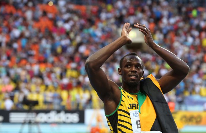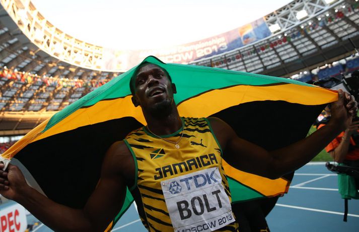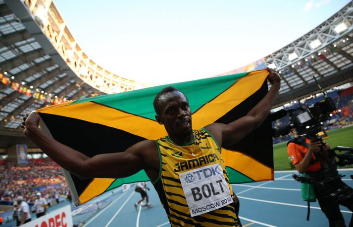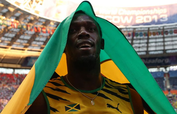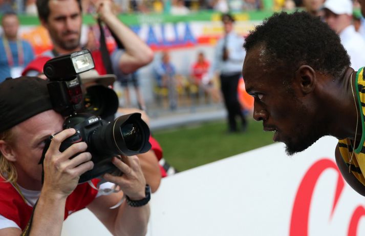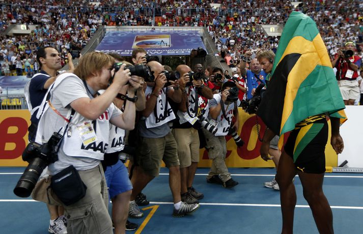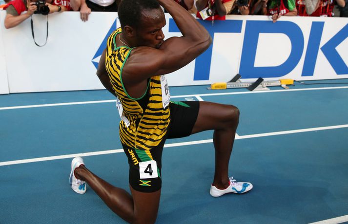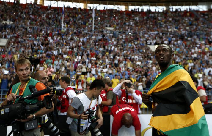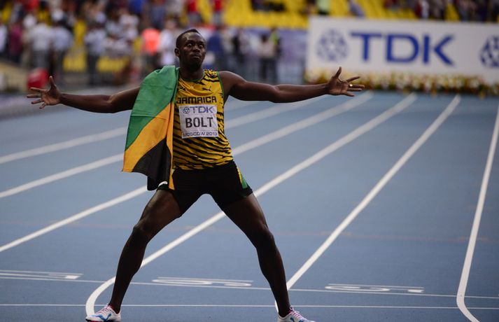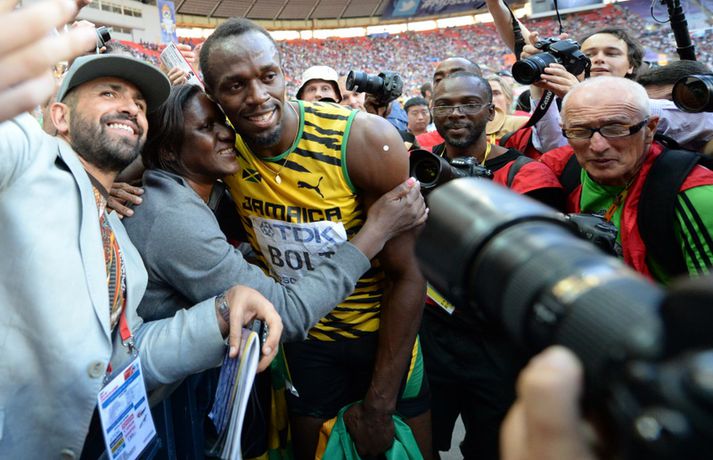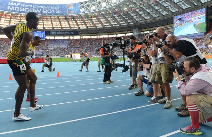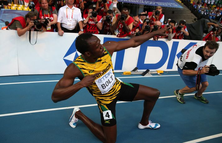 Usain Bolt var heldur betur í essinu sínu á Luzhniki leikvanginum í Moskvu í dag þegar hann tryggði sér Heimsmeistaratitilinn í 200 metra hlaupi. Bolt vann öruggan sigur og vann því bæði 100 og 200 metra hlaupið eins og á síðustu Ólympíuleikum í London. Sýningin hjá Usain Bolt var hvergi nærri búin þegar hann var búinn að vinna hlaupið örugglega því áhorfendur höfðu ekki síður gaman af því þegar hann fagnað gullinu með öllum sínum stælum og stuðvenjum enda á ferðinni maður sem elskar sviðsljósið. Hér fyrir ofan má sjá myndir af fagnaðarlátum sem ljósmyndarar AFP-fréttastofunnar tóku af fagnaðarlátum Usain Bolt í dag. Hann var einnig afar sáttur með gullið sitt heldur einnig þá staðreynd að landi hans Warren Weir tók silfrið.