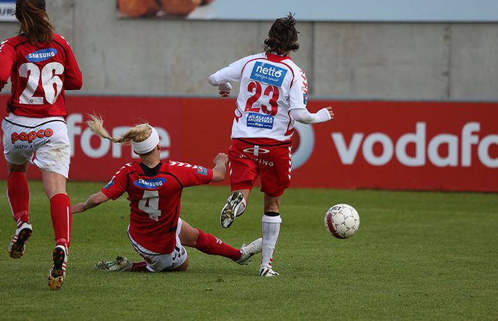 Norðanstúlkur úr Þór/KA gáfu liði Stjörnunnar tækifæri á því að komast enn nærri Íslandsmeistaratitli kvenna í fótbolta í kvöld þegar norðanliðið stöðvaði sigurgöngu Vals í markalausu jafntefli á Vodafone-vellinum í kvöld. Stjarnan getur því náð tólf stiga forskoti með sigri á HK/Víkingi seinna í kvöld. Daníel Rúnarsson, ljósmyndari Fréttablaðsins og Vísis, var á leiknum í kvöld og náði þessum skemmtilegu myndum hér fyrir ofan. Valskonur voru búnar að vinna sjö deildarleiki í röð og alla þrjá leiki sína síðan að Edda Garðarsdóttir og Ólína Guðbjörg Viðarsdóttir fóru að leika með liðinu. Valsliðið fékk fjölda færa til að tryggja sér sigurinn í leiknum í dag en fóru illa með mörg frábær marktækifæri. Edda skoraði í fyrri hálfleik en var dæmd brotlega og því var markið dæmt af. Ólína Guðbjörg Viðarsdóttir fékk fín færi til að skora eins og fleiri leikmenn Valsliðsins en markið leit ekki dagsins ljós. Elín Metta Jensen, markhæsti leikmaður Valsliðsins, sofnar væntanlega seint í nótt, enda átti hún hiklaust að skora nokkur í þessum leik. Þetta var síðasti leikur liðs Þór/KA fyrir bikarúrslitaleikinn á móti Breiðabliki sem fer fram um næstu helgi. Mateja Zver gat stolið sigrinum í lokin þegar hún átti skot í slá.Mynd/Daníel