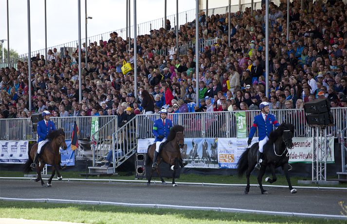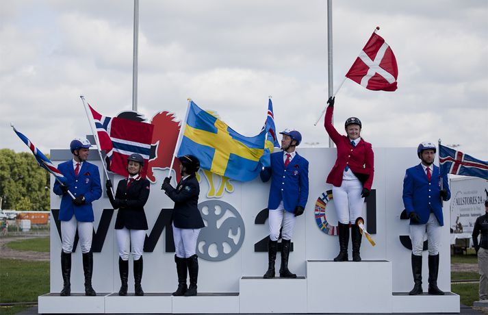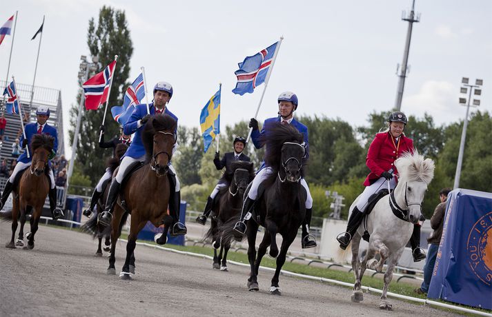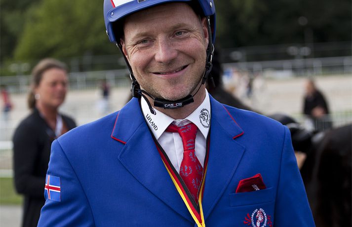 Jakob Svavar Sigurðsson og Alur frá Lundum II höfnuðu í öðru sæti í slaktaumatölti á heimsmeistaramóti íslenska hestsins í Berlín í morgun. Jakob og Alur fóru efstir inn í úrslitin eftir forkeppnina en urðu að sætta sig við annað sætið með 8,59 í einkunn. Hin danska Julie Christiansen á Straumi frá Seljabrekku hafði betur með 8,63. Viðar Ingólfsson á Hrannari frá Skyggni lönduðu bronsinu með 8,46 í einkunn. Í fimmta sæti höfnuðu Eyjólfur Þorsteinsson og Kraftur frá Efri-Þverá með 7,54. Rut Sigurðardóttir, ljósmyndari Fréttablaðsins og Vísis í Berlín, fylgdist með gangi mála í slaktaumatöltinu í morgun.