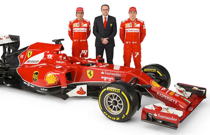 Ferrari kynnti nýja bílinn sinn Kolbeinn Tumi Daðason skrifar 25. janúar 2014 22:15 Alonso og Raikkonen við nýja bílinn. Mynd/Ferrari Fernando Alonso og Kimi Raikkonen voru að sjálfsögðu rauðklæddir þegar ítalski risinn Ferrari kynnti F14 T bílinn sem kapparnir munu notast við á tímabilinu sem senn fer í hönd. Bíllinn sem sá sextándi sem Ferrari smíðar til keppni í Formúlu 1 en hann hefur verið í hönnun undanfarin tvö ár. Kosning um nafn á bílinn fór fram á heimasíðu félagsins. Nýi bíllinn er með 1,6 lítra túrbó V6 vél og með nýtt nef í takt við breytingar á reglum keppninnar. McLaren kynnti einmitt nýjan bíl sinn í gær með öðruvísi útfærslu á nefinu. Nýju reglurnar miða að því að auka öryggi ökuþóra. Illa hefur gengið hjá Ferrari undanfarin ár. Alonso hefur mátt sætta sig við að hafna þrívegis í öðru sæti og einu sinni í fjórða sæti á árum sínum fjórum hjá Ferrari. Hann tók sæti Raikkonen árið 2010 en Finninn er nú mættur aftur í herbúðir ítalska félagsins.Hér má sjá myndband sem Ferrari sendi frá sér í tilefni dagsins. Það er skyggnst á bak við tjöldin í hönnunarferli nýja ökutækisins. Formúla Mest lesið Kærastan tók eftir því að eitthvað var að Handbolti Vara við því að „töfradrykkur“ Haaland geti valdið matareitrun Enski boltinn Tóku símana af stelpunum alla keppnisferðina Golf Engin klipping á næstunni: Miður sín en með augun á 8. desember Enski boltinn Eins og á gamlárskvöldi á Íslandi inni á leikvanginum Fótbolti Er Tóti Túrbó ofmetinn? Körfubolti Sjáðu brot af því besta úr enska boltanum í dag Fótbolti Ótrúleg varnartölfræði Arsenal í október Fótbolti Magic Johnson bætir við enn einum titlinum Sport Skoraði fyrsta markið sama dag og hann flutti í þriðja sinn á þremur mánuðum Fótbolti Fleiri fréttir Verstappen telur sig ekki geta barist um titilinn Hlupu inn á Formúlu 1-brautina: „Ég hefði getað drepið þá“ Yfirburðir Norris sem er kominn á toppinn Norris á ráspól og forysta Piastri í hættu Grunur um nauðgun á heimili Schumachers Segir að formúlu 1 vanti nú illmenni Russell fyrstur í mark í Singapúr og McLaren tryggði sigur bílasmiða George Russell á ráspól í Singapúr Hringt í flesta eigendur í Formúlu 1 eftir brottreksturinn frá Red Bull Sjá meira