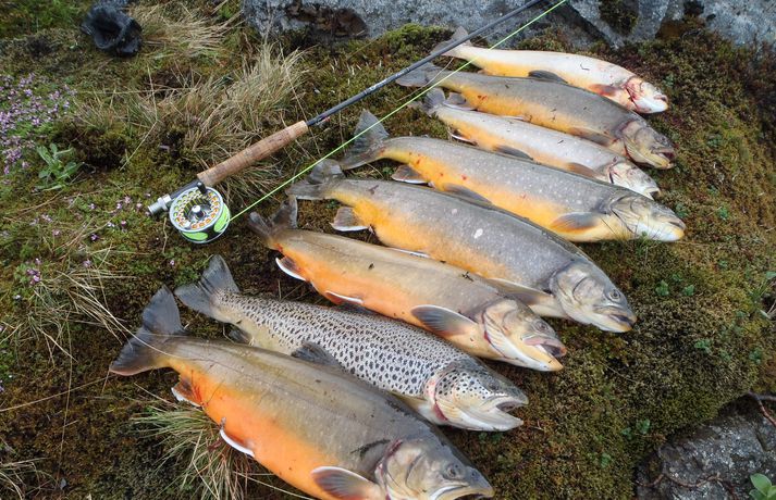 Stórbleikjur á Arnarvatnsheiði Karl Lúðvíksson skrifar 14. júlí 2014 19:51 Það berast reglulega fréttir af stórum urriðum sem veiðast á Arnarvatnsheiði en þar á heiðinni er líka að stórar bleikjur. Það sækja margir veiðimenn í vötnin á Arnarvatnsheiðinni enda er það ekki skrítið þegar aflabrögðin eru skoðuð og stærðin á þeim fiskum sem þarna veiðist kemur í ljós. Einn af þeim sem þekkir þetta svæði vel er Tómas Skúlason, oftast kenndur við Veiðiportið, en hann var þarna við veiðar fyrir skemmstu og sendi okkur þennan pistil af ferðinni. Á meðfylgjandi myndum sést vel að þarna í hálendisvötnunum leynist stór og falleg bleikja sem er einhver besti matfiskur sem finnst.Ég var með góðann hóp af miklum veiðimönnum frá Tékklandi og Póllandi á Arnarvatnsheiðinni í byrjun sumars og þó það hafi verið skýjað og úrkoma allann tímann þá létu þessi kappar það ekkert á sig fá. Ræs var um kl. 6 á morgnanna og hent var á pönnu ca 24 eggjum, beikoni, graslaukur og borið fram með brauði og heitu te. Allt var klárað því heitur matur var ekki aftur á boðstólnum fyrr en eftir 16 klst.Ég hef sjaldan séð álíka úthald eins og hjá þessum mönnum. Við fórum víða um heiðina en best var þá við stóra lón en þar komu fiskar sem losuðu 6 pund 60 cm og stærra. Arnarvatn litla gaf okkur fallegar bleikjur og var Langskeggurinn klárlega besta flugan . Með í hópnum var meðal annars læknir og dýralæknir og gert var grín af þvi að þegar læknirinn gæti ekki gert meira fyrir menn og menn komnir á fjórar lappir vegna þreytu þá fengi dýralæknirinn að taka við. Síðasta daginn var haldið á nýjar slóðir og ákvað ég að reyna nýtt vatn sem ég hafði aldrei veitt í áður. Eftir að hafa verið 2 klst gangi frá vaði voru mínir menn orðnir ansi lúnir og vildu ekki fara lengra enda búnir að vera veiða sjö daga í röð og þar af fjórir sem voru fjórtánda daginn í röð að veiða. Ég lofaði þeim stærri fiskum og mikið af þeim sem var nú reyndar loforð út í bláinn en sem betur fer þá var hún þessi blessaða veiðigyðja sem við veiðimenn viljum svo oft hafa með okkur heldur betur í stuði.Fyrsti fiskurinn var 5 punda bleikja svo kom 6 punda og svo kom 7 punda bleikja ! þetta var rosalegt, allir voru í fiski og þvílikar kusur, flestar á bilinu 3 – 6 pund og svoleiðis spikfeitar að annað eins hef ég bara ekki séð á heiðinni. Bleik og blá var undir hjá mér og einnig voru litlir nobblerar að virka vel. Við hættum að veiða þegar kassi númer 2 var fullur enda allir komnir með nóg og frábært að enda túrinn með allt að 7 punda bleikjum. Stangveiði Mest lesið Norðurá - hámarkstalan liggur fyrir Veiði Minni laxveiði en 2014 Veiði Fyrsta Sportveiðiblað ársins komið út Veiði Þegar örflugurnar gefa best Veiði Vænar bleikjur farnar að taka flugurnar í Þingvallavatni Veiði Styttist í 100 laxa daga í Eystri Rangá Veiði Ekkert aktu taktu gluggaskytterí Veiði Haustveiðin góð í Ytri Rangá Veiði Tarantino tók maríulaxinn í Hítará Veiði Umhverfisslys við Ytri Rangá Veiði