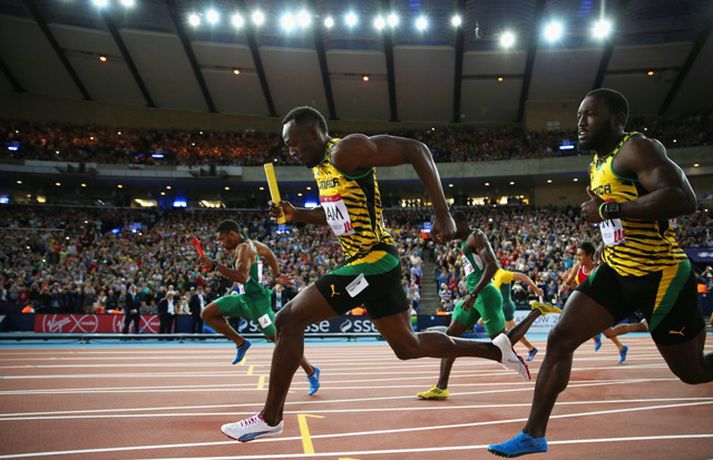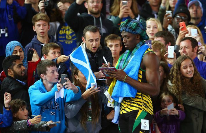 Bolt bætti enn einu gullinu í safnið | Myndir Ingvi Þór Sæmundsson skrifar 3. ágúst 2014 11:00 Bolt kemur í mark. Vísir/Getty Spretthlauparinn Usian Bolt bætti enn einni rósinni í hnappagatið þegar hann vann til gullverðlauna í 4x100m boðhlaupi á Samveldisleikunum í Glasgow í gær. Sveit Jamaíka sem samanstóð, auk Bolt, af Kemar Baily-Cole, Nickel Ashmeade og Jason Livermore, kom í mark á tímanum 37,58 sekúndum, sem er met á Samveldisleikunum. Sveit Englands lenti í öðru sæti og sveit Trínidad og Tóbagó í því þriðja. Bolt er að komast aftur á skrið eftir hnémeiðsli sem hann varð fyrir í mars, en aðeins eru sex vikur síðan Jamaíkamaðurinn byrjaði að æfa aftur. Eftir hlaupið skokkaði Bolt sigurhring og gaf sér tíma fyrir myndatökur, eiginhandaáritanir og spjall við áhorfendur. Bolt hefur unnið til sex gullverðlauna á Ólympíuleikum og átta gullverðlauna á heimsmeistaramótum. Hann er heimsmethafi í 100m, 200m og 4x100m hlaupi. Frjálsar íþróttir Mest lesið Bíll Shaquille O'Neal enn ófundinn Körfubolti Einkunnir Íslands: Þrjár heitastar í frostinu Fótbolti Líður alltaf yfir hana þegar hún kemur í mark Sport Uppgjörið: Þýskaland - Ísland 42-31 | Þrot í Þýskalandi Handbolti Uppgjörið: Ísland - Norður-Írland 3-0 | Áfram hluti af elítunni Íslenski boltinn „Hefði séð eftir því alla ævi“ Íslenski boltinn „Mjög sáttur með samninginn“ Íslenski boltinn „Hann ætti bara að skrifa afsökunarbiblíuna“ Körfubolti Scholes hættir og setur einhverfan son sinn í fyrsta sætið Enski boltinn Fluttu fréttir af snjónum í Reykjavík Fótbolti Fleiri fréttir Hetja Englands á EM sleit krossband Lofar frekari fjárfestingum Haukur Helgi: Höfum ekki verið að spila góðan körfubolta „Getum verið fjandi góðir“ Uppgjörið: Álftanes-Njarðvík 93-92 | Heitur Haukur var hetjan á Álftanesinu Uppgjörið: Keflavík - Þór Þ. 86-82 | Þarf ekki alltaf að vera fallegt ef það virkar „Varnarleikur snýst eiginlega bara um að nenna“ Uppgjörið: Valur - Grindavík 55-90 | Taplausir Grindvíkingar kjöldrógu Val ÍR áfram eftir sigur í Mosfellsbæ „Búnir að sýna hvað við getum verið lélegir“ KR - ÍA 109-75 | KR-ingar sýndu allar sínar bestu hliðar þegar þeir burstuðu Skagamenn Uppgjörið: Þýskaland - Ísland 42-31 | Þrot í Þýskalandi Juventus ræður Spalletti út tímabilið Tilkynnti um óléttu og nýjan samning á sama tíma Meistaradeildin skiptir um bjór og Heineken snýr sér að padel Aron Einar kominn á toppinn Patrekur hættur eftir dapurt gengi Stjörnunnar Tölur úr Bestu: Hallgrímur Mar bjó til langflest færi Íslandsmeistararnir frá því fyrir sextíu árum heiðursgestir í kvöld Góðvinur þáttarins meiddist illa og menn áttu erfitt með að horfa Hljóp hálft maraþon í Crocs og drakk úr skónum Fantasýn: „Þessi vörn er eitthvað skrímsli“ Scholes hættir og setur einhverfan son sinn í fyrsta sætið Rúmar tvær milljónir í boði ef þú finnur hundinn hans Aarons Ramsey Carrick í einkaviðtali: Sigurinn á Anfield stór stund fyrir Man. Utd Hefur spilað 16 mínútur og fengið tvö rauð spjöld Bættu Evrópumet AC Milan liðsins með Gullit og Van Basten innanborðs Slot: Engin auka pressa við þetta tap Real Madrid vill stórar skaðabætur frá UEFA „Hann ætti bara að skrifa afsökunarbiblíuna“ Sjá meira
