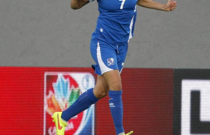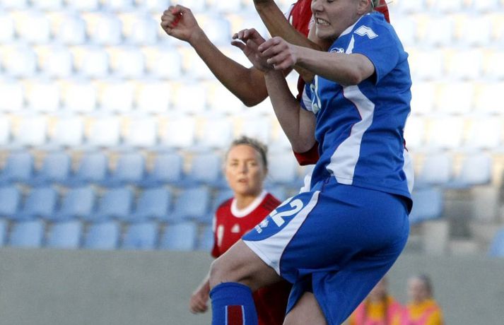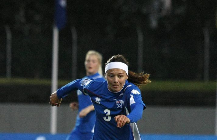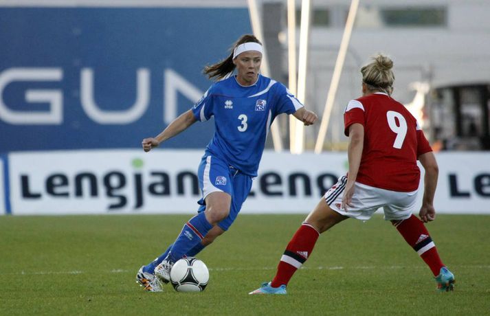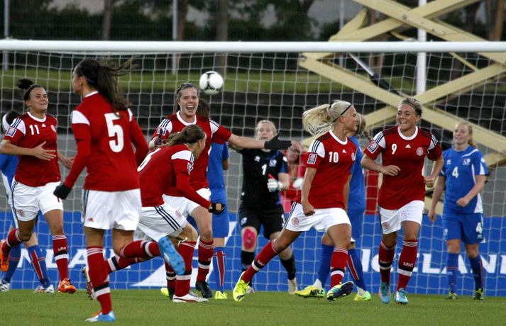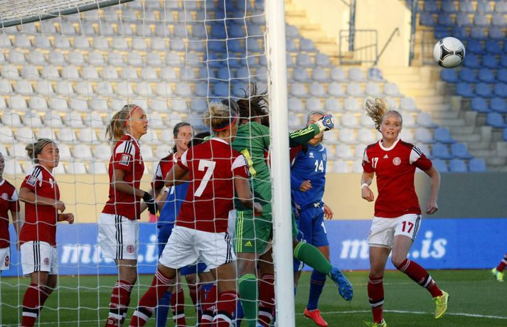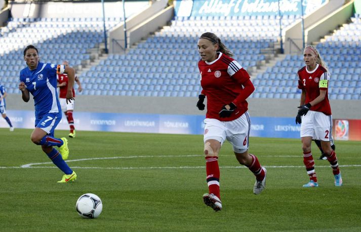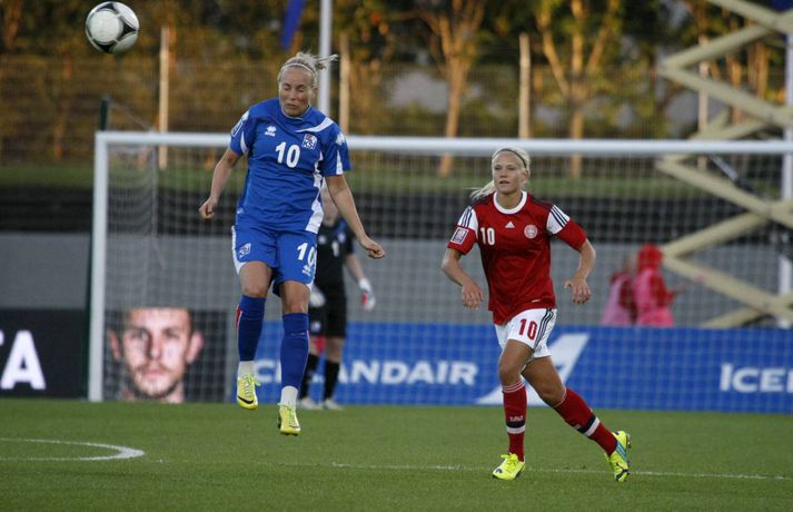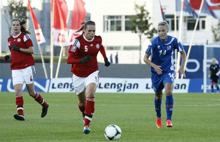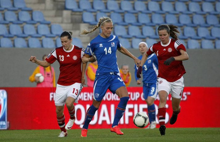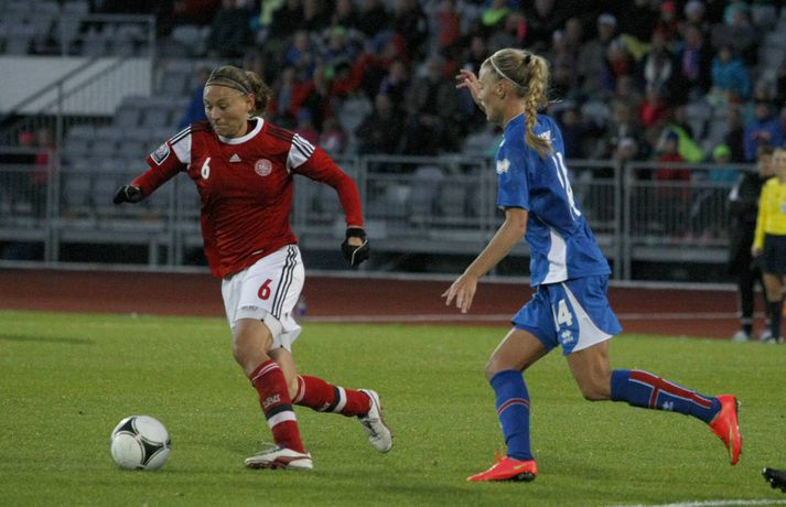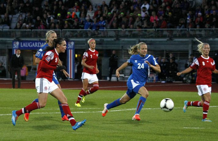 Umfjöllun, viðtöl og myndir: Ísland - Danmörk 0-1 | HM-draumurinn úti Guðmundur Marinó Ingvarsson og Anton Ingi Leifsson á Laugardalsvelli skrifar 21. ágúst 2014 15:49 Harpa Þorsteinsdóttir í færi gegn Dönum í Dalnum í kvöld. Vísir/andri marinó Draumur íslenska kvennalandsliðsins um að spila á HM í Kanada á næsta ári er úti eftir 0-1 tap á heimavelli gegn Danmörku. Eina markið kom um miðbik síðari hálfleiks. Ísland spilaði frábærlega í fyrri hálfleik og fram að marki Dana sem kom eftir 58. mínútur þegar Pernille Harder kom gestunum yfir. Eftir það var allt annað uppá teningnum hjá íslenska liðinu sem virtist rotast við þetta mark Dana. Íslenska liðið spilaði 4-3-3, eins og í flestum leikjum í undankeppninni. Þóra B. Helgadóttir var í markinu og fjögurra manna varnalínu skipuðu, frá hægri til vinstri, þær Ólína Guðbjörg Viðarsdóttir, Glódís Perla Viggósdóttir, Anna Björk Kristjánsdóttir og Hallbera Guðný Gísladóttir. Á miðjunni var Dóra María Lárusdóttir og fyrir framan hana voru þær Sara Björk Gunnarsdóttir og Dagný Brynjarsdóttir. Fanndís Friðriksdóttir var á hægri kantinum, Rakel Hönnudóttir þeim vinstri og markadrottning Pepsi-deildar kvenna, Harpa Þorsteinsdóttir, var fremst. Íslenska liðið byrjaði af miklum krafti. Þær kræktu í tvær hornspryrnur á fyrstu fjórum mínútum leiksins sem báðar voru nokkuð hættulegar. Fanndís Friðriksdóttir byrjaði með miklum látum og var að valda fyrirliðanum Line Röddik Hansen miklum vandræðum. Bæði Sara Björk og Harpa fengu báðar fín færi á fyrstu tuttugu mínútum leiksins og íslenska liðið lofaði góðu.Dagný Brynjarsdóttir á eftir leikmanni Dana.vísir/andri marinóGestirnir frá Danmörku voru betri í sókn heldur en vörn. Skyndisóknir þeirra voru hættulegar og þær fengu eina svoleiðis eftir fjórar mínútur, en Þóra B. Helgadóttir var vel með á nótunum. Það var með ólíkindum að íslenska liðið hafi ekki verið búið að skora í fyrri hálfleik, en gestirnir komu líklega boltanum yfir línuna undir lok fyrri hálfleiks. Eftir hornspyrnu skallaði Sofie Pedersen í slá og inn virtist vera, en dómarar leiksins töldu boltann ekki inni. Það var því markalaust þegar rúmenski dómarinn, Teodora Albon, flautaði til hálfleiks. Fyrri hálfleikurinn var afar góður af hálfu íslenska liðsins. Liðið spilaði beinskeyttan sóknarleik og gaf fá færi á sér. Þríeykið í fremstu víglínu; Fanndís, Harpa og Rakel var að valda usla og ég er nokkuð viss um að Freyr Alexandersson, þjálfari íslenska liðsins, hafi verið ánægður með spilamennskuna í fyrri hálfleik. Eina sem vantaði var að koma tuðrunni í netið. Danirnir byrjuðu af krafti í upphafi síðari hálfleiks og komust yfir eftir tæpan klukkutíma. Theresa Nielsen fékk boltann hægra megin, lagði boltann út í teiginn þar sem Pernille Harder kom á siglingunni og þrumaði boltanum í netið. Óverjandi fyrir Þóru og okkar stúlkur lentar undir. Nú reyndi fyrst á íslenska liðið. Hálftími eftir og þær þurftu mark, ef ekki mörk. Arna Sif Ásgrímsdóttir kom inná í stað Glódísar Perlu sem glímdi við meiðsli. Þær sköpuðu sér afar fá færi eftir að danska liðið komst yfir og Freyr Alexandersson freistaði gæfunnar með að henda markahæsta leikmanni íslenska hópsins Hólmfríði Magnúsdóttir inná í stað Fanndísar Friðriksdóttir sem átti betri fyrri hálfleik, en síðari hálfleik. Lítið sem ekkert gerðist þó við þessar breytingar og dó dálítið leikurinn eftir mark Dana. Íslensku stelpurnar freistuðu þess að jafna metin, en allt kom fyrir ekki og náðu gestirnir að drepa algjörlega leikinn. Þær sigldu svo þremur stigunum heim til Danmerkur, lokatölur 0-1. Fyrri hálfleikurinn lofaði virkilega góðu og var ótrúlegt að íslenska liðið hafi ekki verið komið yfir í hálfleik. Í síðari hálfleik styrktust Danirnir og skoruðu svo eina mark leiksins sem skildi liðin að. Mikil orka fór í pressu íslenska liðsins í fyrri hálfleik , en íslenska liðið átti lítið púður til að freista þess að jafna metin í síðari hálfleik. Með tapinu er HM draumurinn á enda. Ísland er nú í þriðja sæti með þrettán stig eftir átta leiki, en fjögur lið af sjö með besta árangurinn í öðru sæti fara í umspil. Því er draumurinn um að Ísland spili á HM í Kanada úti, en Ísland spilar geng Ísrael og Serbíu um miðjan september og spilar þar uppá stoltið.vísir/andri marinóFreyr: Þú verður að klára færin „Við fengum mörg færi, pressuðum vel og komum okkur í opnar stöður og í svona leikjum þá verður þú að klára færin sem þú færð og við erum að súpa seyðið af því,“ sagði Freyr Alexandersson þjálfari Íslands. „Þær skora gott mark svo sem, það var vel spilað. Við vissum alveg að þær myndu fá færi en við áttum bara að vera komin í 1 eða 2-0 í fyrri hálfleik. „Leikskipulagið gekk eins og sögu og þess vegna svíður það svolítið að hafa ekki náð inn þessu marki. Það breytir svo mikið leiknum. Þá hefðum við getað þrengt svæðin ennþá frekar, tekið okkur tíma í þetta og siglt þessu heim. Í staðin komast þær 1-0 yfir og sigla þessu heim,“ sagði Freyr. Danska vörnin var í miklum vandræðum í fyrri hálfleik og átti fá svör við leik íslenska liðsins. „Þetta var svipað og í fyrri leiknum gegn Dönum. Við erum með kröftuga leikmenn og þegar þær koma af mikilli ákefð á andstæðinginn þá vinna þær boltann oft. Danirnir vilja reyna að spila og við vissum það. Við reyndum að koma á þær og vinna boltann og það gekk vel. Ég er ofboðslega fúll að hafa ekki fengið mark út úr því. „Stóra skýringin er að það fór mikil orka og svo lendum við undir og ég er ekki vis