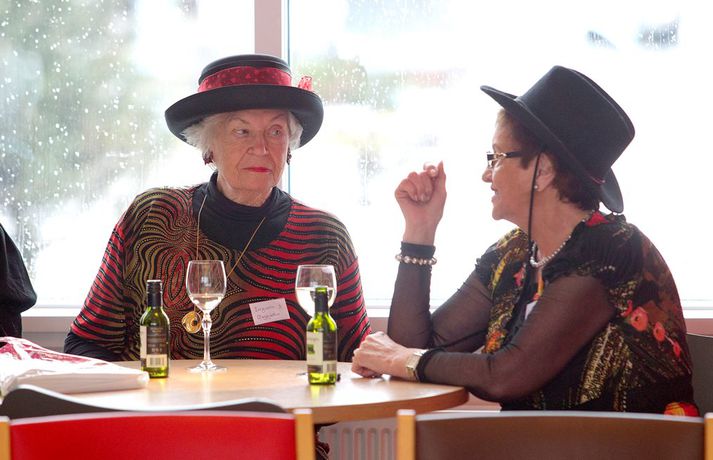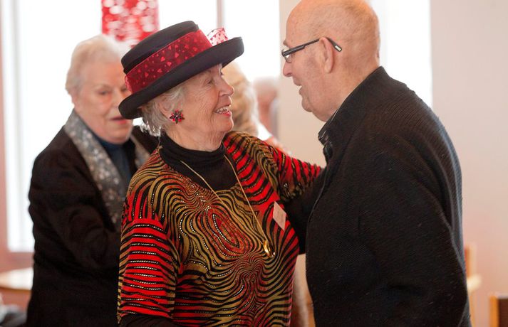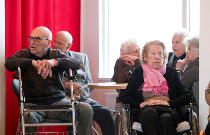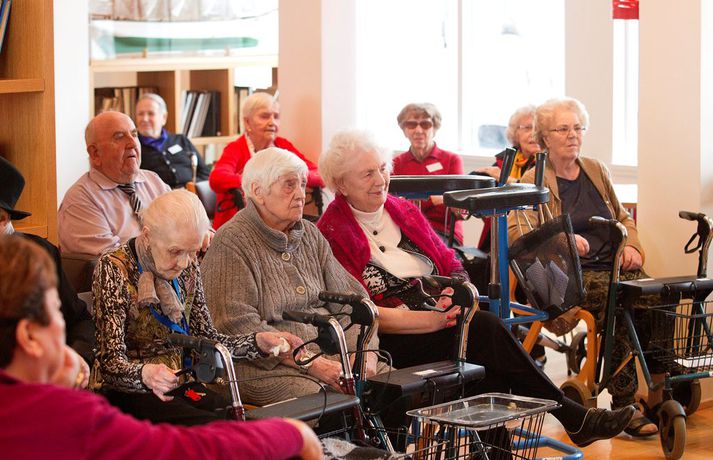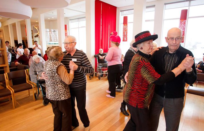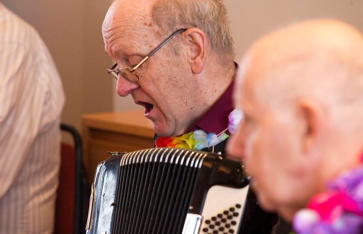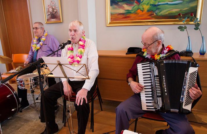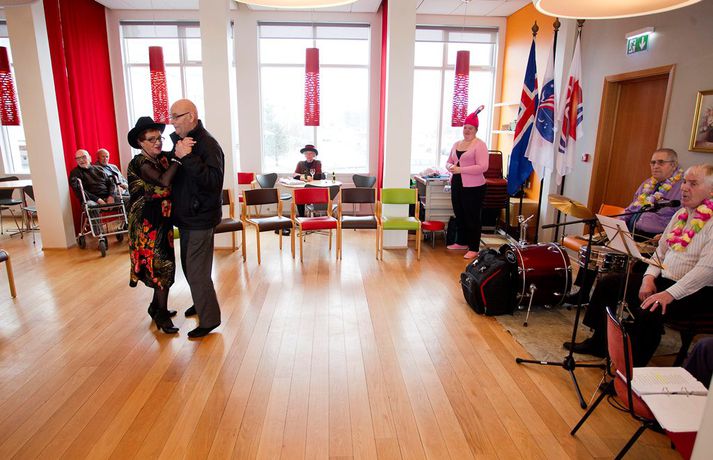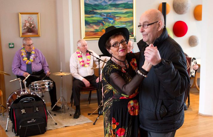 Það var heldur betur fjör á Hrafnistu í Reykjavík í dag þar sem DAS-hljómsveitin lék fyrir dansi á Öskudagsballi. Um margra ára hefð er að ræða og mæta margir íbúar Hrafnistu með höfuðföt á ballið en færst hefur í vöxt að starfsfólkið klæði sig í búninga eins og meðfylgjandi myndir sína. DAS-bandið fagnar fimmtán ára starfsafmæli í ár en forsprakki þess er Böðvar Guðmundsson. Hann skipaði bandið ásamt Kristjáni Þorkelssyni í upphafi þar sem Böðvar lék á harmonikku og Kristján sló taktinn á trommusett. Síðan hafa bæst við bandið bæði heimilismenn og gamlir kunningjar Böðvars sem áður voru í hljómsveitum.Spila í hverri viku „Síðasta föstudag vorum við fimmtán sem spiluðum saman en í dag vorum við bara fjórir af praktískum ástæðum,“ segir Böðvar en flestir úr DAS-bandinu eru íbúar Hrafnistu í Hafnarfirði. Þar leika þeir fyrir dansi á hverjum föstudegi en á fimm til sex vinka fresti á Hrafnistu í Reykjavík við góðar undirtekir. Tónlistin sem þeir leika er aðallega frá sjötta og sjöunda áratug síðustu aldar. „Þetta er bara þessi gamla tónlist sem var á böllunum sem þessi kynslóð sem býr inni á Hrafnistu í dag þekkir og man eftir. Hún var vinsæl í kringum 50 og 60. Það er það sem við spilum mest. Svo höfum við reynt að tína inn eitt og eitt nýtt,“ segir Böðvar og tekur sem dæmi lag Bjartmars Guðlaugssonar, Þannig týnist tíminn, sem var valið Óskalag þjóðarinnar í samnefndum þáttum sem sýndir voru í Sjónvarpinu síðastliðið haust. „Það verður að fylgja með.“Komast ekki inn í Söngvakeppnina En DAS-bandið er ekki aðeins með hugann við dansleiki á Hrafnistu. Það á sér stærri drauma og einn þeirra er að verða fulltrúi Íslendinga í söngvakeppni evrópskra sjónvarpsstöðva, Eurovision. Hugmyndin kviknaði árið 2012 þegar ömmurnar frá Buranovo höfnuðu í öðru sæti í Eurovision fyrir hönd Rússlands og hefur sú saga gengið á Hrafnistu að Íslendingar munu ekki hrósa sigri í keppninni fyrr en DAS-bandið kemst þangað. „Við höfum tvisvar sent inn í Söngvakeppni Sjónvarpsins en því miður náði þetta ekki eyrum dómnefndar. En við höfum bara fyrst og fremst voða gaman að þessu og þetta er nú í gríni gert,“ segir Böðvar sem segist styðja þá kenningu að Íslendingar vinni ekki Eurovision fyrr en DAS-bandið kemst þangað. „Við höfum tröllatrú á okkur það er ekki það.“