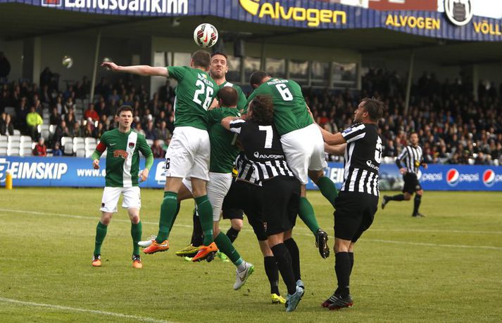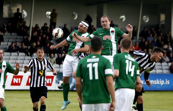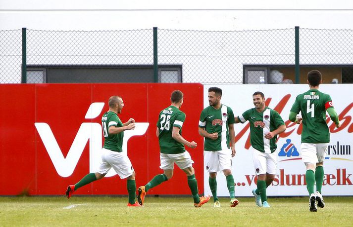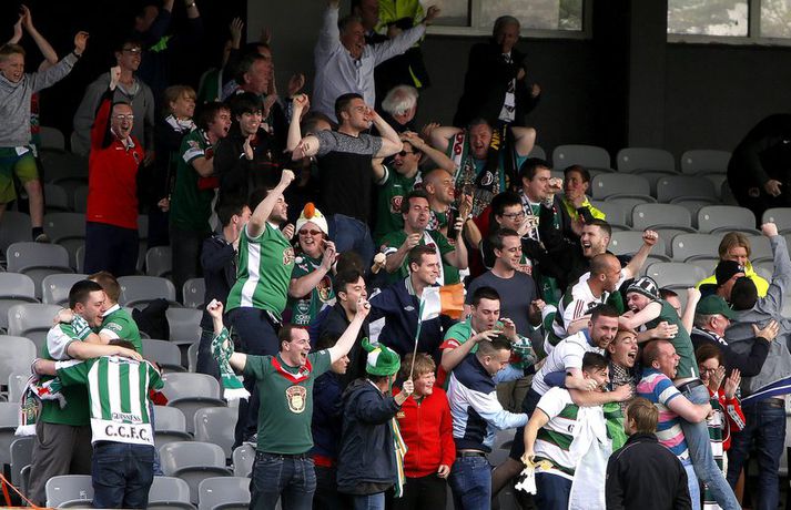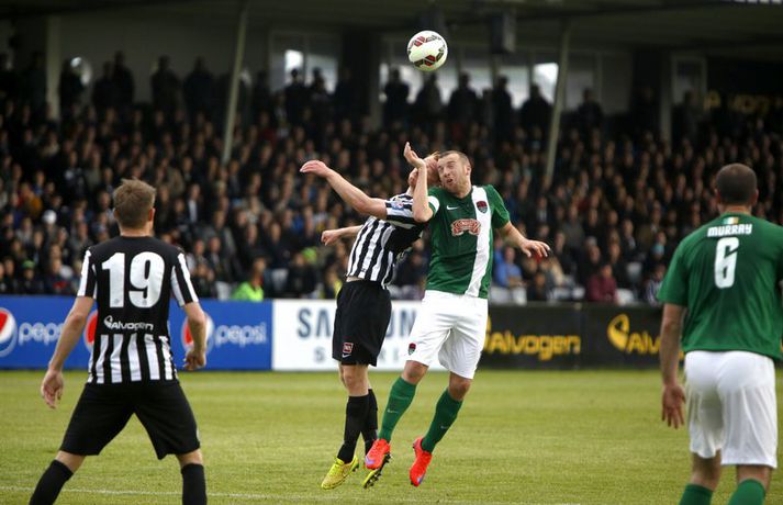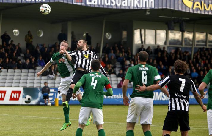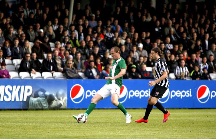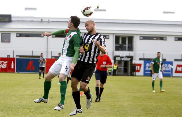 Umfjöllun, viðtöl og myndir: KR - Cork City 2-1 | Frábær endurkoma KR-inga Ingvi Þór Sæmundsson á Alvogen-vellinum skrifar 9. júlí 2015 13:07 Bjarni Guðjónsson hefur eflaust aldrei verið jafn stoltur af KR-liðinu sínu og eftir seinni leikinn gegn Cork City frá Írlandi í kvöld.Andri Marinó Karlsson, ljósmyndari Fréttablaðsins og Vísis, var á vellinum og tók meðfylgjandi myndir. KR-ingar lentu í miklu mótlæti í leiknum og í hálfleik var staðan svört, marki undir og manni færri eftir að Skúli Jón Friðgeirsson fékk að líta sitt annað gula spjald undir lok fyrri hálfleiks. Það var annað og betra KR-lið sem mætti til leiks í seinni hálfleiks en í þeim fyrri og þrátt fyrir að vera manni færri höfðu Vesturbæingar mikla yfirburði. Pálmi Rafn Pálmason jafnaði metin á 75. mínútu og á níundu mínútu framlengingarinnar skoraði Jacob Schoop, besti maður vallarins, sigurmark KR eftir frábæran undirbúning Garys Martin. KR vann viðureignina samanlagt 3-2 og er komið í 2. umferð forkeppni Evrópudeildarinnar þar sem liðið mætir Rosenborg frá Noregi.Mörkin og rauða spjaldið má sjá hér að ofan og neðan. KR-ingar voru mun meira með boltann í fyrri hálfleik en gekk erfiðlega að skapa sér opin færi gegn írska liðinu sem lá mjög aftarlega. Schoop var í strangri gæslu og því kom það í hlut Jónasar Guðna Sævarssonar og Pálma Rafns Pálmasonar að stjórna leiknum sem er ekki þeirra helsti styrkleiki. Það var helst Skúli Jón sem nýtti sér allt plássið Cork-liðið gaf KR-ingum aftarlega á vellinum en miðvörðurinn átti nokkrar góðar sendingar fram völlinn og út á kantana, bæði stuttar og langar. Hann var hins vegar í sviðsljósinu fyrir aðra hluti á 43. mínútu þegar hann fékk sitt annað gula spjald fyrir að brjóta á Mark O'Sullivan, framherja Cork, sem var kominn framhjá honum. O'Sullivan reyndist KR-ingum afar erfiður í kvöld en þessi kröftugi framherji kom Cork yfir á 13. mínútu. Hann fékk þá sendingu inn fyrir vörn KR eftir að Jónas tapaði boltanum á miðjunni. Rasmus Christiansen virtist vera búinn að króa O'Sullivan af en framherjinn náði skoti sem fór í Rasmus og í boga yfir Stefán Loga Magnússon sem var kominn af línunni. Það reyndist eina mark fyrri hálfleiks og því ljóst að KR biði erfitt verkefni í seinni hálfleik. Hann var með svipuðu sniði og sá fyrri. KR stjórnaði leiknum og var jafnvel enn meira með boltann en í fyrri hálfleik. Hins vegar var tempóið í spili KR-inga hærra og krafturinn meiri í sóknaraðgerðum þeirra. Bjarni setti Almarr Ormarsson inn á í stað Jónasar snemma í seinni hálfleik og sú breyting hafði góð áhrif á KR-liðið. Við breytinguna færðist Schoop aðeins aftar, komst meira í boltann og fyrir vikið varð sóknarleikur KR mun markvissari. KR byrjuðu að lemja á hurðina - Óskar Örn Hauksson skallaði í slána eftir fyrirgjöf Almars og Gary var tvívegis nálægt því að skora - og að lokum gaf hún sig þegar Pálmi jafnaði metin með skoti af stuttu færi eftir skalla Schoops fyrir markið. Verðskuldað jöfnunarmark en KR-ingar voru ekki hættir. Þeir héldu áfram að spila og sýndu vilja til að vinna leikinn. Það sama var ekki hægt að segja um mótherja þeirra sem lágu í vörn allan leikinn og gerðu enga tilraun til að halda boltanum og sækja, jafnvel þótt þeir væru manni fleiri. Staðan var jöfn eftir venjulegan leiktíma og því þurfti að framlengja. KR var áfram sterkari aðilinn; Almarr komst í gott færi á 93. mínútu en Mark McNulty varði og tveimur mínútum síðar skallaði varamaðurinn Þorsteinn Már Ragnarsson í slána eftir góða fyrirgjöf Óskars Arnar frá vinstri. Sigurmarkið, sem var af fallegari gerðinni, kom svo á 99. mínútu. Heimamenn unnu boltann og Gary tók á rás fram völlinn. Hann var einn á móti fjölmörgum varnarmönnum Cork en hélt áfram. Allt í einu birtist Schoop hægra megin við hann. Gary beið og beið og sendi svo boltann á Danann á hárréttu augnabliki. Schoop komst einn á móti Mark McNulty, lék skemmtilega á hann og skoraði í autt markið. Glæsilegt mark og fyllilega verðskuldað. Cork-menn settu smá pressu á KR á lokamínútunum en ekkert sem heimamenn réðu ekki við. Óskar Örn fékk svo gullið tækifæri til að klára leikinn endanlega þremur mínútum fyrir leikslok en skaut framhjá. Það kom þó ekki að sök og KR-ingar fögnuðu verðskulduðum sigri og sæti í næstu umferð.Pálmi Rafn Pálmason skoraði jöfnunarmark KR.vísir/andri marinóBjarni: Brekkan var ansi brött Bjarni Guðjónsson, þjálfari KR, var að vonum glaður þegar hann ræddi við blaðamann Vísis eftir sigurinn á Cork City í kvöld. "Með fullri virðingu fyrir Cork held ég að við séum með betra fótboltalið. Þetta snerist alltaf um hvort við myndum vinna baráttuna," sagði Bjarni. "Við lentum undir í henni í seinni hálfleiknum úti en stjórnuðum fyrri hálfleiknum. Svo lentum við í vandræðum hérna; fengum mark á okkur og misstum mann af velli. "Brekkan var ansi brött en menn komu sterkir inn í seinni hálfleikinn sem mér fannst mjög góður. Fyrir utan mörkin tvö áttum við tvo skalla slá og svo fékk Óskar (Örn Hauksson) dauðafæri." Bjarni hrósaði varamönnunum sínum þremur komu allir sterkir inn í KR-liðið; Almarr Ormarsson, Þorsteinn Már Ragnarsson og Grétar S. Sigurðarson. "Þeir voru mjög góðir og leystu sín verkefni vel af hendi," sagði Bjarni sem var ánægður með skapgerðina sem KR sýndi í kvöld. "Það er mikill karakter og samstaða í liðinu. Andinn í klefanum er frábær og það hefur tekist á mjög skömmum tíma þrátt fyrir miklar breytingar í vetur." KR mætir norska stórliðinu Rosenborg í næstu umferð. Bjarna líst vel á það verkefni. "Það er gaman að fá stórlið til að spil