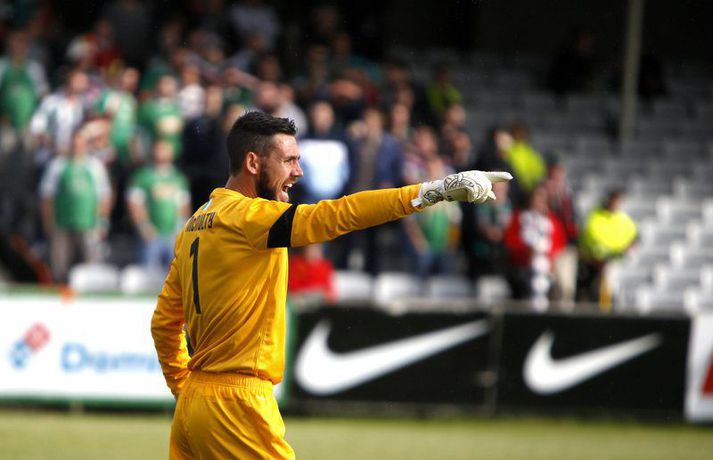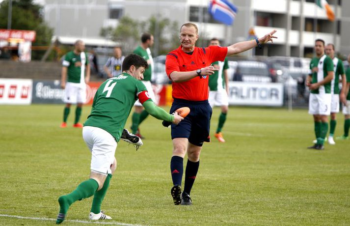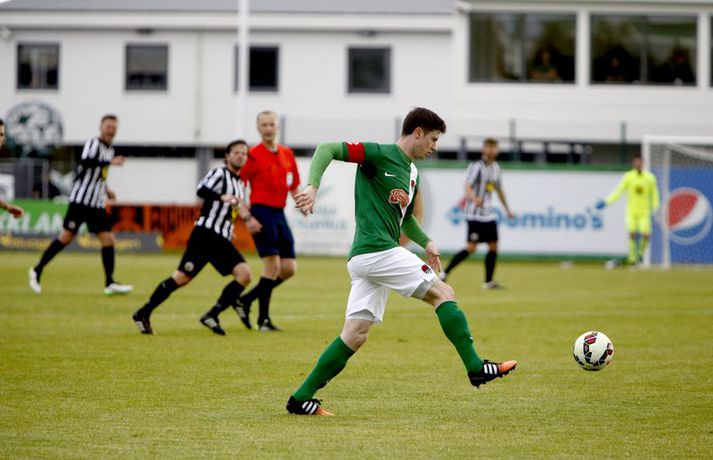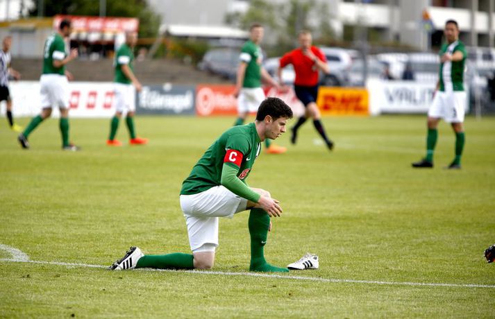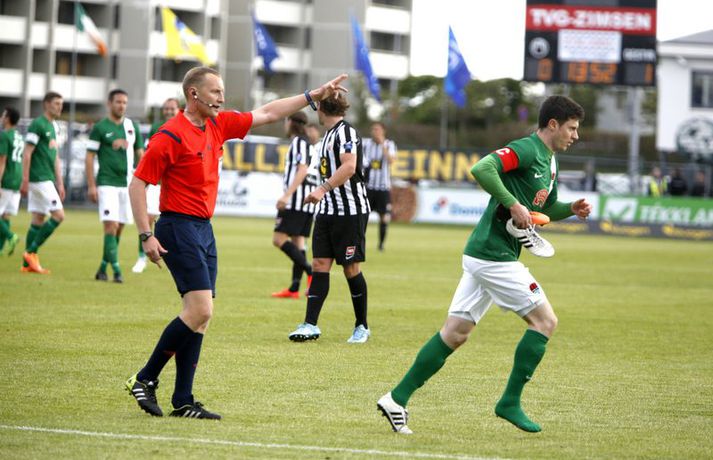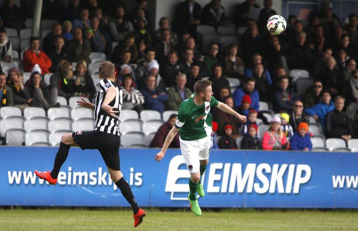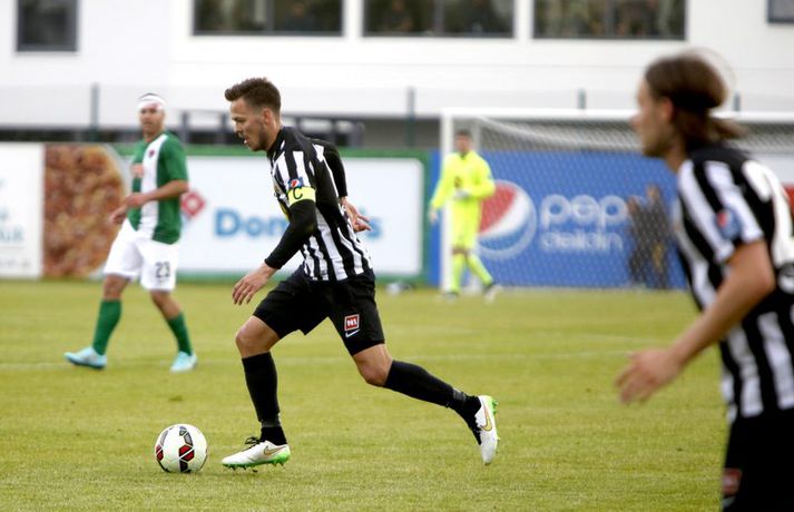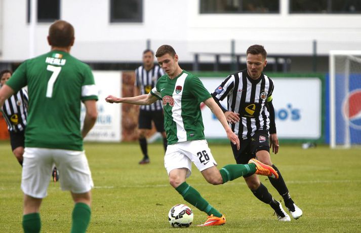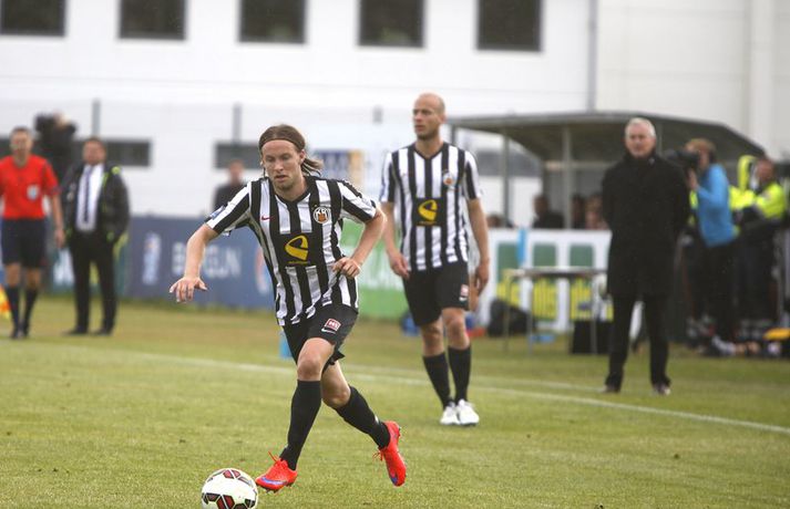 Bjarni Guðjónsson hefur eflaust aldrei verið jafn stoltur af KR-liðinu sínu og eftir seinni leikinn gegn Cork City frá Írlandi í kvöld.Andri Marinó Karlsson, ljósmyndari Fréttablaðsins og Vísis, var á vellinum og tók meðfylgjandi myndir. KR-ingar lentu í miklu mótlæti í leiknum og í hálfleik var staðan svört, marki undir og manni færri eftir að Skúli Jón Friðgeirsson fékk að líta sitt annað gula spjald undir lok fyrri hálfleiks. Það var annað og betra KR-lið sem mætti til leiks í seinni hálfleiks en í þeim fyrri og þrátt fyrir að vera manni færri höfðu Vesturbæingar mikla yfirburði. Pálmi Rafn Pálmason jafnaði metin á 75. mínútu og á níundu mínútu framlengingarinnar skoraði Jacob Schoop, besti maður vallarins, sigurmark KR eftir frábæran undirbúning Garys Martin. KR vann viðureignina samanlagt 3-2 og er komið í 2. umferð forkeppni Evrópudeildarinnar þar sem liðið mætir Rosenborg frá Noregi.Mörkin og rauða spjaldið má sjá hér að ofan og neðan. KR-ingar voru mun meira með boltann í fyrri hálfleik en gekk erfiðlega að skapa sér opin færi gegn írska liðinu sem lá mjög aftarlega. Schoop var í strangri gæslu og því kom það í hlut Jónasar Guðna Sævarssonar og Pálma Rafns Pálmasonar að stjórna leiknum sem er ekki þeirra helsti styrkleiki. Það var helst Skúli Jón sem nýtti sér allt plássið Cork-liðið gaf KR-ingum aftarlega á vellinum en miðvörðurinn átti nokkrar góðar sendingar fram völlinn og út á kantana, bæði stuttar og langar. Hann var hins vegar í sviðsljósinu fyrir aðra hluti á 43. mínútu þegar hann fékk sitt annað gula spjald fyrir að brjóta á Mark O'Sullivan, framherja Cork, sem var kominn framhjá honum. O'Sullivan reyndist KR-ingum afar erfiður í kvöld en þessi kröftugi framherji kom Cork yfir á 13. mínútu. Hann fékk þá sendingu inn fyrir vörn KR eftir að Jónas tapaði boltanum á miðjunni. Rasmus Christiansen virtist vera búinn að króa O'Sullivan af en framherjinn náði skoti sem fór í Rasmus og í boga yfir Stefán Loga Magnússon sem var kominn af línunni. Það reyndist eina mark fyrri hálfleiks og því ljóst að KR biði erfitt verkefni í seinni hálfleik. Hann var með svipuðu sniði og sá fyrri. KR stjórnaði leiknum og var jafnvel enn meira með boltann en í fyrri hálfleik. Hins vegar var tempóið í spili KR-inga hærra og krafturinn meiri í sóknaraðgerðum þeirra. Bjarni setti Almarr Ormarsson inn á í stað Jónasar snemma í seinni hálfleik og sú breyting hafði góð áhrif á KR-liðið. Við breytinguna færðist Schoop aðeins aftar, komst meira í boltann og fyrir vikið varð sóknarleikur KR mun markvissari. KR byrjuðu að lemja á hurðina - Óskar Örn Hauksson skallaði í slána eftir fyrirgjöf Almars og Gary var tvívegis nálægt því að skora - og að lokum gaf hún sig þegar Pálmi jafnaði metin með skoti af stuttu færi eftir skalla Schoops fyrir markið. Verðskuldað jöfnunarmark en KR-ingar voru ekki hættir. Þeir héldu áfram að spila og sýndu vilja til að vinna leikinn. Það sama var ekki hægt að segja um mótherja þeirra sem lágu í vörn allan leikinn og gerðu enga tilraun til að halda boltanum og sækja, jafnvel þótt þeir væru manni fleiri. Staðan var jöfn eftir venjulegan leiktíma og því þurfti að framlengja. KR var áfram sterkari aðilinn; Almarr komst í gott færi á 93. mínútu en Mark McNulty varði og tveimur mínútum síðar skallaði varamaðurinn Þorsteinn Már Ragnarsson í slána eftir góða fyrirgjöf Óskars Arnar frá vinstri. Sigurmarkið, sem var af fallegari gerðinni, kom svo á 99. mínútu. Heimamenn unnu boltann og Gary tók á rás fram völlinn. Hann var einn á móti fjölmörgum varnarmönnum Cork en hélt áfram. Allt í einu birtist Schoop hægra megin við hann. Gary beið og beið og sendi svo boltann á Danann á hárréttu augnabliki. Schoop komst einn á móti Mark McNulty, lék skemmtilega á hann og skoraði í autt markið. Glæsilegt mark og fyllilega verðskuldað. Cork-menn settu smá pressu á KR á lokamínútunum en ekkert sem heimamenn réðu ekki við. Óskar Örn fékk svo gullið tækifæri til að klára leikinn endanlega þremur mínútum fyrir leikslok en skaut framhjá. Það kom þó ekki að sök og KR-ingar fögnuðu verðskulduðum sigri og sæti í næstu umferð.Pálmi Rafn Pálmason skoraði jöfnunarmark KR.vísir/andri marinóBjarni: Brekkan var ansi brött Bjarni Guðjónsson, þjálfari KR, var að vonum glaður þegar hann ræddi við blaðamann Vísis eftir sigurinn á Cork City í kvöld. "Með fullri virðingu fyrir Cork held ég að við séum með betra fótboltalið. Þetta snerist alltaf um hvort við myndum vinna baráttuna," sagði Bjarni. "Við lentum undir í henni í seinni hálfleiknum úti en stjórnuðum fyrri hálfleiknum. Svo lentum við í vandræðum hérna; fengum mark á okkur og misstum mann af velli. "Brekkan var ansi brött en menn komu sterkir inn í seinni hálfleikinn sem mér fannst mjög góður. Fyrir utan mörkin tvö áttum við tvo skalla slá og svo fékk Óskar (Örn Hauksson) dauðafæri." Bjarni hrósaði varamönnunum sínum þremur komu allir sterkir inn í KR-liðið; Almarr Ormarsson, Þorsteinn Már Ragnarsson og Grétar S. Sigurðarson. "Þeir voru mjög góðir og leystu sín verkefni vel af hendi," sagði Bjarni sem var ánægður með skapgerðina sem KR sýndi í kvöld. "Það er mikill karakter og samstaða í liðinu. Andinn í klefanum er frábær og það hefur tekist á mjög skömmum tíma þrátt fyrir miklar breytingar í vetur." KR mætir norska stórliðinu Rosenborg í næstu umferð. Bjarna líst vel á það verkefni. "Það er gaman að fá stórlið til að spila á móti. Brekkan verður bara brattari og það verða þrír í banni hjá okkur í næsta leik. Það verður krefjandi verkefni en nú einbeitum vi