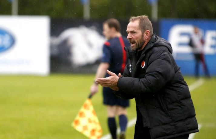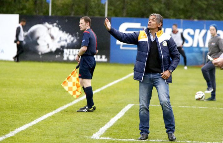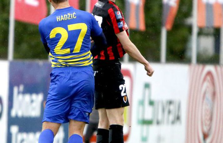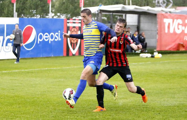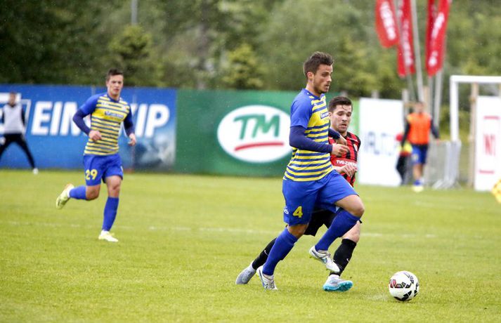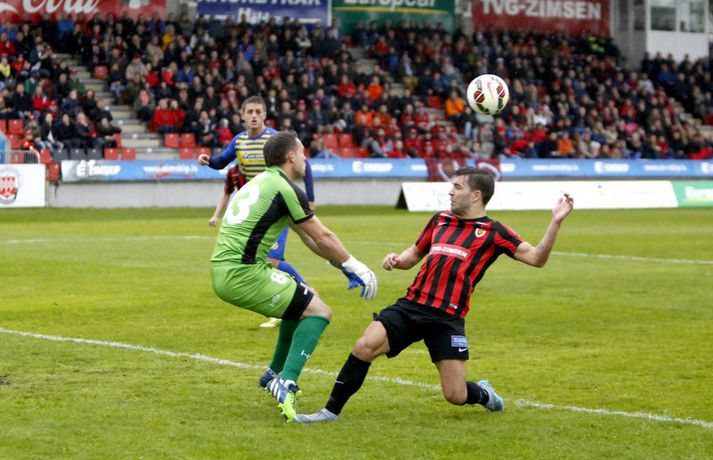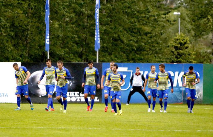 Víkingur á erfiðan leik fyrir höndum í Slóveníu í næstu viku eftir 1-0 tap gegn FC Koper í Víkinni í kvöld. Þetta var fyrsti leikur Víkings í Evrópukeppni síðan 1992 og því eftirvæntingin mikil í Fossvoginum. Niðurstaðan var því svekkjandi fyrir Víkinga sem halda þrátt fyrir allt í þá von að halda lífi í Evrópuævintýri félagsins.Andri Marinó Karlsson, ljósmyndari Vísis og Fréttablaðsins, var á leiknum í Víkinni í kvöld og náði þessum skemmtilegu myndum hér fyrir ofan. Víkingar voru sprækari aðilinn í markalausum fyrri hálfleik og áttu til að mynda skot í slá. Gestirnir áttu meira í síðari hálfleiknum og uppskáru mark þegar þrettán mínútur voru til leiksloka. Thomas Nielsen varði tvívegis mjög vel í leiknum en hann kom engum vörnum við þegar bakvörðurinn Matej Pucko dúndraði boltanum í markið með föstu skoti utan teigs í kjölfar hornspyrnu. Víkingar börðust hetjulega í kvöld en það vantaði þó nokkuð upp á þegar uppi var staðið. Þeim var refsað fyrir að nýta sér ekki góðan fyrri hálfleik en heimamönnum gekk illa að skapa sér almennilegt færi úr opnu spili. Koper, sem spilaði með þrjá miðverði og tvo djúpa miðjumenn, virtist sátt við að verjast, sækja hratt fram og ógna úr föstum leikatriðum. Upplegg gestanna gekk upp í kvöld. Það var vitað fyrir leik að það yrði erfitt að sækja gegn varnarmúr Koper og það kom á daginn. Engu að síður voru Víkingar sprækir í fyrri hálfleik þar til að kom að síðasta þriðjungi vallarins. Þar vantaði herlsumuninn í síðustu sendingunni til að skapa alvöru usla við mark gestanna. Slóvenarnir ógnuðu með hröðum upphlaupum og föstum leikatriðum. Koper fékk átta hornspyrnur í leiknum og Josep Ivancic, stór og stæðilegur sóknarmaður, fékk frábært skallafæri eftir eina slíka á 20. mínútu sem Nielsen varði vel. Ivancic lagði svo upp tvö skotfæri fyrir Ivica Guberac í síðari hálfleik. Það fyrra varði Nielsen vel en í hitt skiptið skaut hann framhjá. Færin sem Víkingar sköpuðu sér voru ekki jafn góð. Igor Taskovic átti reyndar tvö lúmsk skot í leiknum en hvorugt hitti markrammann. Þá átti Ívar Örn Jónsson skot í samskeytin úr aukaspyrnu í upphafi leiksins. Annars reyndi lítið sem ekkert á markvörð Koper í leiknum sem þurfti raunar ekki að verja eitt einasta skot frá Víkingum í kvöld. Leikmenn Koper eru flestir stórir og sterkir og fóru langt á styrk sínum í kvöld. En það dró af þeim eftir því sem leið á leikinn og því var það sérstaklega svekkjandi fyrir Víkinga að hafa fengið á sig mark úr föstu leikatriði þegar það var svo stutt til leiksloka. Víkingar reyndu hvað þeir gátu á lokakaflanum að ógna marki gestanna sem voru hæstánægðir með að verja 1-0 forystu fyrir síðari leikinn á heimavelli. Ljóst er að verkefni Víkinga verður erfitt þá en það gæti riðlað varnarskipulagi Slóvenanna ef Víkingum tekst að skora, sérstaklega ef það gerist snemma í leiknum. En til þess þurfa þeir röndóttu að sýna mun meiri ákefð fyrir framan mark andstæðingsins en þeir sýndu í kvöld og kemur einfaldlega ekkert annað til greina.Ólafur: Þurfum að taka meiri áhættu í teignum Ólafur Þórðarson, þjálfari Víkinga, segir svekkjandi að sjá hversu illa það gekk að skapa almennilega hættu við mark andstæðingsins þegar liðið tapaði, 1-0, fyrir FC Koper í kvöld. „Maður er auðvitað svekktur. Við vorum nálægt því að verðskulda eitthvað meira en það vantaði upp á hjá okkur að við værum nógu graðir til að koma inn mörkum,“ sagði Ólafur. „Þegar maður kemur inn í teig þá þurfa menn að taka meiri áhættu en við erum að gera og vera grimmari í að gera árás á boltann.“ „Við erum svolítið að bíða eftir því að boltinn komi bara til okkar og það eru 2-3 boltar sem leka bara í gegnum pakkann og það er svo enginn mættur á fjærstöng. Tryggvi Guðmundsson setti 40-50 mörk þar.“ Hann segir að það hafi lítið í slóvenska liðinu komið á óvart en að leikmenn hafi verið með meiri líkamlegan styrk en Ólafur reiknaði með. „En við vorum í betra formi en þeir og þeir gáfu meira eftir eftir því sem leið á seinni hálfleikinn. En samt vantaði ýmislegt upp á hjá okkur.“ „Við erum ansi þunnskipaðir fram á við og þyrftum við að vera með aðeins meiri breidd þar.“ Ólafur segir að það hafi verið erfitt að sækja gegn Koper sem varðist á þéttum pakka. „Það hefði mátt taka meiri áhættu í teignum en þá hefði mátt hlaupa svolítið meira. Ég veit að þetta er erfitt en þegar maður kemur á þetta stig þá þarf maður að gefa svolítið meira en er á tanknum hjá manni.“ „En það var mjög margt gott í leiknum hjá okkkur. Við héldum bolta vel og komumst aftur fyrir þá. En það vantaði herslumuninn.“ Rolf Toft var tekinn af velli um miðjan síðari hálfleikinn en Ólafur segir að þjálfararnir hafi viljað fá ferskar fætur inn á völlinn. „Rolf er búinn að spila mikið að undanförnu og mér fannst hann vera þreyttur. Arnþór kom inn og stóð sig vel. Skiptingin tókst því ágætlega.“Þjálfari Koper: Smá heppni í markinu okkar Rodolfo Vanoli, ítalskur þjálfari FC Koper, var stoltur af sínum mönnum fyrir 1-0 sigurinn á Víkingi í kvöld. „Ég hrósa mínu liði fyrir frammistöðun í kvöld. Ég var mjög ánægður með liðið og hvernig þeir komust frá þessum leik,“ sagði Vanooli „Þetta var opinn leikur og bæði lið áttu möguleika á að skora og vinna leikinn. Það var ákveðin heppni í því að hitta boltann jafn vel og við gerðum í markinu en gott að skora.“ Hann segir að rimmunni sé þó langt í frá lokið þrátt fyrir sigur Koper í víkinni í kvöld. „Við erum ánæ