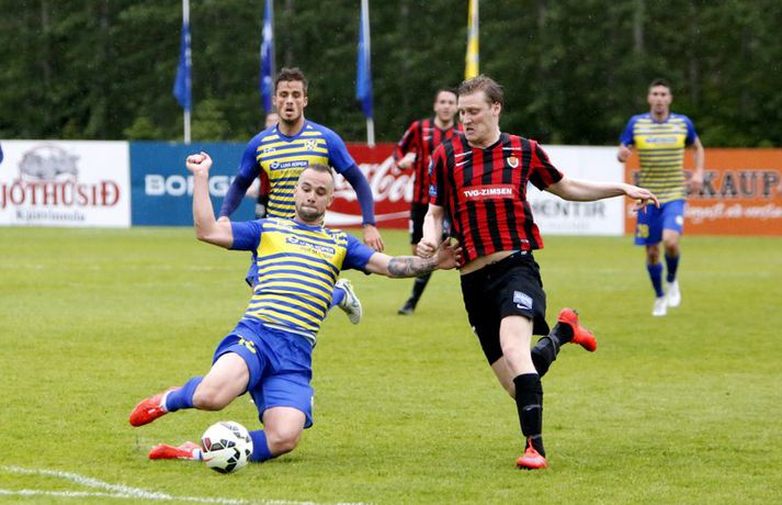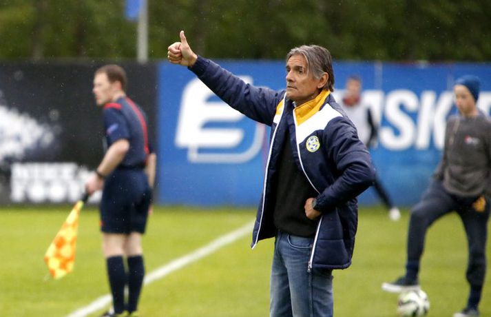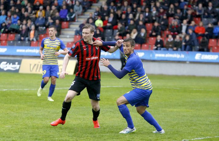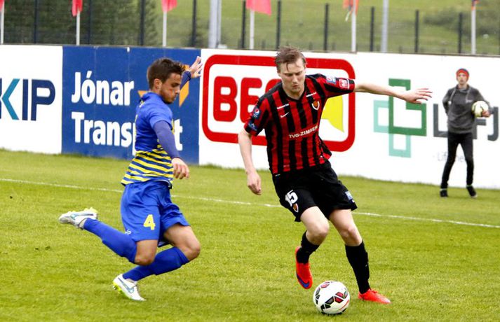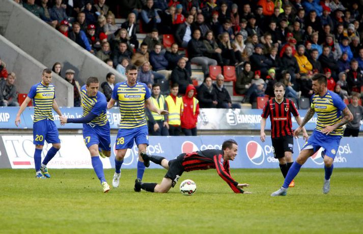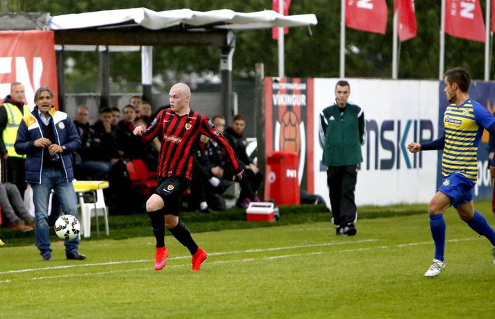 Umfjöllun, myndir og viðtöl: Víkingur - Koper 0-1 | Bitlausir Víkingar sjálfum sér verstir Eiríkur Stefán Ásgeirsson skrifar 2. júlí 2015 13:44 Víkingar náðu ekki hagstæðum úrslitum úr fyrsta Evrópuleiknum í 23 ár. Vísir/Andri Marinó Víkingur á erfiðan leik fyrir höndum í Slóveníu í næstu viku eftir 1-0 tap gegn FC Koper í Víkinni í kvöld. Þetta var fyrsti leikur Víkings í Evrópukeppni síðan 1992 og því eftirvæntingin mikil í Fossvoginum. Niðurstaðan var því svekkjandi fyrir Víkinga sem halda þrátt fyrir allt í þá von að halda lífi í Evrópuævintýri félagsins.Andri Marinó Karlsson, ljósmyndari Vísis og Fréttablaðsins, var á leiknum í Víkinni í kvöld og náði þessum skemmtilegu myndum hér fyrir ofan. Víkingar voru sprækari aðilinn í markalausum fyrri hálfleik og áttu til að mynda skot í slá. Gestirnir áttu meira í síðari hálfleiknum og uppskáru mark þegar þrettán mínútur voru til leiksloka. Thomas Nielsen varði tvívegis mjög vel í leiknum en hann kom engum vörnum við þegar bakvörðurinn Matej Pucko dúndraði boltanum í markið með föstu skoti utan teigs í kjölfar hornspyrnu. Víkingar börðust hetjulega í kvöld en það vantaði þó nokkuð upp á þegar uppi var staðið. Þeim var refsað fyrir að nýta sér ekki góðan fyrri hálfleik en heimamönnum gekk illa að skapa sér almennilegt færi úr opnu spili. Koper, sem spilaði með þrjá miðverði og tvo djúpa miðjumenn, virtist sátt við að verjast, sækja hratt fram og ógna úr föstum leikatriðum. Upplegg gestanna gekk upp í kvöld. Það var vitað fyrir leik að það yrði erfitt að sækja gegn varnarmúr Koper og það kom á daginn. Engu að síður voru Víkingar sprækir í fyrri hálfleik þar til að kom að síðasta þriðjungi vallarins. Þar vantaði herlsumuninn í síðustu sendingunni til að skapa alvöru usla við mark gestanna. Slóvenarnir ógnuðu með hröðum upphlaupum og föstum leikatriðum. Koper fékk átta hornspyrnur í leiknum og Josep Ivancic, stór og stæðilegur sóknarmaður, fékk frábært skallafæri eftir eina slíka á 20. mínútu sem Nielsen varði vel. Ivancic lagði svo upp tvö skotfæri fyrir Ivica Guberac í síðari hálfleik. Það fyrra varði Nielsen vel en í hitt skiptið skaut hann framhjá. Færin sem Víkingar sköpuðu sér voru ekki jafn góð. Igor Taskovic átti reyndar tvö lúmsk skot í leiknum en hvorugt hitti markrammann. Þá átti Ívar Örn Jónsson skot í samskeytin úr aukaspyrnu í upphafi leiksins. Annars reyndi lítið sem ekkert á markvörð Koper í leiknum sem þurfti raunar ekki að verja eitt einasta skot frá Víkingum í kvöld. Leikmenn Koper eru flestir stórir og sterkir og fóru langt á styrk sínum í kvöld. En það dró af þeim eftir því sem leið á leikinn og því var það sérstaklega svekkjandi fyrir Víkinga að hafa fengið á sig mark úr föstu leikatriði þegar það var svo stutt til leiksloka. Víkingar reyndu hvað þeir gátu á lokakaflanum að ógna marki gestanna sem voru hæstánægðir með að verja 1-0 forystu fyrir síðari leikinn á heimavelli. Ljóst er að verkefni Víkinga verður erfitt þá en það gæti riðlað varnarskipulagi Slóvenanna ef Víkingum tekst að skora, sérstaklega ef það gerist snemma í leiknum. En til þess þurfa þeir röndóttu að sýna mun meiri ákefð fyrir framan mark andstæðingsins en þeir sýndu í kvöld og kemur einfaldlega ekkert annað til greina.Ólafur: Þurfum að taka meiri áhættu í teignum Ólafur Þórðarson, þjálfari Víkinga, segir svekkjandi að sjá hversu illa það gekk að skapa almennilega hættu við mark andstæðingsins þegar liðið tapaði, 1-0, fyrir FC Koper í kvöld. „Maður er auðvitað svekktur. Við vorum nálægt því að verðskulda eitthvað meira en það vantaði upp á hjá okkur að við værum nógu graðir til að koma inn mörkum,“ sagði Ólafur. „Þegar maður kemur inn í teig þá þurfa menn að taka meiri áhættu en við erum að gera og vera grimmari í að gera árás á boltann.“ „Við erum svolítið að bíða eftir því að boltinn komi bara til okkar og það eru 2-3 boltar sem leka bara í gegnum pakkann og það er svo enginn mættur á fjærstöng. Tryggvi Guðmundsson setti 40-50 mörk þar.“ Hann segir að það hafi lítið í slóvenska liðinu komið á óvart en að leikmenn hafi verið með meiri líkamlegan styrk en Ólafur reiknaði með. „En við vorum í betra formi en þeir og þeir gáfu meira eftir eftir því sem leið á seinni hálfleikinn. En samt vantaði ýmislegt upp á hjá okkur.“ „Við erum ansi þunnskipaðir fram á við og þyrftum við að vera með aðeins meiri breidd þar.“ Ólafur segir að það hafi verið erfitt að sækja gegn Koper sem varðist á þéttum pakka. „Það hefði mátt taka meiri áhættu í teignum en þá hefði mátt hlaupa svolítið meira. Ég veit að þetta er erfitt en þegar maður kemur á þetta stig þá þarf maður að gefa svolítið meira en er á tanknum hjá manni.“ „En það var mjög margt gott í leiknum hjá okkkur. Við héldum bolta vel og komumst aftur fyrir þá. En það vantaði herslumuninn.“ Rolf Toft var tekinn af velli um miðjan síðari hálfleikinn en Ólafur segir að þjálfararnir hafi viljað fá ferskar fætur inn á völlinn. „Rolf er búinn að spila mikið að undanförnu og mér fannst hann vera þreyttur. Arnþór kom inn og stóð sig vel. Skiptingin tókst því ágætlega.“Þjálfari Koper: Smá heppni í markinu okkar Rodolfo Vanoli, ítalskur þjálfari FC Koper, var stoltur af sínum mönnum fyrir 1-0 sigurinn á Víkingi í kvöld. „Ég hrósa mínu liði fyrir frammistöðun í kvöld. Ég var mjög ánægður með liðið og hvernig þeir komust frá þessum leik,“ sagði Vanooli „Þetta var opinn leikur og bæði lið áttu möguleika á að