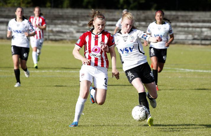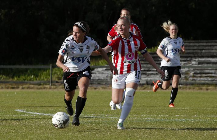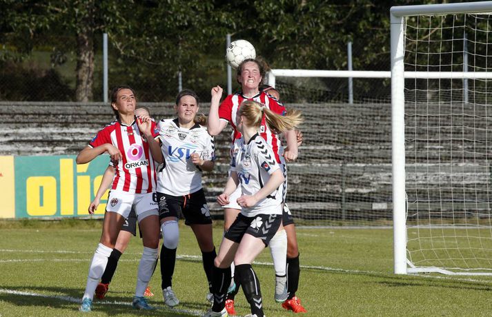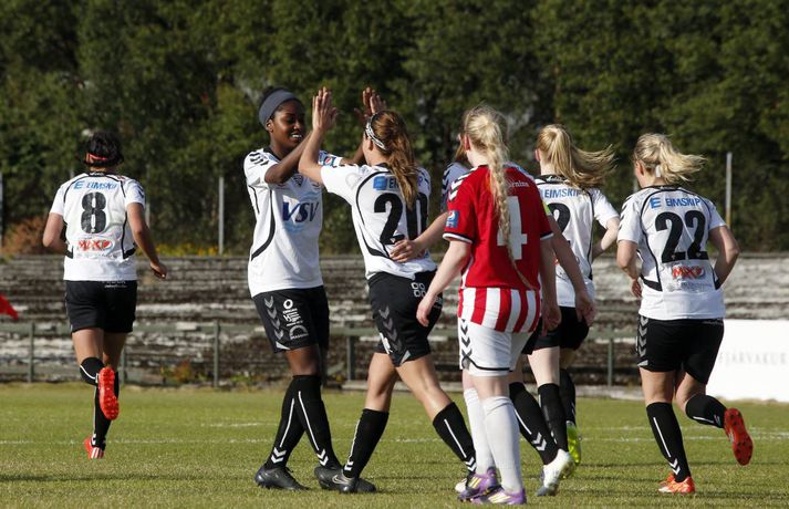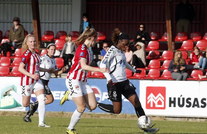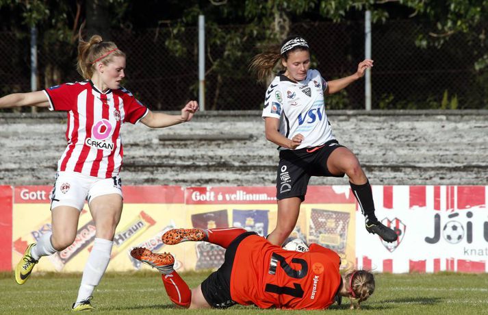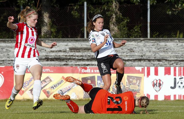 Gordon með tvennu í sigri ÍBV | Myndir Ingvi Þór Sæmundsson skrifar 28. júlí 2015 19:50 Shaneka Gordon skoraði tvennu fyrir ÍBV í kvöld. vísir/stefán ÍBV bar sigurorð af Þrótti, 2-3, í fyrsta leik kvöldsins í Pepsi-deild kvenna.Stefán Karlsson, ljósmyndari Fréttablaðsins og Vísis, var á vellinum og tók meðfylgjandi myndir. Þetta var annar sigur Eyjakvenna í síðustu þremur leikjum sínum en þær eru í 6. sæti deildarinnar með 19 stig. Þróttarar eru hins vegar í 9. og næstneðsta sæti með aðeins tvö stig þegar sex umferðunum er ólokið. Shaneka Gordon kom ÍBV yfir á 19. mínútu og hún bætti öðru marki við á þeirri 37. Gordon hefur verið iðin við kolann í sumar en hún er komin með átta mörk í deildinni. Staðan var 0-2 í hálfleik en strax á 4. mínútu seinni hálfleik kláraði Díana Helga Guðjónsdóttir leikinn þegar hún skoraði þriðja mark Eyjakvenna og sitt fyrsta í sumar. Rebekah Bass minnkaði muninn í 1-3 á 66. mínútu og hún var aftur á ferðinni á lokamínútunni þegar hún skoraði sitt annað mark. En nær komst Þróttur ekki og ÍBV fagnaði góðum sigri.Upplýsingar um úrslit og markaskorara eru fengnar frá úrslit.net. Pepsi Max-deild kvenna Tengdar fréttir Harpa tryggði sigurinn í seinni hálfleik Stjarnan er áfram fjórum stigum á eftir toppliði Breiðabliks í Pepsi-deild kvenna en bæði lið unnu sína leiki í kvöld. 28. júlí 2015 14:17 Berglind Björg kvaddi með þrennu Berglind Björg Þorvaldsdóttir lék sinn síðasta leik með Fylki í bili þegar Árbæjarliðið tók á móti Val á Fylkisvelli í kvöld en framherjinn er á leið til náms í Bandaríkjunum. 28. júlí 2015 21:10 Mest lesið Ísland lenti í algjörum martraðarriðli Fótbolti Liverpool vann risaslaginn Fótbolti Þjálfari sem mætti Víkingi í fyrra lést í miðjum leik Fótbolti Lýsir eftir leiðtoga íslenska landsliðsins Handbolti Þjálfaragoðsögn látin taka pokann sinn: „Ég er undrandi“ Fótbolti Falla fleiri gleðitár hjá fjölskyldu Viktors í kvöld? Fótbolti Meistararnir lágu á heimavelli Fótbolti Slavia Prag engin fyrirstaða fyrir Arsenal Fótbolti Björgvin Páll hafi þaggað niður í efasemdaröddum Handbolti „Í ástarsorg er gott að finna sér nýja ást sem fyrst“ Íslenski boltinn Fleiri fréttir Fram líka fljótt að finna nýja ást „Í ástarsorg er gott að finna sér nýja ást sem fyrst“ Fanndís hefur ekkert heyrt frá Val og íhugar að hætta „Það verður hundleiðinlegt að spila við Val“ Hermann tekinn við Val Fóru nýja leið í ár og auglýstu eftir þjálfara: Tommy Nielsen ráðinn Pablo og Óskar Örn inn í þjálfarateymi Hauka FH-ingar kveðja Kjartan Henry Tölur úr Bestu: Bjartur Bjarmi fór í flestar tæklingar af öllum Gísli semur við Skagamenn Óskar Smári tekur við Stjörnunni Bretinn ráðinn tæknilegur ráðgjafi hjá Val Fram þvertekur fyrir metnaðarleysi og leitar að nýjum þjálfurum Tölur úr Bestu: Hallgrímur Mar bjó til langflest færi „Mjög sáttur með samninginn“ „Hefði séð eftir því alla ævi“ Magnús Már í viðræðum við HK Uppgjörið: Ísland - Norður-Írland 3-0 | Áfram hluti af elítunni Tölur úr Bestu 2025: Klúðraði langflestum dauðafærum í sumar FH bíður með að tilkynna nýjan þjálfara Óskar Hrafn fer ekki fet Birnir frá Akureyri í Garðabæ Hættir með Fram Heimir kynntur til leiks í Árbænum Túfa rekinn frá Val Leyndarmáli ljóstrað upp þegar Heimir og Björn kvöddu Leikmenn kusu Patrick og Guðmund Sjáðu bananabombu Antons Loga og önnur síðustu mörk tímabilsins Uppgjörið: Stjarnan - Breiðablik 2-3 | Stjarnan í Evrópu þrátt fyrir tap „Held að ég geti ekki gert mikið meira“ Sjá meira