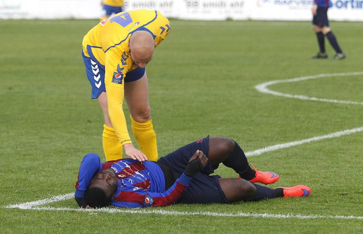 Umfjöllun, viðtöl, myndir og einkunnir: Leiknir - Fjölnir 2-3 | Fjölnir stal stigunum þremur Stefán Árni Pálsson á Leiknisvelli skrifar 13. september 2015 00:01 Það var hart barist á Leiknisvelli í dag. Vísir/Pjetur Fjölnir vann ótrúlegan sigur á Leikni í 19. umferð Pepsi-deildar karla í kvöld. Leikurinn fór 3-2 fyrir gestina og skoraði Kennie Chopart sigurmarkið á lokasekúndum leiksins.Pjetur Sigurðsson, ljósmyndari Vísis og Fréttablaðsins, mætti á Fjölnisvöll í kvöld og smellti af myndum sem sjá má hér fyrir ofan. Það var greinilegt frá fyrstu mínútu að allt var undir hjá Leiknismönnum sem börðust eins og ljón. Það voru aftur á móti Fjölnismenn sem gerðu fyrsta mark leiksins þegar Guðmundur Karl Guðmundsson þrumaði boltanum í netið rétt fyrir utan vítateig eftir um korters leik. Leiknismenn svöruðu markinu fullkomlega og gáfust alls ekki upp. Það var drengur á vellinum sem heitir Hilmar Árni Halldórsson og hann ætlaði sér ekki að tapa leiknum. Rétt eftir mark Fjölnis skaut hann boltanum í þverslána, stuttu eftir það jafnaði hann metin fyrir Leikni og nánast í næstu sókn eftir markið lagði hann upp fallegt mark hjá Kristjáni Páli Jónssyni. Allt í einu var staðan 2-1 fyrir Leikni. Lítið gerðist út fyrri hálfleikinn og var staðan 2-1 eftir 45 mínútur. Síðari hálfleikurinn hófst rólega og lítið gerðist fyrstu mínútur hálfleiksins. Leiknismenn ætluðu heldur betur að halda fengnum hlut og féllu alltof mikið til baka. Fjölnismenn unnu sig hægt og rólega í takt við leikinn og jöfnunarmarkið lág í loftinu. Guðmundur Karl Guðmundsson gerði sér lítið fyrir og jafnaði metin með fínu skoti á 83. mínútu leiksins. Allt leit út fyrir að leikurinn myndi fara jafnt en Kennie Chopart var á öðru máli og skoraði hann sigurmarkið á 94. mínútu leiksins og Leiknismenn að fá á sig enn eitt markið í uppbótartíma. Magnað alveg hreint og liðið fellur einfaldlega ef leikmenn Leiknis geta ekki haldið einbeitingu í 95 mínútur, svo einfalt er það. Niðurstaðan 3-2 sigur Fjölnis. Fjölnismenn fagna hér marki.Vísir/PjeturGuðmundur Karl: Loksins náðum við í þrjú stig „Það er bara glæsilegt að hafa landað þessum þremur stigum hér í dag,“ segir Guðmundur Karl Guðmundsson, eftir leikinn. „Það gerist heldur ekkert betra en að skorar sigurmarkið á lokamínútunni.“ Fjölnismenn skoruðu fyrsta mark leiksins en eftir það fengu þeir tvö mörk beint í andlitið. „Þeir komu bara sterkir til baka og við áttum í erfileikum með þá. Mér fannst við samt betri í seinni hálfleik og náðum að leysa þeirra leik vel.“ Guðmundur var ánægður með mörkin sín tvö í kvöld. „Mér líður alltaf vel á þessum velli, það er gaman að koma hingað og við mættum bara frábæru Leiknisliði.“ Hann segir að þessi þrjú stig hafi verið gríðarlega mikilvæg og loksins hafi liðið náð í þrjú stig. Davíð og Freyr, þjálfarar Leiknis.Vísir/PjeturDavíð: Þetta snýst um rangar ákvarðanatökur undir lokin „Við erum bara svekktir og áttum fullt af góðum köflum í þessum leik,“ segir Davíð Snorri Jónsson, annar þjálfari Leiknis, eftir leikinn. Leiknir fékk mark á sig í upphafi leiksins en komu vel til baka. „Við sýndum þá mjög góðan karakter og vorum að spila virkilega vel. Sá kafli skilaði okkur góðri forystu.“ Í síðari hálfleiknum féll Leiknisliðið of mikið til baka og ætluðu menn að halda fengnum hlut. „Okkur vantaði þá ákveðni sem var hjá liðinu í fyrri hálfleik og það gekk erfilega að halda boltanum innan liðsins. Það kemur oft fyrir að lið ætla sér að fara vernda einhverja forystu.“ Hann segir að liðið hafi þurft að vera meira yfirvegað. Sigurmark Fjölnis kom í uppbótartíma og það er ekki í fyrsta sinn í sumar sem Leiknir fær á sig mark undir blálokin. „Leikmenn okkar eru í nægilega góðu formi. Menn eru bara að taka of oft rangar ákvarðanir. Við erum samt ekki búnir að gefast upp og næsti leikur er bara gegn Fylki og þá ætlum við okkur sigur.“Ágúst í leiknum í kvöld.Vísir/PjeturÁgúst: Gott að sjá boltann í netinu undir lokin „Það var kominn tími til að við snérum þessum gengi við, það voru komin fjögur jafntefli í röð hjá okkur,“ segir Ágúst Gylfason, þjálfari Fjölnis, eftir leikinn í kvöld. „Við vorum búnir að fara vel yfir okkar leik fyrir leikinn í kvöld og það var mjög sætt að sjá boltann í netinu undir lokin.“ Hann segir að liðið hafi fengið á sig tvö klaufaleg mörk. „Við vorum undir í hálfleik og það var bara sanngjarnt. Við komum síðan ákveðir út í síðari hálfleikinn, sýndum þolinmæði og náðum að snúa töpuðum leik í sigur undir lokin.“ Ágúst segir að Leiknismenn hafi sýnt gríðarlega stórt hjarta í leiknum í kvöld. „Þeir gerðu allt til að ná í þrjú stig en við sýndum karakter undir lokin og ég er gríðarlega ánægður með mína menn. Þetta mun vissulega hjálpa okkur til að ná markmiðum okkar.“vísir/pjetur Pepsi Max-deild karla Mest lesið Vonast til að komast í Kórinn: „Menn hafa aldrei séð annað eins“ Fótbolti Landsleiknum aflýst og framhaldið óljóst Fótbolti Fær þrjár milljónir á dag næstu sex árin fyrir að gera ekkert Sport Stöðufundur í Laugardal klukkan 10:30 Fótbolti Enska úrvalsdeildin í jólaköttinn Enski boltinn Elsta konan til klára Járnkarlinn Sport Landsliðskonur aðstoðuðu ökumenn í vanda Fótbolti Markvörður Inter banaði háöldruðum manni í hjólastól Sport Birnir frá Akureyri í Garðabæ Íslenski boltinn Segir að Slot verði að taka tvo leikmenn út úr Liverpool-liðinu Enski boltinn Fleiri fréttir Birnir frá Akureyri í Garðabæ Hættir með Fram Heimir kynntur til leiks í Árbænum Túfa re