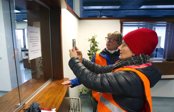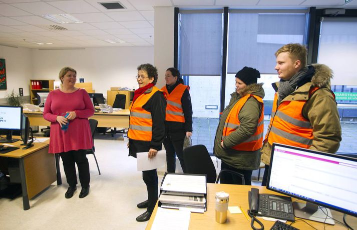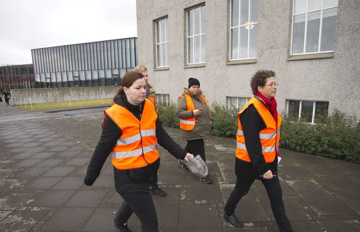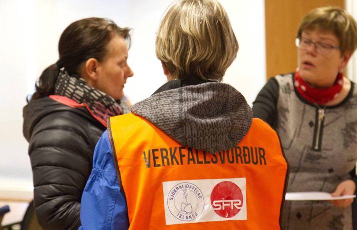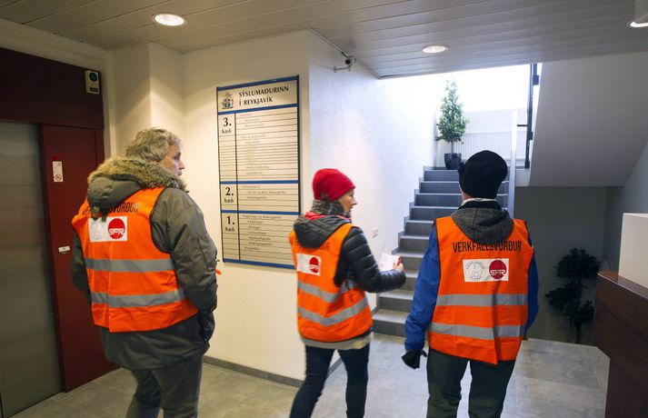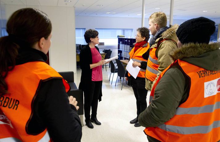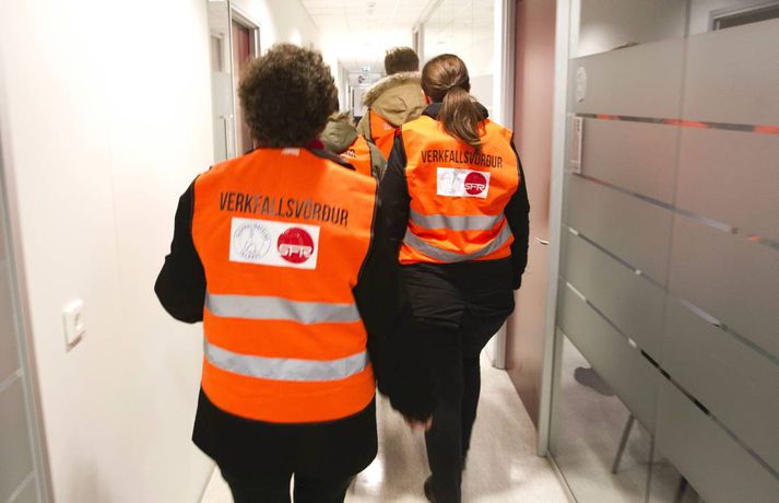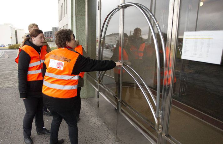 Nokkuð um verkfallsbrot í dag: Dæmi um að hjúkrunarfræðingar gangi í störf sjúkraliða sunna karen sigurþórsdóttir skrifar 16. október 2015 14:04 Verkfallsverðir hafa haft í nægu að snúast frá því að verkfall SFR og sjúkraliða hófst í gær. Nokkuð hefur verið um verkfallsbrot, sem þó eru í fæstum tilvikum alvarleg. Verkfallsbrjótar gætu hins vegar þurft að súpa seiðið af því síðar meir, því tilkynnt mál fara fyrir nefnd þar sem ákvörðun verður tekin um hvort fara eigi með málið lengra. „Við erum alltaf að fá til okkar einhver tilvik. Við athugum það í kjölfarið en eins og er, er er ekkert neitt mjög stórt. Það er eitthvað um að stjórnendur ganga í störf undirmanna. Oft er það hugsunarleysi, fólk er ekki að átta sig á því að það er að ganga í störf einhverra og svo hafa aðrir starfsmenn verið fengnir til að taka yfir verkefni þeirra sem eru í verkfalli,“ segir Sólveig Jónsdóttir, upplýsingafulltrúi SFR stéttarfélags. Hún segir að dæmi séu um að utanaðkomandi hafi verið fengnir í símsvörun, sem og að hjúkrunarfræðingar hafi gengið í störf sjúkraliða. „Það getur reynst flókið að fylgjast með þessu. Þetta eru svo margar stofnanir og störfin fjölbreytt. Það er reyndar skýrara með sjúkraliðastéttina, en þeir hafa verið að lenda í því að hjúkrunarfræðingar ganga í þeirra störf.“ Aðspurð segir Sólveig öll mál fara fyrir nefnd þar sem tekin verður ákvörðun um framhaldið. „Það sem við gerum er að við mætum á staðinn, tölum við fólkið og auðvitað reynum að leysa málið. En ef þetta er ítrekað þá fer þetta til lögfræðings.“ Þá segir hún verkfallsvörsluna hafa gengið vel. Töluvert sé að gera, sem og hjá undanþágunefnd.Meðfylgjandi myndir tók Pjetur Sigurðsson ljósmyndari sem fékk að fylgja verkfallsvörðunum eftir í dag.Þarna telja verkfallsverðir að um brot sé að ræða. Á miðanum kemur fram að þeir sem boðaðir séu í fyrirtöku eða viðtal séu beðnir um að bíða eftir starfsmanni í afgreiðslurými - sem eflaust er ekki á vegum SFR.Verkfallsverðir fyrir utan embætti sýslumannsins í Reykjavík.Starfsmenn í mötuneyti hjá sýslumanninum eru í verkfalli.Ýmis skjöl sem fá að bíða.Þarna telja verkfallsverðir að um verkfallsbrot sé að ræða. Á miðanum eru þeir sem boðaðir eru í fyrirtöku eða viðtal hjá Útlendingastofnun beðnir um að bíða eftir starfsmanni í afgreiðslurými - sem væntanlega er ekki á vegum SFR.vísir/pjeturVerkfallsverðir skoða hvern krók og kima.Háskóli Íslands var næstur á dagskrá.Á leið í Háskóla Íslands.Pjetur Sigurðsson ljósmyndari fylgdi tveimur hópum verkfallsvarða eftir í dag.vísir/PjeturNemendaskrá Háskóla Íslands.Nemendaskrá Háskóla Íslands.Ekki má gleyma kjallaranum.Miðstöð verkfallsvarða.Öll mál rædd í þaula. Flóttamenn Verkfall 2016 Tengdar fréttir Lögreglumenn hringja sig inn veika í Leifsstöð Búast má við meiri töfum í Leifsstöð í dag en í gær, þar sem nokkrir lögregluþjónar, sem sinna landamæraeftirliti, hafa tilkynnt forföll vegna veikinda. Þetta á við um Ameríkuflugið og flug til Bretlands. 16. október 2015 07:15 Formaður SFR: Allt bendir til að næsta verkfall hefjist á mánudag Deiluaðilar settust aftur við samingaborðið í morgun. 16. október 2015 11:38 Skjótast milli húsa undan verkfallinu Forsvarsmenn ríkisstofnana vöknuðu upp við vondan draum í gær þegar starfsemi fjölda stofnana nær lamaðist vegna verkfalla SFR og sjúkraliða. 16. október 2015 07:00 Samstöðufundur verkfallsfólks við Stjórnarráðið Félagsmenn SFR stéttarfélags, sjúkraliðar og lögreglumenn hyggjast fjölmenna fyrir utan stjórnarráðið í dag. 16. október 2015 08:03 Fjölmenni við stjórnarráðið: „Sömu kjarabætur og aðrir“ Hundruð félagsmanna SFR stéttarfélags og Sjúkraliðafélags Íslands komu saman við Stjórnarráðið í morgun og kröfðust sambærilegra kjarabóta og aðrir ríkisstarfsmenn. 16. október 2015 10:14 Mest lesið Veðurvaktin: Snjókoman rétt að byrja og víða erfið færð Veður Snjókoman rétt að byrja Innlent Bílar út af veginum á Reykjanesbraut Innlent Ungur Miðflokksmaður gengst við rasisma og segir af sér Innlent Ráðgjafinn ráðinn í tímabundið starf eftir dýra skreppitúra Innlent Skvísur geti virkað sem hálfgerðir þroskaþjófar Innlent Játar að hafa myrt Shinzo Abe Erlent Viðbragðsaðilar í mikilli hættu vegna bíla á sumardekkjum Innlent Búast við hamförum vegna Melissu Erlent Allur floti Vegagerðar úti að ryðja snjó Veður Fleiri fréttir Segir sameiginlegum gildum Norðurlanda ógnað Fjölmargir farþegar fastir í flugvélum á Keflavíkurflugvelli Ungur Miðflokksmaður gengst við rasisma og segir af sér Sturlað ástand og United vettlingar prjónaðir í bílnum Mesta snjódýpt í Reykjavík sem mælst hefur í október Viðbragðsaðilar í mikilli hættu vegna bíla á sumardekkjum Bílar út af veginum á Reykjanesbraut Vill heimila Samkeppniseftirlitinu að ráðast í húsleitir Snjókoman rétt að byrja Píratar berjist gegn „rísandi bylgju lýðskrums og fasisma“ Skvísur geti virkað sem hálfgerðir þroskaþjófar Ráðgjafinn ráðinn í tímabundið starf eftir dýra skreppitúra Misvægi atkvæða bitnar mest á Kraganum Heitavatnslaust á Suðurnesjum og rafmagnslaust víða um land Skreppiferðir í Jysk meðal þess sem ráðgjafi rukkaði fyrir „Ég tel ekki tilefni til að íhuga stöðu mína“ Áhyggjur af lánaframboði og ógnarlangar biðraðir Vara við ferðum á Fagradalsfjall þar sem aðstæður geti orðið hættulegar Kristmundur verður lögreglustjóri á Austurlandi „Vonandi klárast þetta á morgun“ Sá látni var á rjúpnaveiðum þegar hann varð fyrir voðaskotinu Kvartanir mannsins