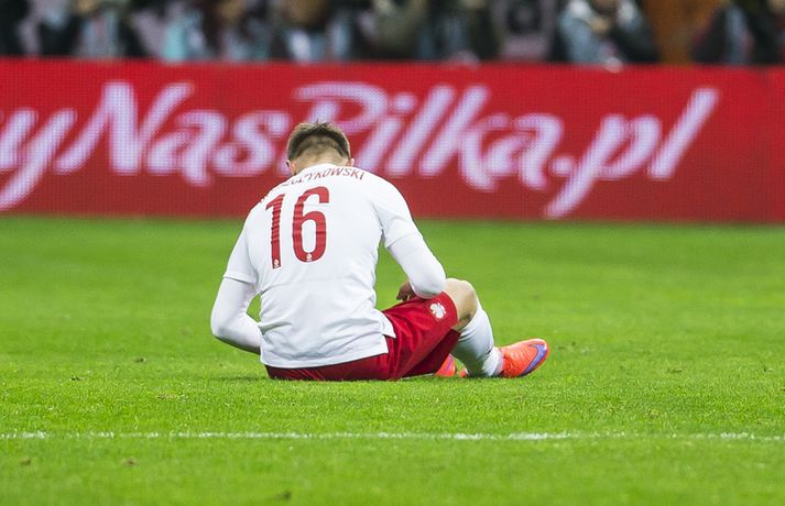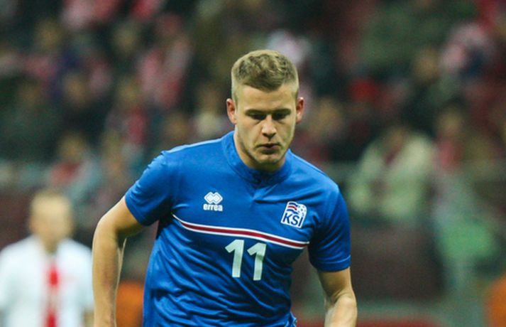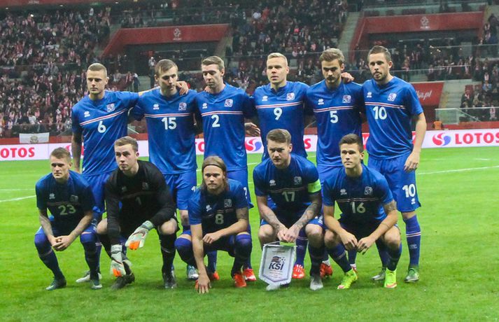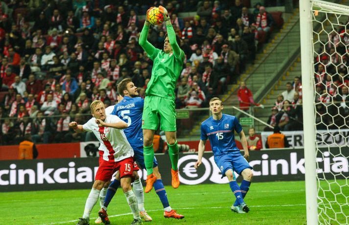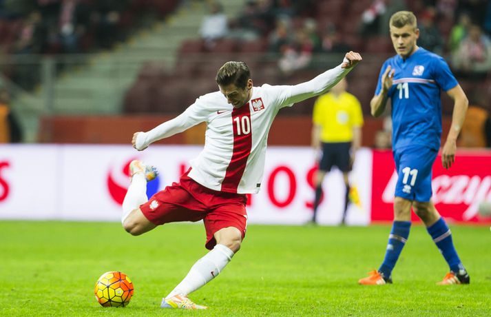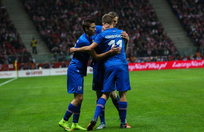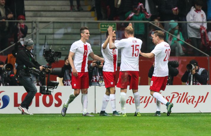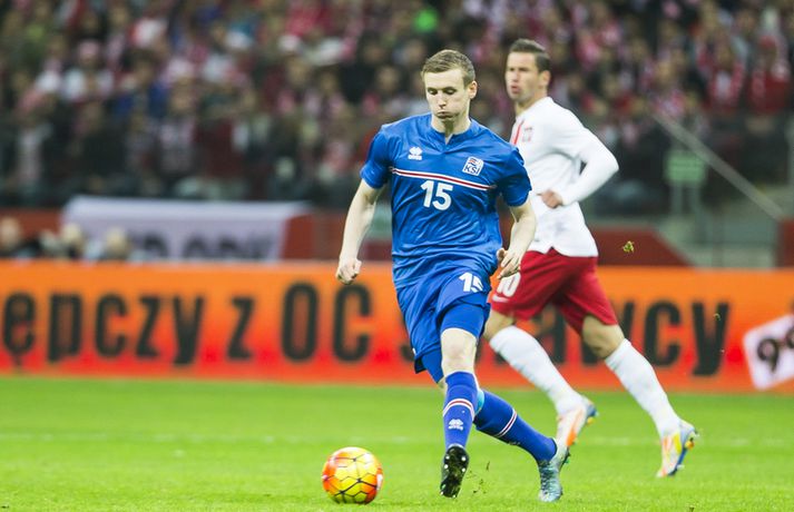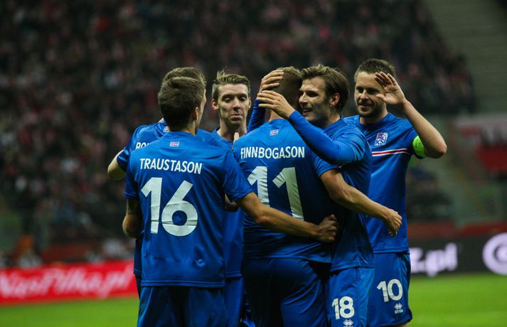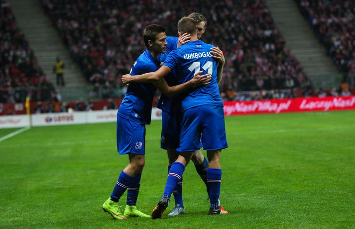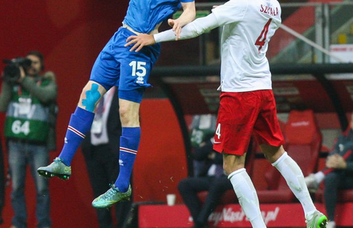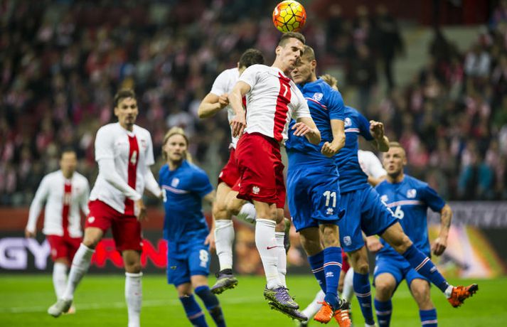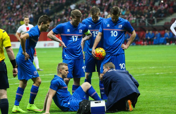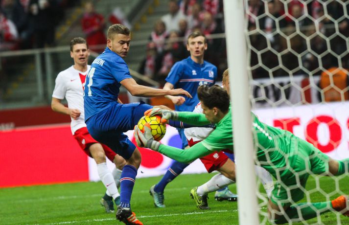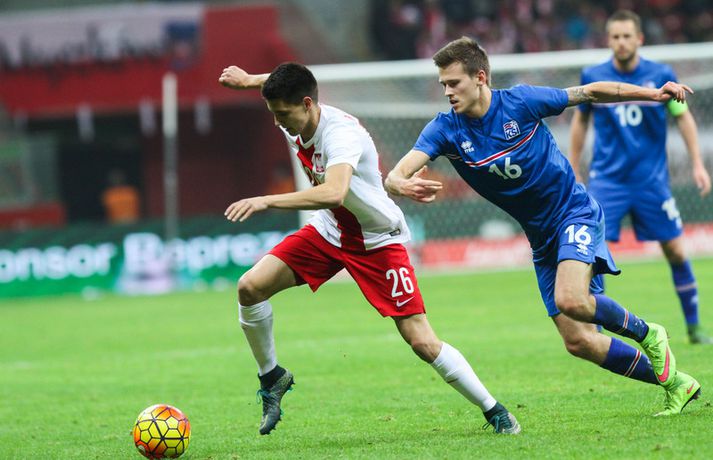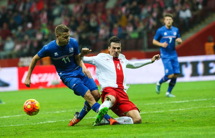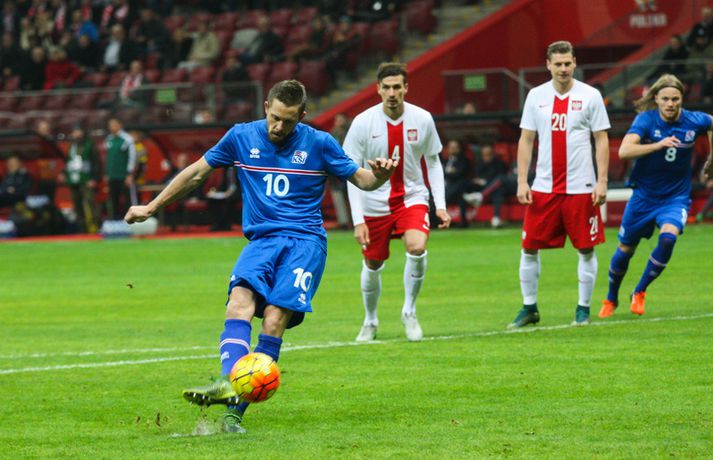 Mjög slakur síðari hálfleikur varð Íslandi að falli í 4-2 tapi gegn Póllandi í vináttulandsleik, en leikið var í Póllandi í kvöld. Ísland leiddi í hálfleik, 1-0. Leikurinn var fyrsti liðurinn í undirbúningi Íslands fyrir undankeppni EM sem fram fer í Frakklandi næsta sumar. Gylfi kom Íslandi yfir í fyrri hálfleik úr vítaspyrnu og staðan var 1-0 í hálfleik. Í síðari hálfleik var vörnin hins vegar götótt og mörkin láku inn. Lokatölur 4-2 sigur Pólverja. Byrjunin hjá Íslandi var draumi líkast. Eftir þrjár mínútur vann Kolbeinn Sigþórsson boltinn rétt fyrir utan teiginn hjá Póllandi, keyrði á vörnina og fiskaði víti. Gylfi Sigurðsson steig á punktinn og skoraði eitt öruggasta víti sem hefur verið tekið á Stadion Narodowy í Varsjá, en Kolbeinn þurfti að fara af velli nokkru síðar vegna meiðsla. Strákarnir héldu vel á spilunum eftir það. Þeir spiluðu agaðan og góðan varnarleik þar sem Aron Einar Gunnarsson stýrði miðjunni mjög vel og þar fyrir aftan voru Ragnar og Hólmar Örn mjög traustir. Inn á milli átti Ísland fínar sóknir. Ein þeirra skilaði nærri marki, en skot Gylfa var þó naumlega framhjá. Ísland einu marki yfir í hálfleik og fyrri hálfleikurinn virkilega jákvæður, bæði varnar- og sóknarlega, en einu neikvæðu fréttirnar voru meiðsli Kolbeins Sigþórssonar.Strákarnir okkar fagna marki Alfreðs.vísir/adam jastrzebowskiÍ hálfleik gerðu Lars og Heimir tvær breytingar. Rúnar Már Sigurjónsson og Theodór Elmar Bjarnason komu inná. Byrjunin á síðari hálfleik var ekki merkileg hjá Íslandi; liðið hélt boltanum illa innan liðsins og Pólverjar færðu sig upp á skaftið. Söknuður af Aroni og Birki sem eru liðinu rosalega mikilvægir. Kamil Grosicki jafnaði svo eftir sjö mínútna leik í síðari hálfleik með hörkuskoti, en þar hefði Ögmundur líklega getað gert betur. Stundarfjórðungi síðar var staðan skyndilega orðni 2-1 og einhverjir héldu þá að Pólverjar myndu salla inn mörkum á okkur, enda var Ísland í vandræðum á þeim tímapunkti. Alfreð Finnbogason var ekki á sama máli. Hann fékk boltann af harðfylgi inn fyrir vörn Pólverja og skoraði með góðu skoti framhjá Szczesny í markin og staðan skyndilega orðin 2-2. Vel gert hjá Alfreð sem hefði þó getað skorað annað mark skömmu síðar, en þá avr hann of lengi að athafna sig og varnarmenn Pólverja komust fyrir. Eftir það snerist leikurinn upp í hendur Pólverja. Þeir fengu góð færi og varnarleikur Ísland í heild sinni var slakur. Robert Lewandowski bætti við tveimur mörkum áður en yfir lauk, en síðara markið átti Ögmundur Kristinsson að verja. Lokatölur 4-2. Aron Einar Gunnarsson fór af velli í hálfeik og í síðari hálfleik fengu strákarnir á sig fjögur mörk. Það þarf ekki stjörnufræðing til að sjá að hann er liðinu gífurlega mikilvægur og jafnvel mikilvægari en einhverjir halda. Varnarleikur liðsins var ekki nægilega góður, þá ser í lagi í síðari hálfleik. Liðið fékk á sig fjögur mörk, en fékk á sig sex mörk í tíu leikjum í undankeppni Evrópumótsins. Ekki gott, en vissulega vantaði Hannes og Kára í öftustu línurnar og spiluðu þeir all flesta leikina í riðlinum. Ísland fékk þó nokkur færi og það er eitthvað jákvætt sem þjálfararnir taka út úr leiknum, en strákarnir okkar hefðu getað skorað fleiri mörk. Hólmar Örn og Ragnar voru ágætir saman, þá sérstaklega í fyrri hálfleik. Gylfi er alltaf yfirvegaður og spilar nánast alltaf vel og nýliðinn Arnór Ingvi komst vel frá frumraun sinni. Hann mun klárlega vera í plönum þjálfaranna í næstu leikjum. Liðið saknaði vinnslusemi Arons Einars og Birkis í síðari hálfleik. Ísland mætir Slóvakíu á þriðjudag og munum við þá líklega fá einhverja aðra tilraunastarfsemi en sást í kvöld. Þar verður athyglisvert að sjá hvort Ingvar Jónsson, Hjörtur Hermannsson, Oliver Sigurjónsson og fleiri fái að spreyta sig.