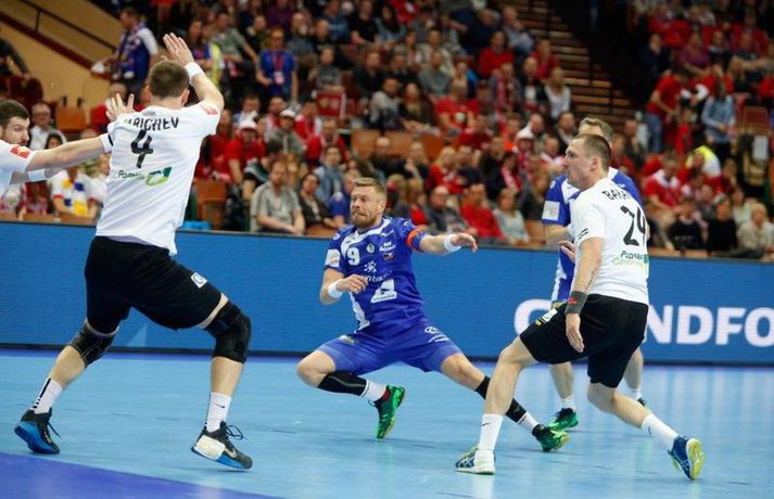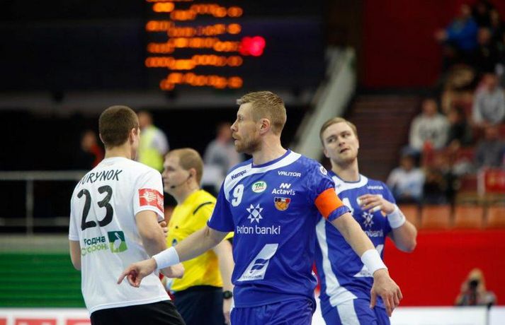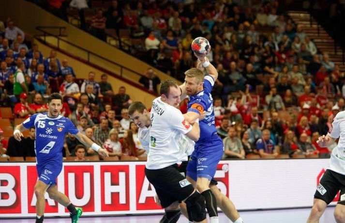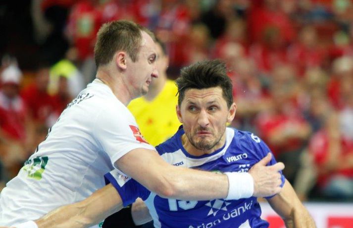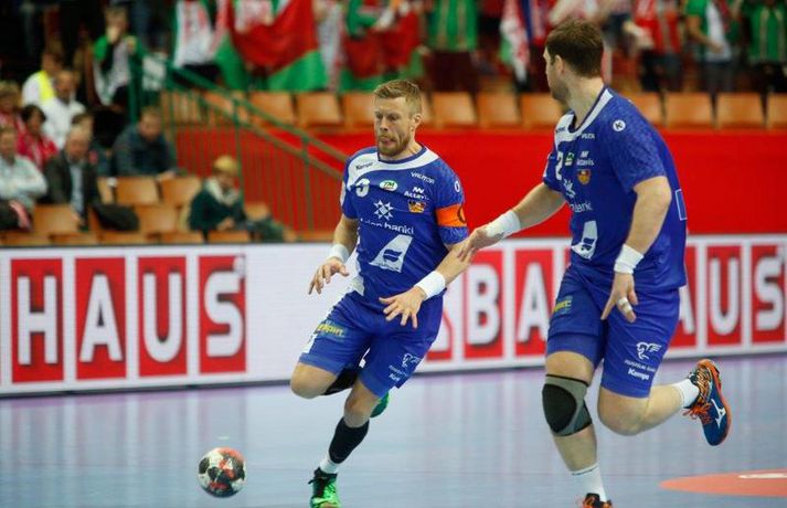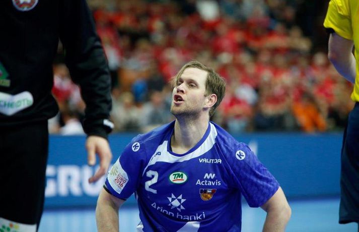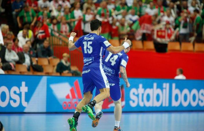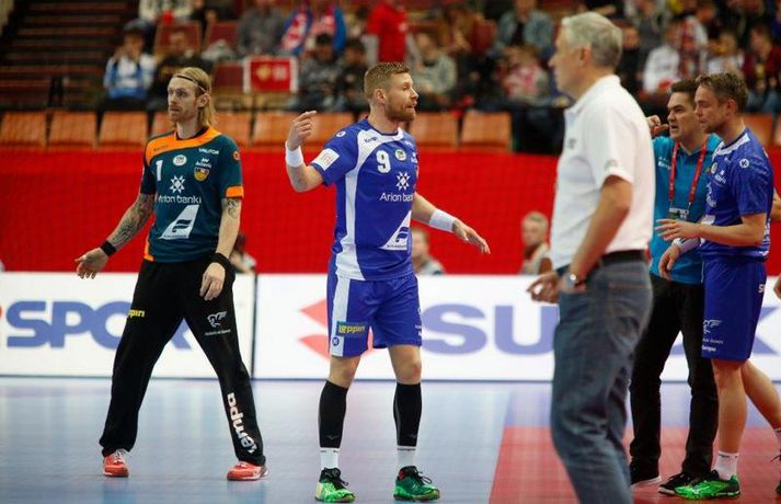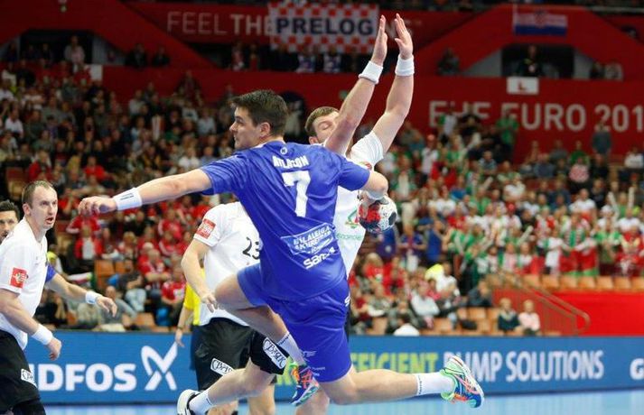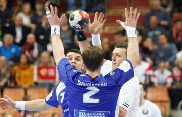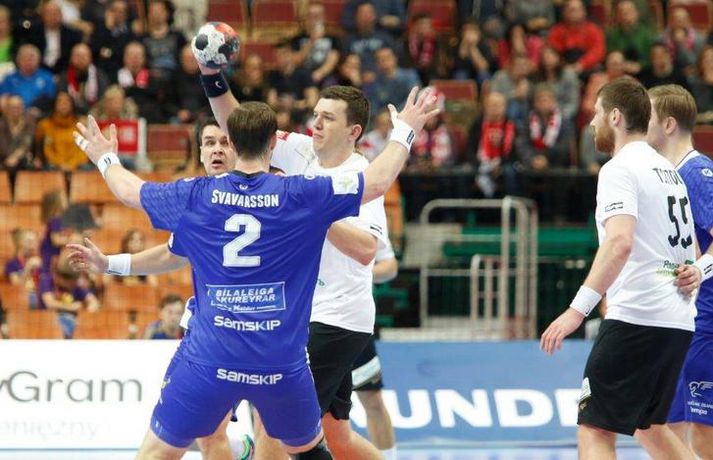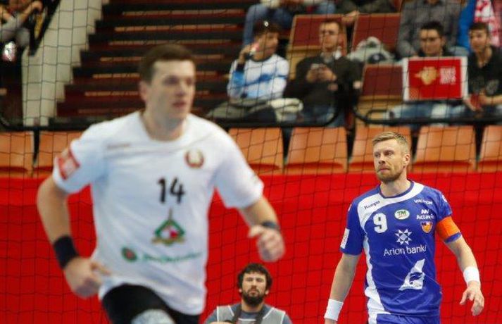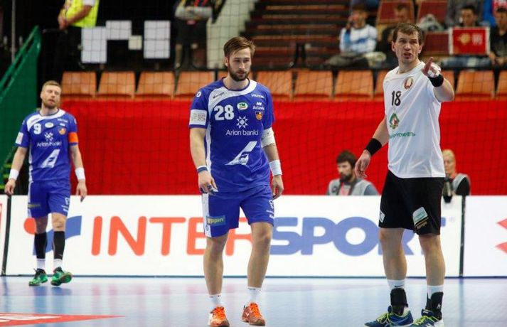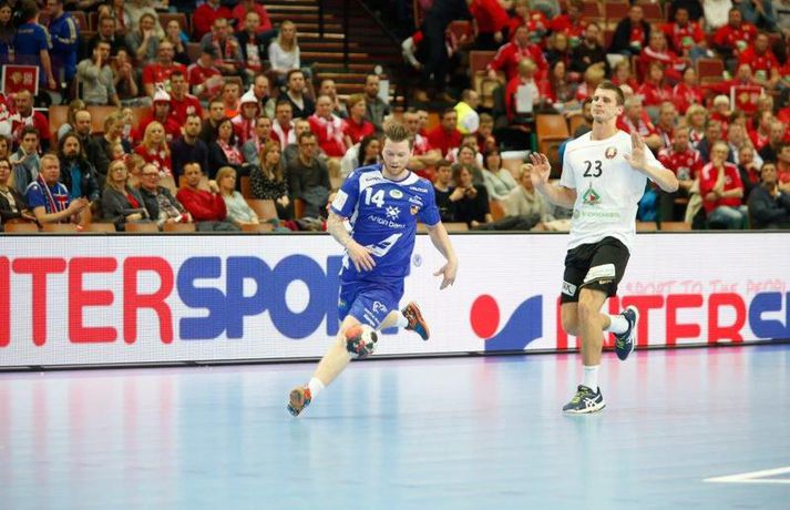 Ísland tapaði fyrir Hvít-Rússum, 38-39, í öðrum leik sínum í B-riðli á Evrópumótinu í Póllandi í dag.Valgarður Gíslason, ljósmyndari Vísis og Fréttablaðsins, var á leiknum og náði þessum myndum hér fyrir ofan. Eins og tölurnar gefa til kynna var sóknarleikur íslenska liðsins í leiknum frábær en varnarleikurinn var stórkostlega lélegur og markvarslan lítil sem engin. Til marks um það hefur íslenska liðið aldrei fengið á sig fleiri mörk í leik á Evrópumóti. Ísland náði fjögurra marka forystu, 24-20, snemma í seinni hálfleik og hefði þá átt að klára dæmið. Það tókst ekki, Hvít-Rússar voru eldsnöggir að jafna og voru svo með frumkvæðið á lokakaflanum og lönduðu að lokum eins marks sigri, 38-39. Ísland er því enn með tvö stig í B-riðli, jafnmörg og Hvít-Rússar og Króatar sem mæta Noregi á eftir. Alexander Petersson var markahæstur í íslenska liðinu með sex mörk. Róbert Gunnarsson, Guðjón Valur Sigurðsson og Arnór Þór Gunnarsson komu næstir með fimm mörk hver. Fyrri hálfleikurinn var mjög frábrugðinn leiknum gegn Noregi, miklu hraðari og mörkin fleiri. Snorri Steinn Guðjónsson kom inn í byrjunarliðið og byrjaði leikinn af krafti. Snorri var beittur og skoraði þrjú af fyrstu átta mörkum íslenska liðsins. Ásgeir Örn Hallgrímsson átti einnig góðan fyrri hálfleik og skoraði þrjú mörk úr fjórum skotum. Íslenski sóknarleikurinn gekk smurt þrátt fyrir að Aron Pálmarsson væri tekinn út en alls komust níu leikmenn Íslands á blað í fyrri hálfleik. Eina áhyggjuefnið voru tapaðir boltar sem voru sex í fyrri hálfleik. Varnarleikurinn var hins vegar hörmulegur, ólíkt því sem var gegn Noregi. Björgvin Páll Gústavsson byrjaði leikinn vel en varði aðeins tvö skot á síðustu 15 mínútum fyrri hálfleiks. Ísland var með frumkvæðið í fyrri hálfleiknum en tókst aldrei að slíta sig frá Hvít-Rússunum sem eru ólseigir. Íslensku strákarnir leiddu með einu marki í hálfleik, 18-17, og ljóst að þeir þyrfti að bæta varnarleikinn í seinni hálfleik. Sú varð þó ekki raunin. Íslenska liðið byrjaði seinni hálfleikinn af krafti og þegar sjö mínútur voru liðnar af honum var staðan orðin 24-20 og útlitið gott. Það forskot hvarf eins og dögg fyrir sólu. Hvít-Rússarnir jöfnuðu í 24-24 gegn varnarlausum Íslendingum. Lærisveinar Yuri Shetsov keyrðu grimmt í bakið á íslenska liðinu, skoruðu 10 mörk úr hraðaupphlaupum auk nokkurra marka eftir hraða miðju. Liðin skiptust á að skora næstu mínúturnar en smám saman náðu Hvít-Rússar yfirhöndinni. Sóknarleikur þeirra gekk smurt gegn skelfilega slakri íslenskri vörn. Það var sama hvað Hvít-Rússar gerðu, það gekk allt upp á meðan íslensku varnarmennirnir stóðu og horfðu á. Markvarslan var sömuleiðis engin. Hvít-Rússar voru sem áður sagði á undan að skora á lokakaflanum en alltaf jöfnuðu Íslendingar. Alexander fór á kostum í seinni hálfleik og skoraði að vild. Róbert var sömuleiðis öflugur inni á línunni en hann nýtti öll fimm skot sín í leiknum. Siarhei Shylovich kom Hvíta-Rússlandi í 38-37 þegar rúmar tvær mínútur voru eftir. Næsta sókn Íslands gekk erfiðlega og endaði með skoti Alexanders í hvít-rússnesku vörnina. Hvít-Rússar fóru í sókn og voru við það að fá dæmda á sig leiktöf þegar Shevtsov tók leikhlé. Að því loknu stilltu Hvít-Rússar upp í kerfi fyrir Uladzislau Kulesh sem þrumaði boltanum í netið og jók muninn í 39-37. Aron Kristjánsson tók leikhlé þegar 35 sekúndur voru eftir. Ísland þurfti mark sem fyrst og Arnór Þór fékk dauðafæri til að minnka muninn í eitt mark en Viachaslau Saldatsenka varði skot hans. Hvít-Rússar töpuðu boltanum strax aftur og Vignir Svavarsson minnkaði muninn í 38-39 en tíminn til að jafna metin var einfaldlega of lítill. Lokatölur 38-39, Hvíta-Rússlandi í vil. Ísland mætir Króatíu í lokaleik sínum í B-riðli á þriðjudaginn.vísir/valliAlexander Petersson, besti maður íslenska liðsins, svekktur í leikslok.Vísir/Valli