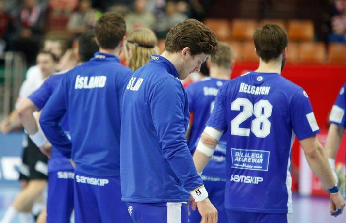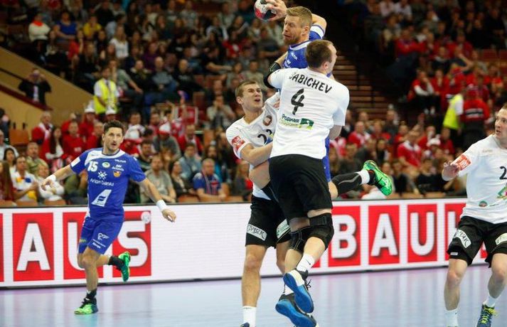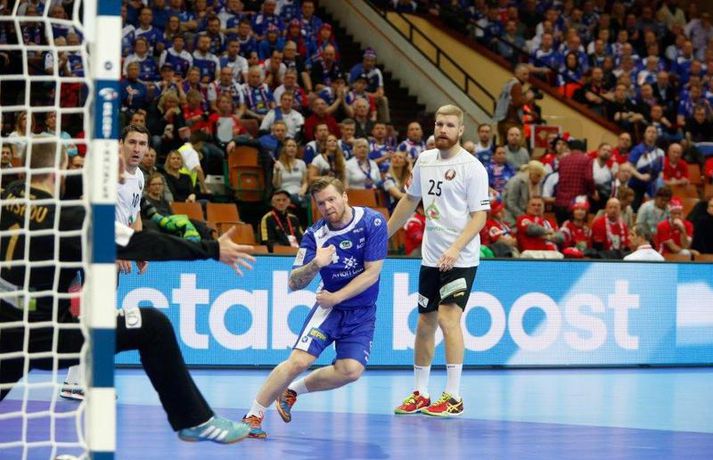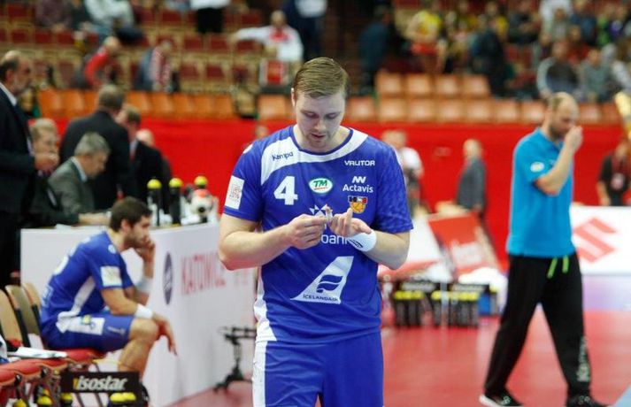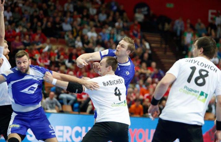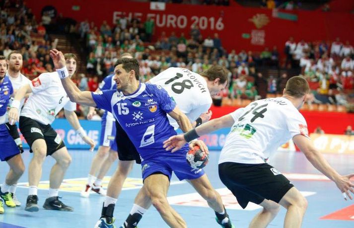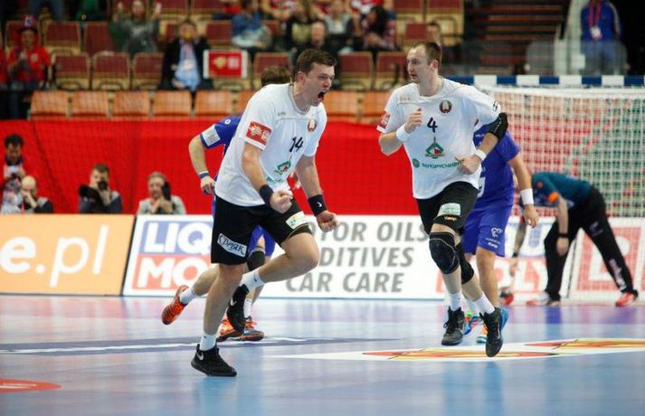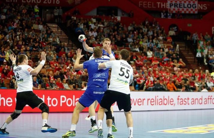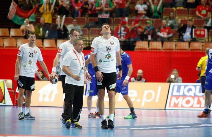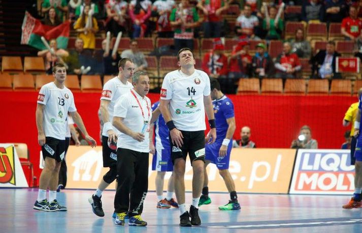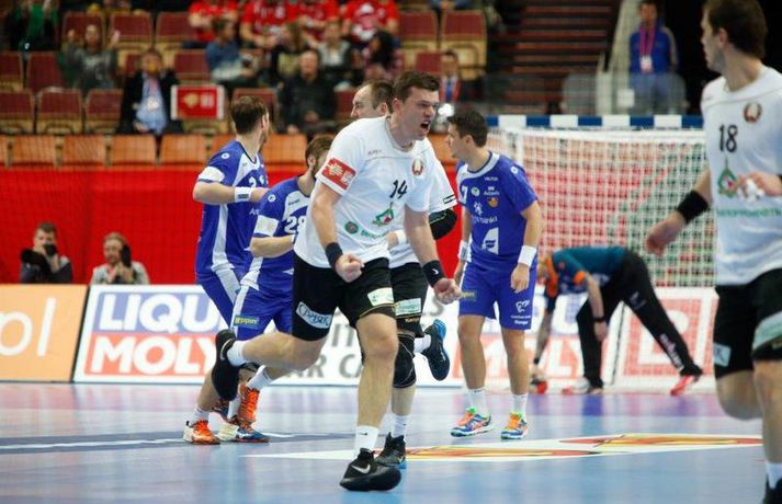 Umfjöllun og myndir: Ísland - Hvíta Rússland 38-39 | Varnarleysi í Katowice 17. janúar 2016 17:00 Ísland tapaði fyrir Hvít-Rússum, 38-39, í öðrum leik sínum í B-riðli á Evrópumótinu í Póllandi í dag.Valgarður Gíslason, ljósmyndari Vísis og Fréttablaðsins, var á leiknum og náði þessum myndum hér fyrir ofan. Eins og tölurnar gefa til kynna var sóknarleikur íslenska liðsins í leiknum frábær en varnarleikurinn var stórkostlega lélegur og markvarslan lítil sem engin. Til marks um það hefur íslenska liðið aldrei fengið á sig fleiri mörk í leik á Evrópumóti. Ísland náði fjögurra marka forystu, 24-20, snemma í seinni hálfleik og hefði þá átt að klára dæmið. Það tókst ekki, Hvít-Rússar voru eldsnöggir að jafna og voru svo með frumkvæðið á lokakaflanum og lönduðu að lokum eins marks sigri, 38-39. Ísland er því enn með tvö stig í B-riðli, jafnmörg og Hvít-Rússar og Króatar sem mæta Noregi á eftir. Alexander Petersson var markahæstur í íslenska liðinu með sex mörk. Róbert Gunnarsson, Guðjón Valur Sigurðsson og Arnór Þór Gunnarsson komu næstir með fimm mörk hver. Fyrri hálfleikurinn var mjög frábrugðinn leiknum gegn Noregi, miklu hraðari og mörkin fleiri. Snorri Steinn Guðjónsson kom inn í byrjunarliðið og byrjaði leikinn af krafti. Snorri var beittur og skoraði þrjú af fyrstu átta mörkum íslenska liðsins. Ásgeir Örn Hallgrímsson átti einnig góðan fyrri hálfleik og skoraði þrjú mörk úr fjórum skotum. Íslenski sóknarleikurinn gekk smurt þrátt fyrir að Aron Pálmarsson væri tekinn út en alls komust níu leikmenn Íslands á blað í fyrri hálfleik. Eina áhyggjuefnið voru tapaðir boltar sem voru sex í fyrri hálfleik. Varnarleikurinn var hins vegar hörmulegur, ólíkt því sem var gegn Noregi. Björgvin Páll Gústavsson byrjaði leikinn vel en varði aðeins tvö skot á síðustu 15 mínútum fyrri hálfleiks. Ísland var með frumkvæðið í fyrri hálfleiknum en tókst aldrei að slíta sig frá Hvít-Rússunum sem eru ólseigir. Íslensku strákarnir leiddu með einu marki í hálfleik, 18-17, og ljóst að þeir þyrfti að bæta varnarleikinn í seinni hálfleik. Sú varð þó ekki raunin. Íslenska liðið byrjaði seinni hálfleikinn af krafti og þegar sjö mínútur voru liðnar af honum var staðan orðin 24-20 og útlitið gott. Það forskot hvarf eins og dögg fyrir sólu. Hvít-Rússarnir jöfnuðu í 24-24 gegn varnarlausum Íslendingum. Lærisveinar Yuri Shetsov keyrðu grimmt í bakið á íslenska liðinu, skoruðu 10 mörk úr hraðaupphlaupum auk nokkurra marka eftir hraða miðju. Liðin skiptust á að skora næstu mínúturnar en smám saman náðu Hvít-Rússar yfirhöndinni. Sóknarleikur þeirra gekk smurt gegn skelfilega slakri íslenskri vörn. Það var sama hvað Hvít-Rússar gerðu, það gekk allt upp á meðan íslensku varnarmennirnir stóðu og horfðu á. Markvarslan var sömuleiðis engin. Hvít-Rússar voru sem áður sagði á undan að skora á lokakaflanum en alltaf jöfnuðu Íslendingar. Alexander fór á kostum í seinni hálfleik og skoraði að vild. Róbert var sömuleiðis öflugur inni á línunni en hann nýtti öll fimm skot sín í leiknum. Siarhei Shylovich kom Hvíta-Rússlandi í 38-37 þegar rúmar tvær mínútur voru eftir. Næsta sókn Íslands gekk erfiðlega og endaði með skoti Alexanders í hvít-rússnesku vörnina. Hvít-Rússar fóru í sókn og voru við það að fá dæmda á sig leiktöf þegar Shevtsov tók leikhlé. Að því loknu stilltu Hvít-Rússar upp í kerfi fyrir Uladzislau Kulesh sem þrumaði boltanum í netið og jók muninn í 39-37. Aron Kristjánsson tók leikhlé þegar 35 sekúndur voru eftir. Ísland þurfti mark sem fyrst og Arnór Þór fékk dauðafæri til að minnka muninn í eitt mark en Viachaslau Saldatsenka varði skot hans. Hvít-Rússar töpuðu boltanum strax aftur og Vignir Svavarsson minnkaði muninn í 38-39 en tíminn til að jafna metin var einfaldlega of lítill. Lokatölur 38-39, Hvíta-Rússlandi í vil. Ísland mætir Króatíu í lokaleik sínum í B-riðli á þriðjudaginn.vísir/valliAlexander Petersson, besti maður íslenska liðsins, svekktur í leikslok.Vísir/Valli EM 2016 karla í handbolta Mest lesið Vonast til að komast í Kórinn: „Menn hafa aldrei séð annað eins“ Fótbolti Fær þrjár milljónir á dag næstu sex árin fyrir að gera ekkert Sport Stöðufundur í Laugardal klukkan 10:30 Fótbolti Enska úrvalsdeildin í jólaköttinn Enski boltinn Elsta konan til klára Járnkarlinn Sport Nýi íþróttastjóri Kjartans stal mörgæs og endaði í fangelsi í Singapúr Fótbolti Markvörður Inter banaði háöldruðum manni í hjólastól Sport Brendan Rodgers sagði starfinu sínu lausu eftir ásakanir Fótbolti Tyrkneska sambandið segir dómara hafa veðjað á þúsundir leikja Fótbolti Einkaviðtal við Carrick: „Hálfgerð tískubylgja sem einkennir fótboltann í dag“ Enski boltinn Fleiri fréttir Gísli bjó til meira en þriðjung markanna Haukur magnaður í sigri Löwen Blær skoraði þrjú og lagði upp jöfnunarmarkið KA/Þór sótti sigur gegn Fram og stigalausar Stjörnukonur Fram kjöldró HK og spenna í Eyjum Meistararnir unnu gegn ÍBV og ÍR hafði betur gegn Selfyssingum Donni og félagar björguðu stigi undir lokin Afturelding komst upp að hlið Hauka Seldu bleika búninginn hennar Herrem fyrir meira en milljón „Leið vel þegar ég fór inn úr færinu“ Uppgjörið FH - Haukar 27-26 | Birgir Már tryggði FH sigur eftir spennutrylli Bernard fór mikinn en Valsmenn sluppu með sigurinn Fyrsti sigur Þórsara síðan í byrjun september Ómar Ingi með fullkomnan leik í Meistaradeildinni Guðjón Valur og lærisveinar hársbreidd frá því að vinna Kiel Hlakka til að sjá Viktor Gísla aftur og senda honum skilaboð Neyddar í sömu stöðu og Ísland og límdu melónur
