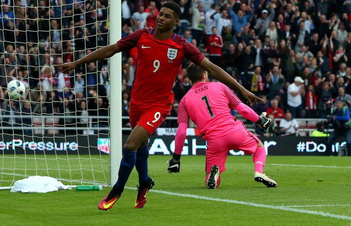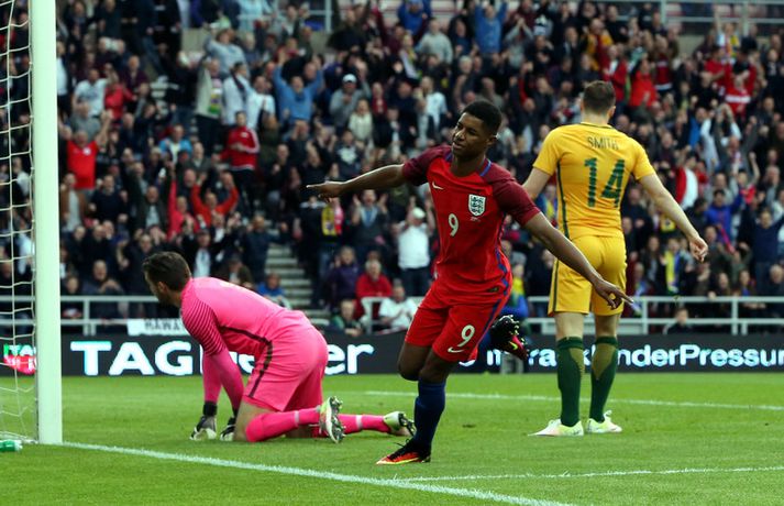 England vann 2-1 sigur á Ástralíu í vináttulandsleik í Sunderland í kvöld en þetta var síðasti landsleikur Englendinga áður en Roy Hodgson sker hópinn niður um þrjá og velur þá 23 sem fara á Evrópumótið í Frakklandi. Gamli og nýi tíminn hjá Manchester United og enska landsliðinu sáum um mörkin í leiknum í kvöld. Hinn átján ára gamli Marcus Rashford skoraði eftir aðeins 135 sekúndur í sínum fyrsta landsleik og hinn þrítugi Wayne Rooney skoraði síðan í fyrsta sinn á landsliðsferlinum eftir að hafa komið inná sem varamaður. Báðir settu þeir met með þessum mörkum. Marcus Rashford var yngsti leikmaður enska landsliðsins sem skorar í sínum fyrsta landsleik og Wayne Rooney bætti við markamet sitt hjá landsliðinu og hefur nú skorað 52 mörk fyrir England. Marcus Rashford skoraði með sínu fyrsta skoti í sínum fyrsta leik með Manchester United, bæði í Evrópukeppni og ensku úrvalsdeildinni og hann lék það eftir í kvöld. Markið skoraði Rashford á 3. mínútu leiksins eftir að fyrirgjöf Raheem Sterling fór í varnarmann og datt fyrir hann í teignum. Wayne Rooney kom inná sem varamaður fyrir Adam Lallana í hálfleik og hann kom enska liðinu í 2-0 á 55. mínútu með laglegu langskoti eftir hraða sókn og sendingu frá Raheem Sterling. Eric Dier, leikmaður Tottenham, var ekki jafnheppinn og United-mennirnir þegar hann varð fyrir því að skalla boltann í gegnum klofið á markverðinum Fraser Forster og í eigið mark. Jose Mourinho tók við liði Manchester United í dag og nokkrum tímum seinna skora tveir verðandi leikmenn hans fyrir enska landsliðið. Hvort að það sé fyrirboði á tíma Mourinho á Old Trafford á hinsvegar eftir að koma í ljós.vísir/getty
