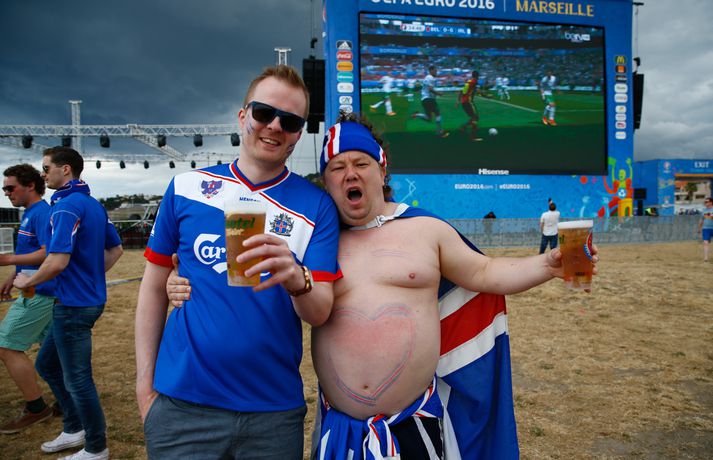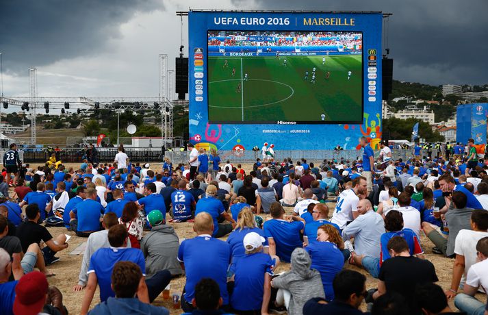 Um níu þúsund Íslendingar hvöttu strákana okkar til dáða í baráttunni gegn Ungverjum á Stade Vélodrome í gær. Eins og alþjóð veit voru okkar menn nokkrum mínútum frá fræknum sigri en eru þó enn ósigraðir á EM eftir tvo leiki. Marseille var undirlögð íslenskum og ungverskum stuðningsmönnum fyrir leik. Stærstur hluti Íslendinga kom við á ströndinni þar sem stuðningsmannasvæðið í Marseille er staðsett. Veðrið hefur verið betra á suðurströnd Frakklands en nokkuð blés auk þess sem óveðursský létu sjá sig. Sem betur fer kom ekki til úrhellis og voru sumir Íslendingar berir að ofan og unnu í taninu. Vilhelm Gunnarsson, ljósmyndari Fréttablaðsins og Vísis, myndaði Íslendinga á stuðningsmannasvæðinu í gær.