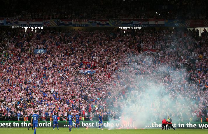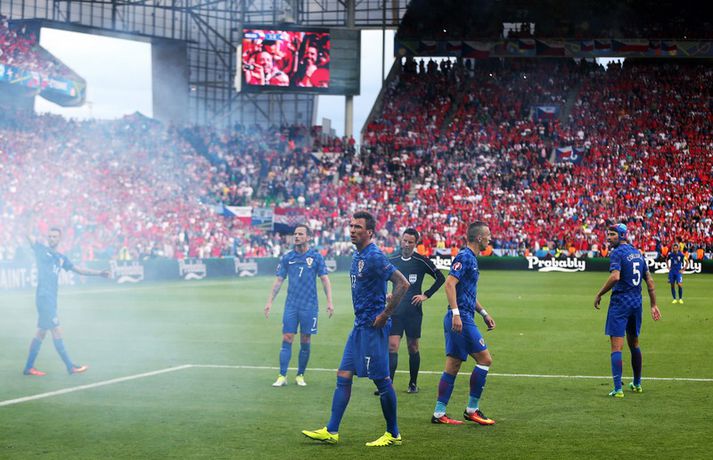 Framkoma stuðningsmanna Króatíu í leiknum á móti Tékkum í gær mun hafa afleiðingar í för með sér fyrir króatíska knattspyrnusambandið. Hversu miklar afleiðingar kemur ekki í ljós fyrr en á mánudaginn. Ólæti króatísku stuðningsmannanna í Tékkaleiknum eru nú til meðferðar hjá aga- og siðanefnd UEFA og mun hún skila niðurstöðum sínum á mánudaginn. Það má búast við stórri sekt en það eru einnig uppi vangaveltur um framtíð króatíska landsliðsins á EM í Frakklandi. Króatarnir eru kærðir fyrir að kveikja á blysum inn á vellinum og kasta þeim inn á völlinn, sprengja púðurkerlingar, kasta hlutum inn á völlinn, almenn ólæti áhorfenda sem og kynþóttaformdóma í stúkunni. Ástandið í króatísku stúkunni var allt annað en fallegt. Mark Clattenburg, dómari leiks Króatíu og Tékklands, þurfti að stöðva leikinn á 86. mínútu þegar króatísku áhorfendurnir tóku upp á því að kasta blysum inn á völlinn. Staðan var þá 2-1 fyrir Króatíu en króatíska liðið var með mikla yfirburði lengst af í þessum leik.Sjá einnig:Þjálfari Króatíu: Þetta eru íþróttahryðjuverkamenn Leikmenn Króata reyndu að róa stuðningsmenn sína og segja þeim að hætta þessu en lítið gekk. Það varð um fimm mínútna töf á leiknum og króatíska liðið virtist í hálfgerðu sjokki þegar leikurinn hófst á ný. Tékkarnir nýttu sér það og tryggðu sér stig með því að jafna metin. Stuðningsmenn Tyrkja voru líka kærðir fyrir hegðun sína í leiknum á móti Spáni en Spánverjar unnu þann leik örugglega 3-0. Það sem gerir málið enn alvarlegra fyrir þessar tvær þjóðir er að UEFA fékk líka inn á sitt borð mál tengdum hegðun áhorfenda þegar Króatía og Tyrkland mættust 12. júní síðastliðinn. Rússar eru á skilorði og fengu 150 þúsund evra sekt vegna framkomu áhorfenda þeirra í leik á móti Englandi.