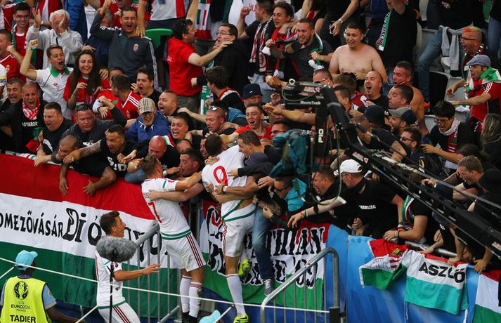 Skoraði sitt fyrsta mark í 18 mánuði og Ungverjar unnu Austurríki á EM Óskar Ófeigur Jónsson skrifar 14. júní 2016 17:45 Ungverjar fagna marki sínu með stuðningsmönnunum í stúkunni. Vísir/Getty Ein óvæntustu úrslit Evrópumótsins til þessa litu dagsins ljós í fyrsta leiknum í riðli Íslands þegar Ungverjar unnu 2-0 sigur á Austurríki. Sigurinn var fyllilega sanngjarn enda stóð ungverska liðið sig frábærlega í kvöld. Adam Szalai var hetja ungverska liðsins en framherjinn sem hafði ekki skorað fyrir félagslið eða landslið í átján mánuði skoraði fyrra mark Ungverja á 63. mínútu. Varamaðurinn Zoltán Stieber innsiglaði síðan sigurinn á 87. mínútu. Austurríkismenn enduðu leikinn manni færri því Aleksandar Dragovic fékk sitt annað gula spjald á 66. mínútu eða aðeins fjórum mínútum eftir að Ungverjar komust í 1-0. Það var mikið búist við af austurríska liðinu fyrir Evrópumótið en frammistaða þess í kvöld var ekki sannfærandi. Ungverjar unnu aftur á móti frábæran sigur og hafa með honum opnað riðilinn upp á gátt. Gábor Király, markvörður Ungverja, varð í kvöld elsti leikmaður EM frá upphafi og hélt upp á metið með því að halda marki sínu hreinu. Það hefði þó getað endað öðruvísi. Austurríkismenn fengu næstum því draumabyrjun þegar David Alaba skaut í stöngina eftir aðeins 30 sekúndur og austurríska liðið fékk hættulegri færi í fyrri hálfleiknum. Ungverska liðið var samt alls ekki síðri aðilinn í fyrri hálfleiknum og Balázs Dzsudzsák fékk fínasta færi undir lok fyrri hálfleiksins. Adam Szalai kom Ungverjum í 1-0 á 62. mínútu eftir frábært þríhyrningsspil við y László Kleinheisler sem sendi boltann á hárréttum tíma inn í teig þar sem Szalai lagði hann undir markvörðinn og í markið. Szalai hafði ekki skorað fyrir landslið eða félagslið síðan árið 2014. Zoltán Stieber kom inná sem varamaður á 79. mínútu og hann innsiglaði sigurinn eftir skyndisókn á 87. mínútu. Næsti leikur ungverska liðsins er á móti Íslandi á laugardaginn en Austurríkismanna bíður erfiður leikur á móti Portúgal. EM 2016 í Frakklandi Mest lesið Bíll Shaquille O'Neal enn ófundinn Körfubolti Uppgjörið: Ísland - Norður-Írland 3-0 | Áfram hluti af elítunni Íslenski boltinn Fluttu fréttir af snjónum í Reykjavík Fótbolti Formaðurinn hjálpaði til við að moka völlinn Fótbolti Búið að finna leiðina til að pirra og vinna Liverpool Enski boltinn Snjóbræðslukerfi Þróttar kom KSÍ til bjargar Fótbolti Tölur úr Bestu 2025: Klúðraði langflestum dauðafærum í sumar Íslenski boltinn Epicbet sýni handboltann í leyfisleysi: „Enda ólöglegar síður“ Handbolti Skiptiborð hjá stelpunum í kvöld Körfubolti Segja spurningar vakna um stöðu Elísabetar Fótbolti Fleiri fréttir Liverpool - Crystal Palace | Eru Ernirnir komnir með tak? Viktor Bjarki skoraði og lagði upp í fyrsta byrjunarliðsleiknum Uppgjörið: Ísland - Norður-Írland 3-0 | Áfram hluti af elítunni Pedri gæti verið frá keppni til langs tíma Arteta fyrstur stjóranna á fætur Þorsteinn breytir engu á milli leikja Snjóbræðslukerfi Þróttar kom KSÍ til bjargar Tölur úr Bestu 2025: Klúðraði langflestum dauðafærum í sumar Segja spurningar vakna um stöðu Elísabetar Litu á hann sem risaeðlu en sjáið hvað er í tísku núna Formaðurinn hjálpaði til við að moka völlinn Formenn sambandanna hjálpuðu við að moka völlinn Real Madrid mun ekki refsa Vinícius Júnior Fluttu fréttir af snjónum í Reykjavík Sýknaður í alvarlegu ofbeldismáli Búið að finna leiðina til að pirra og vinna Liverpool Sú leikjahæsta leggur skóna á hilluna og klárar læknanámið Stuðningsmaður RB Leipzig lést á bikarleiknum í gærkvöldi Arteta óttast ekki að keppinautarnir steli undrabarninu frá honum FH bíður með að tilkynna nýjan þjálfara Óskar Hrafn fer ekki fet Spánn og Þýskaland mætast í úrslitum Anguissa hetja meistaranna Hákon Rafn hélt hreinu þegar Brentford flaug áfram Jón Dagur gulltryggði sigurinn með sínu fyrsta marki Leikið á Þróttaravelli á miðvikudag Vinícius Júnior íhugar að yfirgefa Real Madríd Kaupir sér tveggja milljarða króna hús Alexander Máni með fimm mörk í tveimur leikjum og Ísland áfram Birnir frá Akureyri í Garðabæ Sjá meira
