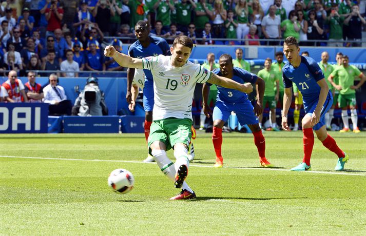 Antoine Griezmann sá um að skjóta Frakklandi í átta liða úrslit EM, en hann skoraði bæði mörk liðsins í 2-1 sigri á Írlandi. Frakkar mæta annað hvort Íslandi eða Englandi í átta liða úrslitum keppninnar. Leikið var á Parc Olympique Lyonnais leikvanginum í Lyon og það voru ekki liðnar nema 59 sekúndur þegar Írar fengu víti. Paul Pogba féll þá Shane Long, en Robie Brady steig á punktinn og skoraði. Frakkarnir byrjuðu strax að þjarma að marki Íra, en tókst ekki að koma boltanum í netið í fyrri hálfleik og Írar leiddu því í hálfleik 1-0. Didier Deschamps tók N'Golo Kanté útaf í hálfleik og setti hinn sóknarþenkjandi Kingsley Coman inná. Frakkar ætluðu að blása til sóknar og það bar árangur. Á 57. mínútu jafnaði Antoine Griezmann með frábærum skalla eftir laglega fyrirgjöf Bacary Sagna, en þetta var annað mark Griezmann í keppninni. Griezmann var ekki hættur því fjórum mínútum síðar var hann aftur á ferðinni, en nú skoraði hann eftir undirbúning Arsenal-mannsins Oliver Giroud sem skallaði boltann fyrir fætur Griezmann. Ekki skánaði ástandið fyrir Írland þegar Shane Duffy fékk að líta beint rautt spjald á 66. mínútu þegar hann klippti niður títtnefndar Griezmann sem var að sleppa einn í gegn. Frakkar sigldu sigrinum svo í höfn án nokkura vandræða, en Írarnir ógnuðu lítið einum færri. Gestgjafarnir því komnir í átta liða úrslitin og mæta þar annað hvort okkur Íslendingum eða Englandi, en þau mætast á morgun.Hræðileg byrjun fyrir gestgjafana. Pogba fær á sig víti sem Brady skorar örugglega úr. 1-0 fyrir #IRL #EMÍsland https://t.co/yuzj5uEyGD— Síminn (@siminn) June 26, 2016 Griezmann jafnar og kemur svo Frökkum yfir: #FRA komið yfir! Griezmann með 2 mörk á örfáum mínútum! #EMÍsland https://t.co/7N0vGDQRma— Síminn (@siminn) June 26, 2016