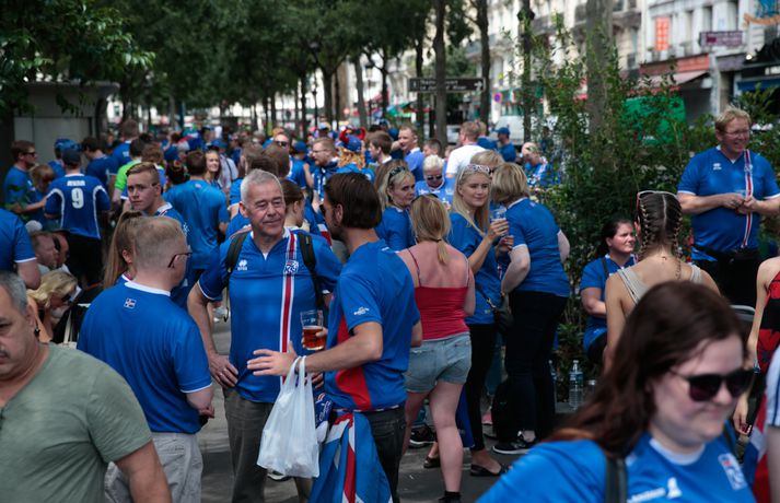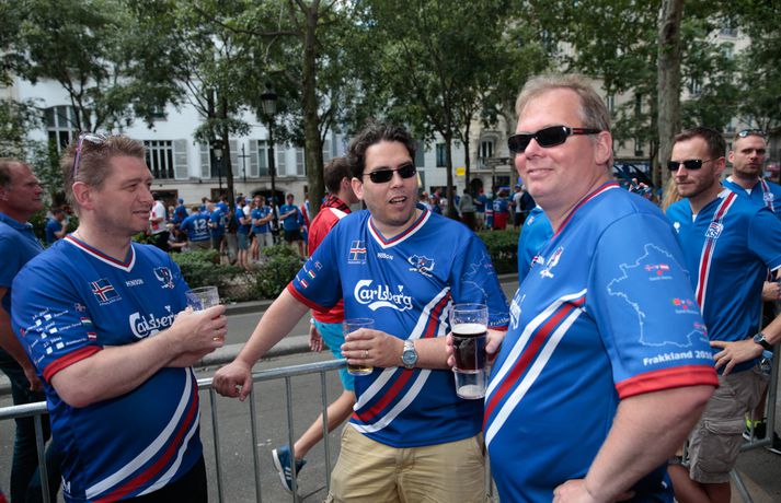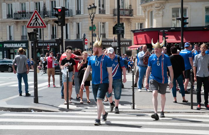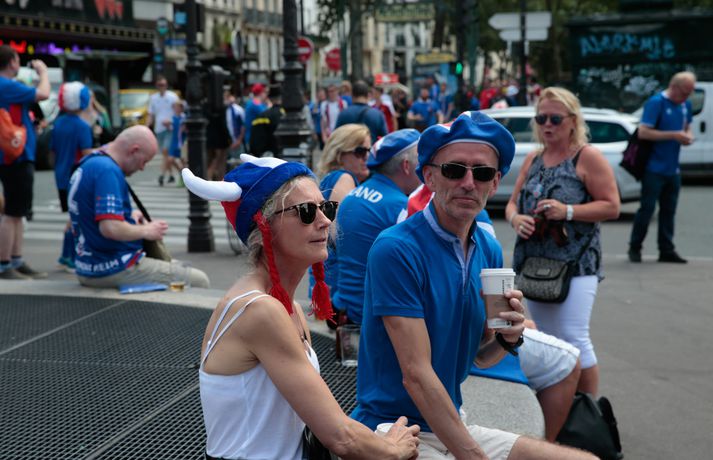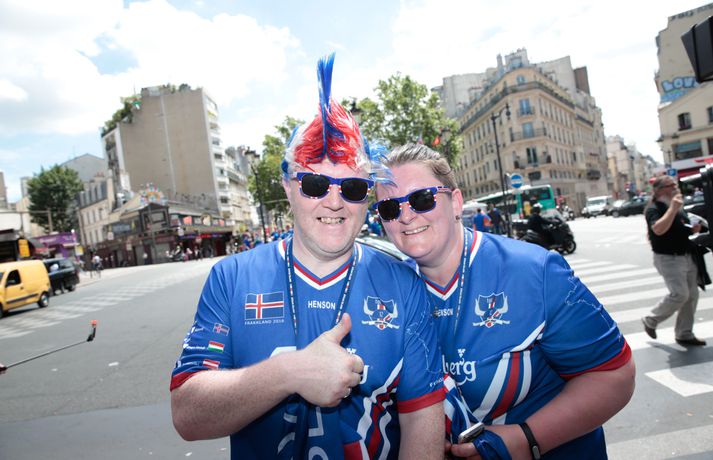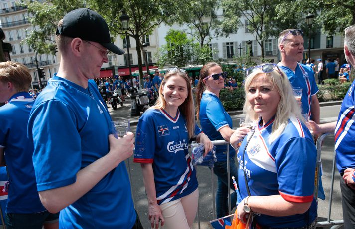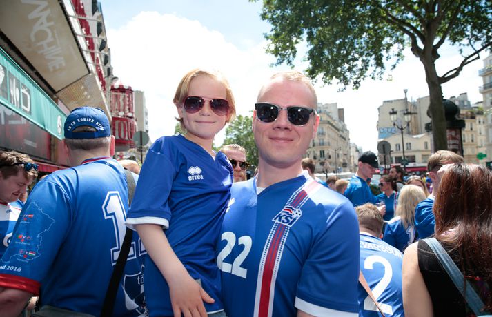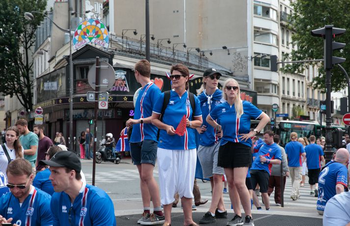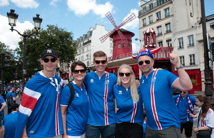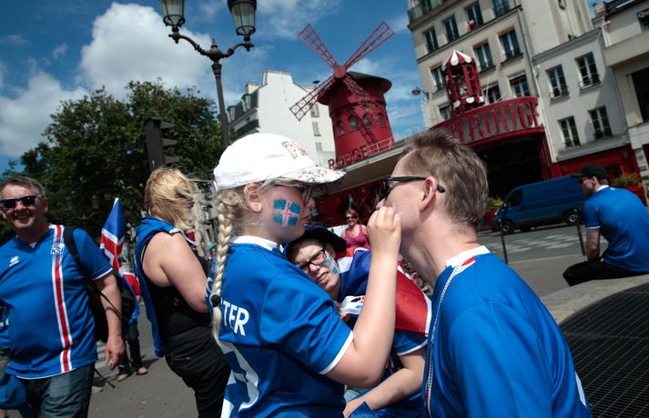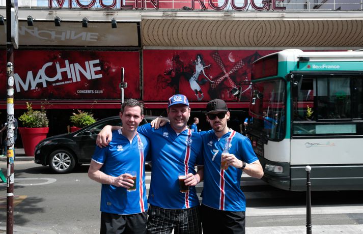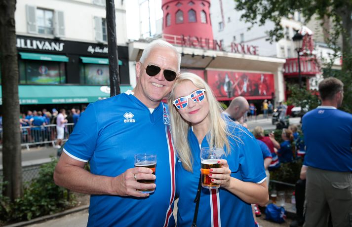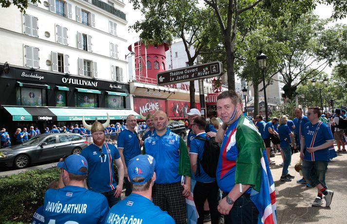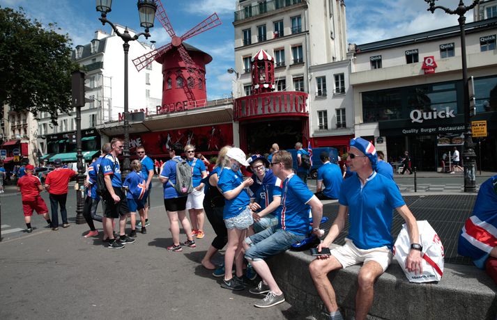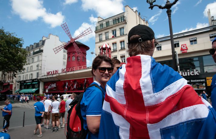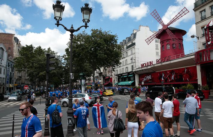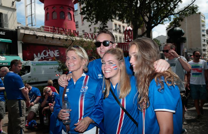 Um 10.000 Íslendingar eru mættir til Parísar og verða leik Íslands og Austurríkis í F-riðli EM 2016 sem hefst klukkan 18.00 að staðartíma á Stade de France, þjóðarleikvangi Frakka. Leikurinn er mikilvægur fyrir bæði lið en strákana okkar vantar aðeins eitt stig til þess að komast áfram í 16 liða úrslitin en Ísland er að taka þátt á stórmóti í fyrsta sinn. Stuðningsmenn íslenska liðsins hittust á og fyrir utan írska barinn O'Sullivans í Moulin Rouge-hverfinu í París upp úr hádegi í dag en þaðan verður farið á völlinn um klukkan 15.00. Rauða Myllan sjálf er við hliðina á írska barnum og má því segja að hún hafi verið máluð blá af hressum og kátum íslenskum stuðningsmönnum í París í dag. Vilhelm Gunnarsson, ljósmyndari Fréttablaðsins og Vísis, var á Íslendingafögnuðinum í dag og tók myndirnar sem sjá má. Ekki missa af neinu sem gerist á EM í Frakklandi. Vísir er með hóp fjölmiðlamanna á mótinu sem færa ykkur allar nýjustu fréttirnar af strákunum okkar. Fylgdu okkur á Facebook, Twitter og Snapchat (sport365).