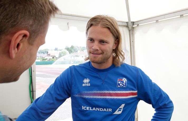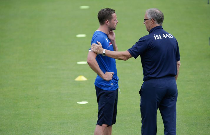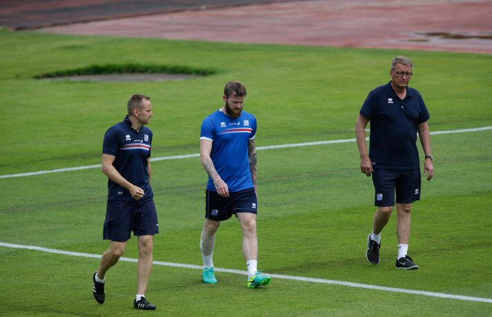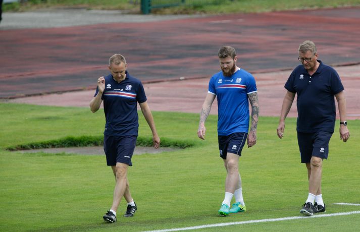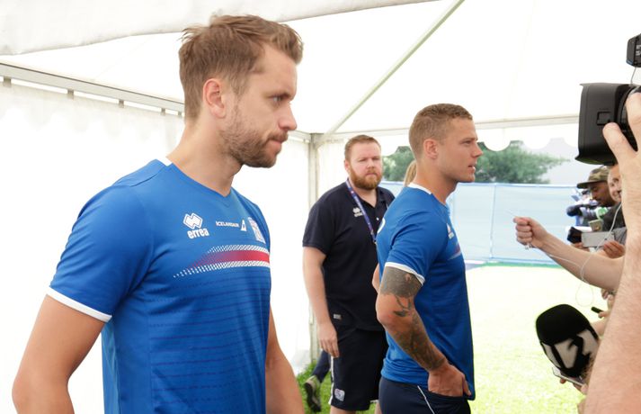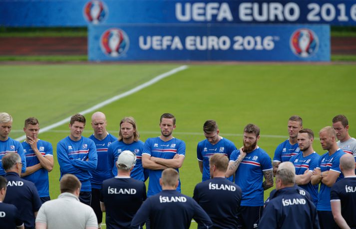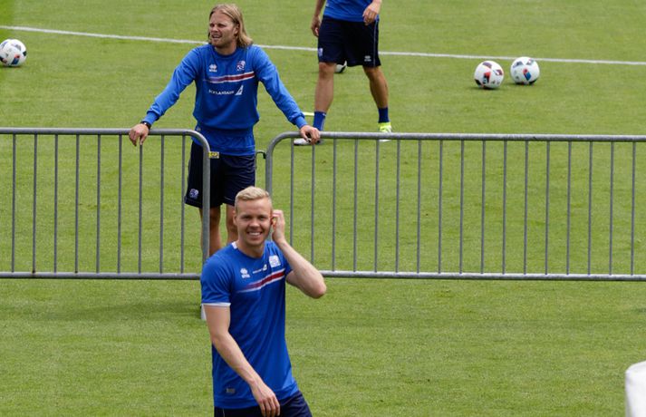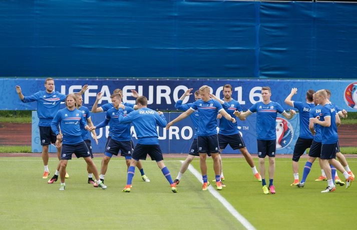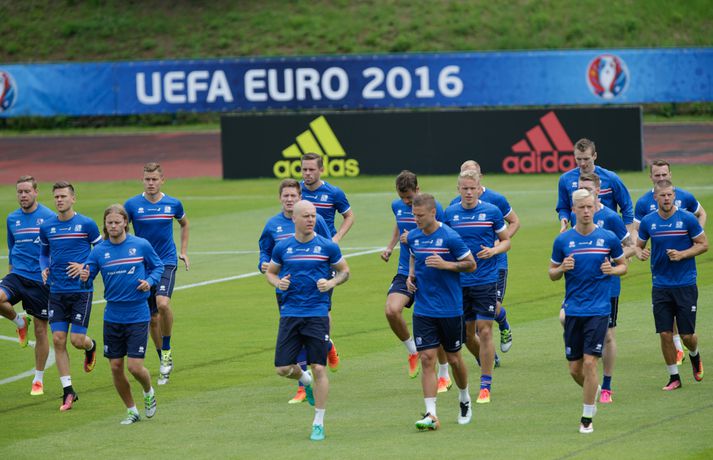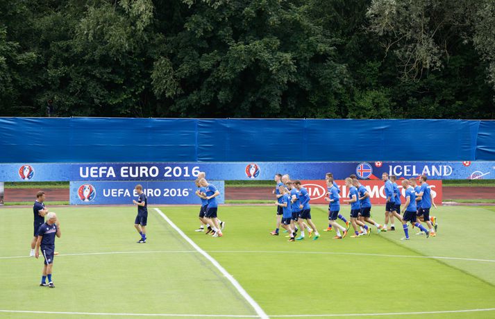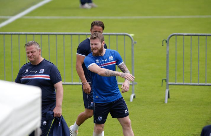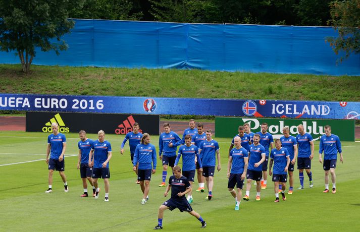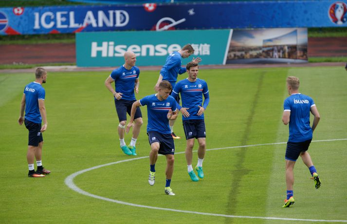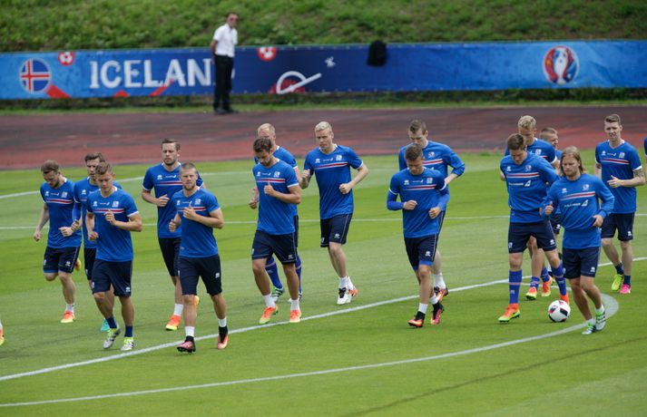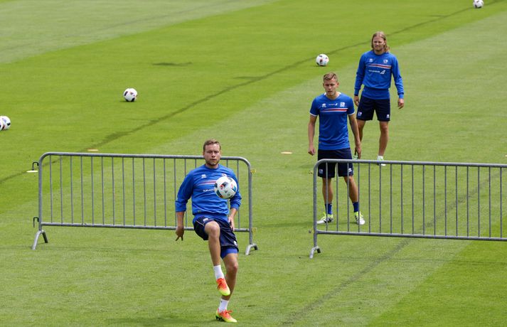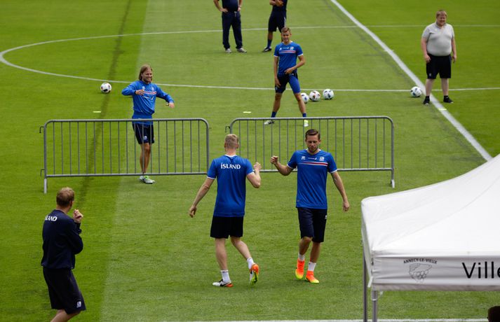 Strákarnir okkar komu aftur saman til æfinga á æfingavellinum í Annecy í dag eftir að hafa slakað á í gær. Þjálfararnir töldu mikilvægt að gefa leikmönnum smá andrými eftir samveruna og álagið undanfarið. Birkir Bjarnason, Kári Árnason og Ragnar Sigurðsson ræddu við blaðamenn eins og Heimir Hallgrímsson landsliðsþjálfari fyrir æfinguna. Mikill fjöldi fjölmiðlamanna fylgdist með fyrstu fimmtán mínútunum áður en skellt var í lás. Vilhelm Gunnarsson, ljósmyndari Fréttablaðsins og Vísis, myndaði opna hluta æfingarinnar í bak og fyrir.