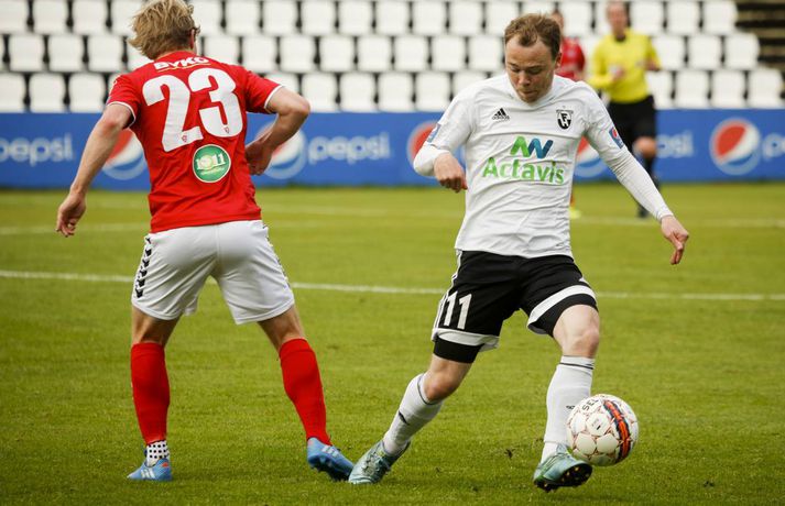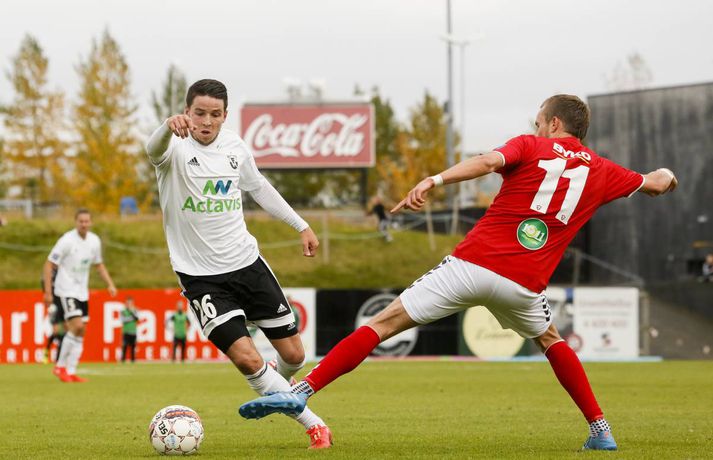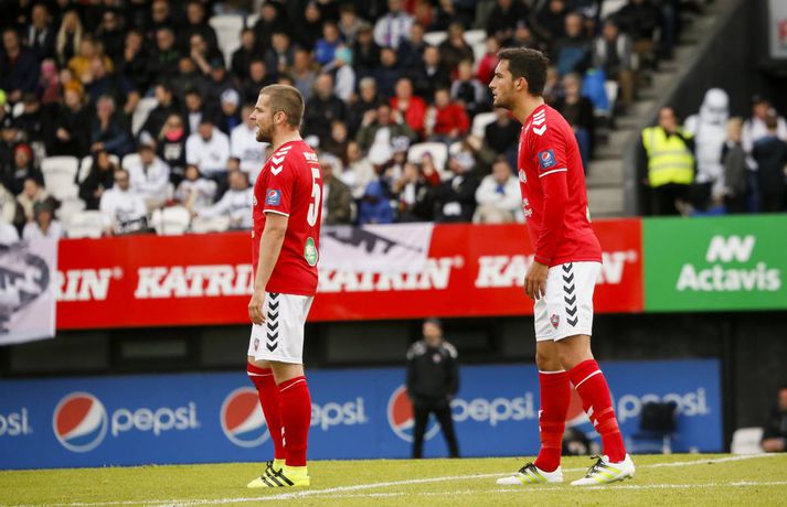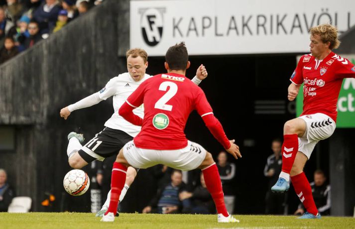FH tókst ekki að tryggja sér Íslandsmeistaratitilinn þegar liðið fékk Val í heimsókn í Kaplakrika í fyrsta leik 20. umferðar Pepsi-deildar karla í dag. Lokatölur 1-1.Eyþór Árnason, ljósmyndari Fréttablaðsins og Vísis, var í Kaplakrika og tók meðfylgjandi myndir. Með sigri hefði FH tryggt sér áttunda Íslandsmeistaratitilinn í sögu félagsins en það verður einhver bið á því. Kristinn Freyr Sigurðsson kom Val yfir með marki úr vítaspyrnu á 19. mínútu og Valsmenn voru lengi vel líklegri til að gera annað mark en FH-ingar að jafna. Heimamenn tóku leikinn yfir síðustu 20 mínúturnar og Kristján Flóki Finnbogason jafnaði metin á 83. mínútu með góðu skoti eftir sendingu Atla Guðnasonar. Kristján Flóki var svo hársbreidd frá því að tryggja FH sigurinn þegar aukaspyrnu hans small í slánni á 91. mínútu.Mörkin úr leiknum má sjá í spilaranum hér að neðan.Af hverju varð jafntefli? Valsmenn nýttu ekki færin sín nógu vel. Bæði voru þeir klaufar og einnig átti Gunnar Nielsen góðan dag. Rolf Toft og Andri Adolphsson fengu báðir frábær færi í síðari hálfleik en brást bogalistin. Það hefði verið erfitt fyrir FH að koma til baka tveimur mörkum undir gegn þessu öfluga Valsliði. Það vantaði ákefð og kraft í lið FH-inga í dag. Það var ekki fyrr en í lokin að liðið náði að sýna sitt rétta andlit - að þarna væri að spila lið sem með sigri hefði tryggt sér Íslandsmeistaratitlinn. Frammistaða FH-inga í fyrri hálfleik miðað við það sem var í húfi var langt frá því að vera ásættanleg fyrir Hafnfirðinga.Þessir stóðu upp úr Gunnar átti góðan dag í marki FH-inga og það lá mikið á varnarmönnum Hafnfirðinga stærstan hluta leiks. Þeir mega vera ánægðir með að hafa fengið aðeins eitt mark á sig í dag. Kristinn Freyr Sigurðsson var hættulegur eins og svo oft áður í sumar en hann hefur engu að síður átt betri leiki en í dag. Andri Adolphsson var kraftmikill á kantinum og þá spilaði Rolf Toft ágætlega.Hvað gekk illa? FH-ingar náði ekki upp neinu alvöru spili á löngum köflum í leiknum og sóknarmennirnir Kristján Flóki og Steven Lennon voru þá ekki í takti við leikinn. Það hefði enginn velt því mikið fyrir sér ef Heimir Guðjónsson hefði ákveðið að taka Kristján Flóka af velli fremur en Lennon en sá fyrrnefndi átti eftir að launa traustið með því að skora jöfnunarmarkið auk þess sem hann var hársbreidd að skora sigurmarkið. Valsmenn hefðu sem fyrr segir átt að nýta færin sín betur en heilt yfir voru lærisveinar Ólafs Jóhannessonar betri aðilinn í leiknum. En góð lið eins og FH kunna þá list vel að refsa andstæðingum sínum fyrir að nýta ekki færin sín.Hvað gerist næst? FH þarf að bíða og sjá hvað Fjölnir og Breiðablik gera í sínum leikjum. Ef annað liðið vinnur sinn leik þarf FH að bíða þar til á sunnudag með að tryggja sér Íslandsmeistaratitilinn. Þá á FH leik gegn Víkingi í Fossvoginum. Valsmenn geta ekki lengur náð FH að stigum og fara til ÍBV í næstu umferð en Eyjamenn eru að berjast fyrir sæti sínu í deildinni. Valur er þar að auki með öruggt sæti í Evrópukeppninni og hefur því ekki að neinu að keppa nema stoltinu.Ólafur: Förum til Eyja á þriðjudag Ólafur Jóhannesson, þjálfari Vals, segir að hans menn fengu fleiri færi til að vinna FH í dag en öfugt. Liðin skildu jöfn, 1-1, en með sigri hefði FH tryggt sér Íslandsmeistaratitilinn. „Við fengum betri færi til að vinna leikinn og eigum að landa svona leik. En það gekk ekki,“ sagði Ólafur sem vildi sjá meiri dug í sínum mönnum. „Ég held að við þorum ekki að fara í leikinn og vinna hann. Við gátum tekið skynsamlegri ákvarðanir á þeirra vallarhelmingi og menn vildu frekar reyna að gera eitthvað sjálfir en að spila boltanum. Við vorum smeykir.“ Ólafur breytti byrjunarliði sínu nokkuð í dag frá 3-0 tapleiknum gegn Breiðabliki og fékk það sem hann átti von á frá FH-ingum. „Ég hélt reyndar að hann myndi fara í 4-3-3 en FH var í 4-4-2. Það eru svo sem engin leyndarmál enda er fótboltinn orðinn þannig að við vitum allt um öll lið. Og þau vita allt um okkur. Þetta er því bara spurning um dagsform leikmanna.“ „Mér fannst þetta reyndar frábær leikur tveggja frábærra liða. Ég hefði gjarnan viljað fá meira úr honum,“ segir Ólafur sem mætir ÍBV í Vestmannaeyjum í næsta leik, á sunnudag. „Ætli við förum ekki á þriðjudaginn þangað, svo það verði ekkert vesen. Þetta er orðin svo skemmtileg umræða,“ sagði Ólafur og vísaði til þess er fresta varð leik ÍBV og Stjörnunnar á fimmtudag.Heimir: Titillinn mun ekki falla í kjöltuna okkar FH varð af tækifæri til að tryggja sér Íslandsmeistaratitilinn í knattspyrnu í dag er liðið gerði 1-1 jafntefli við Val á heimavelli sínum. Sigur hefði fært FH titilinn en liðið verðu nú að bíða annað hvort eftir hagstæðum úrslitum í þessari umferð eða til næsta sunnudags er FH mætir Víkingi Reykjavík á útivelli. Valsmenn komust yfir í leiknum en Kristján Flóki Finnbogason jafnaði metin í síðari hálfleik. Hann átti svo skot í slá í blálok leiksins. „Við fengum þrjá góða möguleika til að tryggja okkur sigur hér í restina. En ég held að við getum verið sáttir við niðurstöðuna. Valsararnir voru góðir í þessum leik og Gunnar Nielsen varði nokkrum sinnum vel,“ sagði Heimir. Hann segir að það hafi verið sama saga í dag og í síðustu leikjum. FH-ingar hafi ekki verið að byrja leikina nægilega vel. „Mér fannst við reyndar ágætir fyrstu tíu mínúturnar en þegar Valsmenn komu á okkur þá datt botninn úr okkur. Skiptingarnar okkar lífguðu upp á leikinn og það hefði verið gaman að klára þetta. En það er ljóst a