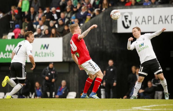 Umfjöllun, viðtöl, myndir og einkunnir: FH - Valur 1-1 | Fögnuður FH verður að bíða | Sjáðu mörkin Eiríkur Stefán Ásgeirsson í Kaplakrika skrifar 18. september 2016 16:45 Atli Guðnason lagði upp mark FH. vísir/eyþór FH tókst ekki að tryggja sér Íslandsmeistaratitilinn þegar liðið fékk Val í heimsókn í Kaplakrika í fyrsta leik 20. umferðar Pepsi-deildar karla í dag. Lokatölur 1-1.Eyþór Árnason, ljósmyndari Fréttablaðsins og Vísis, var í Kaplakrika og tók meðfylgjandi myndir. Með sigri hefði FH tryggt sér áttunda Íslandsmeistaratitilinn í sögu félagsins en það verður einhver bið á því. Kristinn Freyr Sigurðsson kom Val yfir með marki úr vítaspyrnu á 19. mínútu og Valsmenn voru lengi vel líklegri til að gera annað mark en FH-ingar að jafna. Heimamenn tóku leikinn yfir síðustu 20 mínúturnar og Kristján Flóki Finnbogason jafnaði metin á 83. mínútu með góðu skoti eftir sendingu Atla Guðnasonar. Kristján Flóki var svo hársbreidd frá því að tryggja FH sigurinn þegar aukaspyrnu hans small í slánni á 91. mínútu.Mörkin úr leiknum má sjá í spilaranum hér að neðan.Af hverju varð jafntefli? Valsmenn nýttu ekki færin sín nógu vel. Bæði voru þeir klaufar og einnig átti Gunnar Nielsen góðan dag. Rolf Toft og Andri Adolphsson fengu báðir frábær færi í síðari hálfleik en brást bogalistin. Það hefði verið erfitt fyrir FH að koma til baka tveimur mörkum undir gegn þessu öfluga Valsliði. Það vantaði ákefð og kraft í lið FH-inga í dag. Það var ekki fyrr en í lokin að liðið náði að sýna sitt rétta andlit - að þarna væri að spila lið sem með sigri hefði tryggt sér Íslandsmeistaratitlinn. Frammistaða FH-inga í fyrri hálfleik miðað við það sem var í húfi var langt frá því að vera ásættanleg fyrir Hafnfirðinga.Þessir stóðu upp úr Gunnar átti góðan dag í marki FH-inga og það lá mikið á varnarmönnum Hafnfirðinga stærstan hluta leiks. Þeir mega vera ánægðir með að hafa fengið aðeins eitt mark á sig í dag. Kristinn Freyr Sigurðsson var hættulegur eins og svo oft áður í sumar en hann hefur engu að síður átt betri leiki en í dag. Andri Adolphsson var kraftmikill á kantinum og þá spilaði Rolf Toft ágætlega.Hvað gekk illa? FH-ingar náði ekki upp neinu alvöru spili á löngum köflum í leiknum og sóknarmennirnir Kristján Flóki og Steven Lennon voru þá ekki í takti við leikinn. Það hefði enginn velt því mikið fyrir sér ef Heimir Guðjónsson hefði ákveðið að taka Kristján Flóka af velli fremur en Lennon en sá fyrrnefndi átti eftir að launa traustið með því að skora jöfnunarmarkið auk þess sem hann var hársbreidd að skora sigurmarkið. Valsmenn hefðu sem fyrr segir átt að nýta færin sín betur en heilt yfir voru lærisveinar Ólafs Jóhannessonar betri aðilinn í leiknum. En góð lið eins og FH kunna þá list vel að refsa andstæðingum sínum fyrir að nýta ekki færin sín.Hvað gerist næst? FH þarf að bíða og sjá hvað Fjölnir og Breiðablik gera í sínum leikjum. Ef annað liðið vinnur sinn leik þarf FH að bíða þar til á sunnudag með að tryggja sér Íslandsmeistaratitilinn. Þá á FH leik gegn Víkingi í Fossvoginum. Valsmenn geta ekki lengur náð FH að stigum og fara til ÍBV í næstu umferð en Eyjamenn eru að berjast fyrir sæti sínu í deildinni. Valur er þar að auki með öruggt sæti í Evrópukeppninni og hefur því ekki að neinu að keppa nema stoltinu.Ólafur: Förum til Eyja á þriðjudag Ólafur Jóhannesson, þjálfari Vals, segir að hans menn fengu fleiri færi til að vinna FH í dag en öfugt. Liðin skildu jöfn, 1-1, en með sigri hefði FH tryggt sér Íslandsmeistaratitilinn. „Við fengum betri færi til að vinna leikinn og eigum að landa svona leik. En það gekk ekki,“ sagði Ólafur sem vildi sjá meiri dug í sínum mönnum. „Ég held að við þorum ekki að fara í leikinn og vinna hann. Við gátum tekið skynsamlegri ákvarðanir á þeirra vallarhelmingi og menn vildu frekar reyna að gera eitthvað sjálfir en að spila boltanum. Við vorum smeykir.“ Ólafur breytti byrjunarliði sínu nokkuð í dag frá 3-0 tapleiknum gegn Breiðabliki og fékk það sem hann átti von á frá FH-ingum. „Ég hélt reyndar að hann myndi fara í 4-3-3 en FH var í 4-4-2. Það eru svo sem engin leyndarmál enda er fótboltinn orðinn þannig að við vitum allt um öll lið. Og þau vita allt um okkur. Þetta er því bara spurning um dagsform leikmanna.“ „Mér fannst þetta reyndar frábær leikur tveggja frábærra liða. Ég hefði gjarnan viljað fá meira úr honum,“ segir Ólafur sem mætir ÍBV í Vestmannaeyjum í næsta leik, á sunnudag. „Ætli við förum ekki á þriðjudaginn þangað, svo það verði ekkert vesen. Þetta er orðin svo skemmtileg umræða,“ sagði Ólafur og vísaði til þess er fresta varð leik ÍBV og Stjörnunnar á fimmtudag.Heimir: Titillinn mun ekki falla í kjöltuna okkar FH varð af tækifæri til að tryggja sér Íslandsmeistaratitilinn í knattspyrnu í dag er liðið gerði 1-1 jafntefli við Val á heimavelli sínum. Sigur hefði fært FH titilinn en liðið verðu nú að bíða annað hvort eftir hagstæðum úrslitum í þessari umferð eða til næsta sunnudags er FH mætir Víkingi Reykjavík á útivelli. Valsmenn komust yfir í leiknum en Kristján Flóki Finnbogason jafnaði metin í síðari hálfleik. Hann átti svo skot í slá í blálok leiksins. „Við fengum þrjá góða möguleika til að tryggja okkur sigur hér í restina. En ég held að við getum verið sáttir við niðurstöðuna. Valsararnir voru góðir í þessum leik og Gunnar Nielsen varði nokkrum sinnum vel,“ sagði Heimir. Hann segir að það hafi verið sama saga í dag og í síðustu leikjum. FH-ingar hafi ekki verið að byrja leikina nægilega vel. 