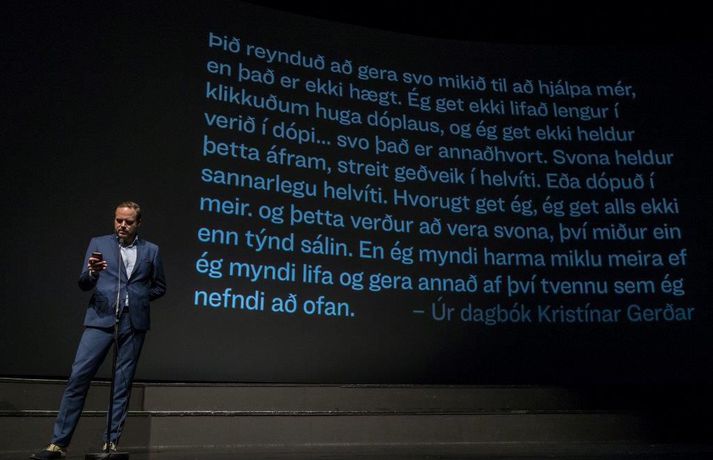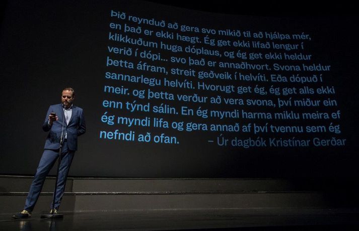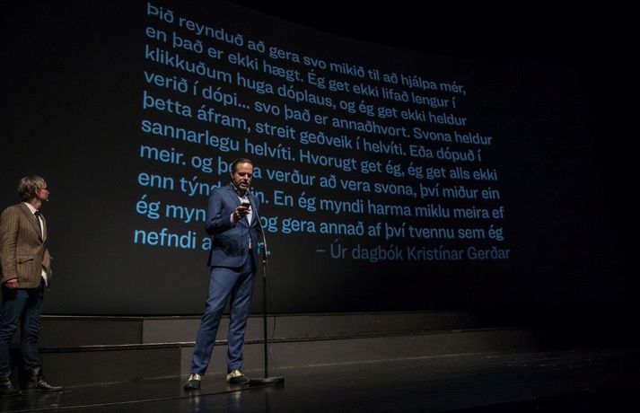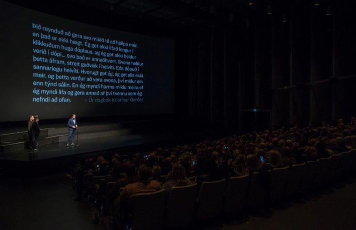 „Ég er mjög stressaður, ég verð bara að viðurkenna það. Ég var búinn að lofa mér því að halda ekki ræðu um það hvað það er erfitt að vera kvikmyndagerðamaður á Íslandi og hvað við þjáumst mikið fyrir verkið, en shit við gerðum það,“ sagði Baldvin Z, leikstjóri kvikmyndarinnar Lof mér að falla, í aðalsal Háskólabíói í gærkvöldi þegar kvikmyndin var forsýnd. Myndin segir frá hinni 15 ára gömlu Magneu en líf hennar umturnast þegar hún kynnist hinni átján ára gömlu Stellu. Magnea laðast að hispurslausu lífi Stellu og þróar Magnea sterkar tilfinningar til hennar sem Stella notfærir sér til eigin hagsbóta. Stella leiðir Magneu inn í heim fíkniefna sem hefur alvarlegar afleiðingar fyrir þær báðar. Tólf árum síðar liggja leiðir þeirra óvænt saman og verður uppgjör á milli þeirra óumflýjanlegt. Baldvin skrifar einnig handriti myndarinnar ásamt Birgi Erni Steinarssyni. Þeir eiga að baki afar giftusamlegt samstarf þegar þeir skrifuðu saman handrit myndarinnar Vonarstrætis, sem Baldvin Z leikstýrði, sem sópaði til sín tólf verðlaunum á Edduverðlaunahátíðinni árið 2015 en tæplega 48 þúsund manns sáu þá mynd í kvikmyndahúsum hér á landi.„Þetta var ógeðslega erfitt verkefni og það komu ógeðslega margir að þessu og þetta tók ógeðslega langan tíma. Ég vil bara segja takk við alla sem komu að verkefninu á einhverjum tímapunkti. Ég vil sérstaklega þakka þremur stelpum sem voru svo ótrúlega óeigingjarnar og hleyptu okkur inn í líf sitt fyrir nokkrum árum síðan og sýndu okkur óritskoðað hvernig þessi heimur lítur út. Takk kærlega fyrir það stelpur, þið eruð algjörar hetjur. Ég vil þakka Jóa Kr. fyrir að koma inn í þetta með okkur og hleypa okkur inn í sögu Sissu en sérstaklega ætla ég að þakka fjölskyldu Kristínar Gerðar,“ sagði Baldvin sem heyrði um sögu Kristínar mjög snemma í ferlinu.Dagbækurnar skiptu sköpum „Við fengum aðgang að dagbókum sem ég og Birgir lásum. Þessi lestur breytti lífinu okkar sem um munar og ég held að það skipti engu máli hversu dýrar linsur, hversu gott crew og hversu góðir leikarar við fáum til að búa þetta verkefni til þá veit ég ekki hvort við náum að fanga það sem stóð í þessum dagbókum en við sannarlega gerðum okkar besta.“ Baldvin sagði að ein blaðsíða í dagbókinni hafi snert þá félaga sérstaklega og varpaði hann mynd upp á skjáinn þar sem textabrot úr dagbók Kristínar Gerði sást. Birgir Örn las þann texta upp og má sjá myndina hér að neðan.vísir/dáóMeð aðalhlutverk í Lof mér að falla fara leikkonurnar Elín Sif Halldórsdóttir og Eyrún Björk Jakobsdóttir en leikarinn Þorsteinn Bachman fer einnig með stórt hlutverk. Í myndinni fara einnig með hlutverk Sturla Atlason, Edda Björgvinsdóttir, Ólafur Darri Ólafsson og Halldór Halldórsson. Framleiðendur myndarinnar eru þeir Júlíus Kemp og Ingvar Þórðarson en meðframleiðendur eru Markus Selin og Jukka Helle. Lof mér að falla verður frumsýnd hér á landi 7. september næstkomandi.Sjá einnig: Gói sýnir á sér myrka hlið í Lof mér að falla: „Eitt mesta ógeð sem ég hef komist í kynni við“Kvikmyndin snerti augljóslega við kvikmyndagestum í gærkvöldi og var mikið grátið. Þegar sýningunni var lokið gengu fjölda gesta hreinlega grátandi út úr salnum enda sýnir kvikmyndin hinn raunverulega fíkniefnaheim hér á landi. Hér að neðan má sjá myndir frá forsýningunni í gærkvöldi. Eftir sýninguna var kvikmyndagestum boðið í partý á Bryggjunni Brugghús og má sjá myndir úr því teiti hér að neðan einnig en ljósmyndarinn Mummi Lú tók allar myndirnar.mynd/mummi lúElín Sif Halldórsdóttir og Eyrún Björk Jakobsdóttir fara með aðalhlutverkin í kvikmyndinni Lof mér að falla og standa sig virkilega vel.mynd/mummi lúBaldvin Z ræddi vel við forsetahjónin sem voru mætt á sýninguna í gær.mynd/mummi lúJóhannes Haukur lét sig ekki vanta.mynd/mummi lúBaldvin Z ásamt Birgi Erni og framleiðendum kvikmyndarinnar.mynd/mummi lúMyndin hafði augljós áhrif á kvikmyndagesti.Bíógestir stóðu upp eftir sýninguna og klöppuðu lengi og vel.mynd/mummi lúÖflugur leikarahópur í kvikmyndinni Lof mér að falla.mynd/mummi lú