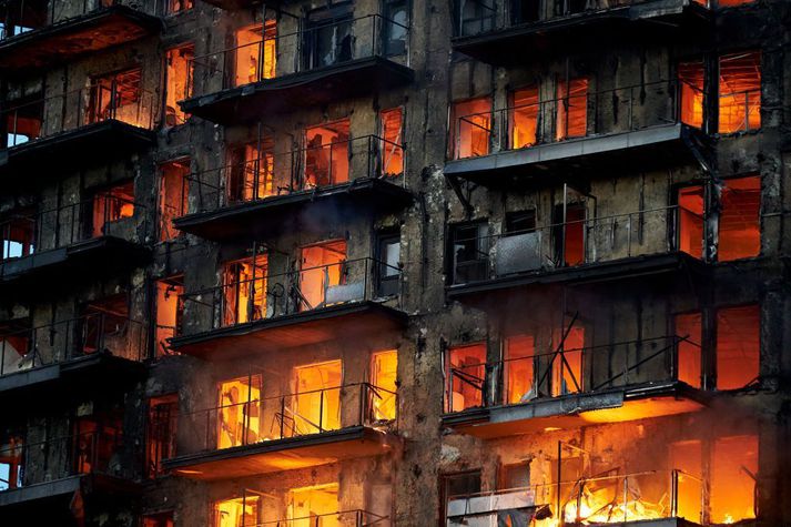 Að minnsta kosti fjórir látnir í eldsvoðanum í Valencia Hólmfríður Gísladóttir skrifar 23. febrúar 2024 08:28 Eldurinn breiddist hratt út og ekkert virðist eftir nema burðarvirkið. Getty/Manuel Queimadelos Alonso Að minnsta kosti fjórir eru látnir og fjórtán slasaðir eftir að eldur braust út í Valencia á Spáni í gær og gleypti stórt og mikið fjölbýlishús. Nítján er enn saknað. Meðal slösuðu er sjö ára barn en flestir urðu fyrir skaða þegar þeir önduðu að sér reyk. Alls voru 22 teymi slökkviliðsmanna kölluð út til að berjast við eldinn, sem braust út rétt fyrir kvöldmat í gær í Campanar-hverfinu í Valencia. Eldurinn náði að læsa klónum í nærliggjandi byggingar og er mikill vindur sagður hafa hamlað slökkvistarfi. Eldurinn breiddist hratt út að sögn vitna og viðbragðsaðilar og myndir sýna bygginguna standa í ljósum logum og mikinn og dökkan reyk stíga til himins. Ríkissjónvarpsstöðin TVE sagði 130 íbúðir í byggingunni, sem eldurinn hefði fljótt gert að „beinagrind“. A large fire has engulfed two residential buildings in Valencia in eastern Spain - with people seen trapped on balconies waiting to be rescued.Read more: https://t.co/7O4a5GqpRw pic.twitter.com/y7eFMlM8RS— Sky News (@SkyNews) February 23, 2024 Varaformaður samtaka verkfræðinga í Valencia segir hinn hraða bruna mega rekja til klæðningar hússins, sem hafi verið úr afar eldfimu pólýúretani. Guardian líkir eldsvoðanum við þann sem braust út í Grenfell Tower í Lundúnum áirð 2017, þar sem 72 lét lífið. Þar kom klæðning byggingarinnar einnig við sögu. Íbúi í nágrenninu sagðist hafa litið út um gluggann og fylgst með því hvernig eldurinn gleypti húsið í sig eins og það væri gert úr korki. Vindurinn hefði augljóslega hjálpað logunum við að teygja úr sér. Á myndskeiðum má sjá föður og dóttur bjargað af svölum. Pedro Sánchez, forsætisráðherra Spánar, sagði eldsvoðann mikið áfall og að hann hefði haft samband við borgarstjóra Valencia og yfirvöld til að bjóða þeim alla þá hjálp sem þá vantaði. Spánn Tengdar fréttir Eldur gleypir í sig stóra blokk í Valencia Fjórtán hæða fjölbýlishús er í ljósum logum í Campanarhverfi Valenciaborgar á Spáni. Eldurinn hefur náð til flestra hæða í húsinu og þykkur reykmökkur sést um alla borgina. 22. febrúar 2024 18:41 Mest lesið Ríkissjóður greiðir fyrir flutning hinna látnu til Íslands Innlent „Krítískur massi af snarbrjáluðu fólki nær yfirhöndinni“ Innlent Trump nefnir nýja kynslóð orrustuskipa í höfuðið á sjálfum sér Erlent Ekið á konu á Langholtsvegi Innlent Hyggst kæra dyraverði Auto til lögreglu Innlent Undrandi á ráðningu ráðgjafa Innlent Fjölgun eldri kvenna í Kvennaathvarfi: „Þessar konur bíða ekki“ Innlent Skapari Call of Duty lést í bílslysi Erlent Ný könnun Maskínu: „Væri alveg ný staða í íslenskum stjórnmálum“ Innlent Hiti geti mest náð átján stigum Veður Fleiri fréttir Kínverjar og Rússar lýsa yfir stuðningi við Venesúela Skapari Call of Duty lést í bílslysi Trump nefnir nýja kynslóð orrustuskipa í höfuðið á sjálfum sér „Bandaríkin eiga ekki að taka yfir Grænland“ Nýr ritstjóri stöðvaði umfjöllun um brottvísanir Trump Breiddi út faðminn fyrir rasista: „Þið þurfið ekki að biðjast afsökunar á að vera hvít lengur“ Sprengdu rússneskan hershöfðingja í loft upp í Moskvu Undirbúningur árásarinnar stóð yfir í marga mánuði Trump skipar sendifulltrúa fyrir Grænland Segir unnið að því að móta sameiginlega nálgun Bandaríkjanna, Úkraínu og Evrópu Sýknaður af nauðgun eftir að hafa verið skimaður fyrir sjaldgæfri svefnröskun Málið sem Trump getur ekki losað sig við Grunaður um manndráp eftir að tveggja ára drengur féll úr blokk Fóru um borð í vélvana rússneskt skip Baulað á Albanese á minningarathöfn á Bondi-strönd Kvarta yfir ritskoðun Epstein-skjala: „Við vitum ekki hvað við vitum ekki“ Níu skotnir til bana á krá Sextán ára fékk greitt fyrir að færa Epstein stúlkur Ljósmyndir horfnar úr Epstein-skjölunum, þar á meðal ein af Trump Vilja dauðarefsingu af borðinu vegna hagsmunaáreksturs ráðherra Pútín sagður hafa valið Witkoff Gerðu umfangsmiklar árásir gegn ISIS í Sýrlandi Það helsta úr fyrsta skammti Epstein-skjalanna Epstein-skjölin birt Draga tilvist neðanjarðarhafs á Títan í efa Réðust á skip úr skuggaflotanum þúsundir kílómetra frá Úkraínu Enn fleiri myndir úr safni Epsteins: „En hún vill þúsund dali fyrir hverja stúlku“ Trump vill til tunglsins fyrir 2028 Herða reglur og ráðast í endurkaup á skotvopnum Morðinginn í Brown háskóla fannst látinn Sjá meira