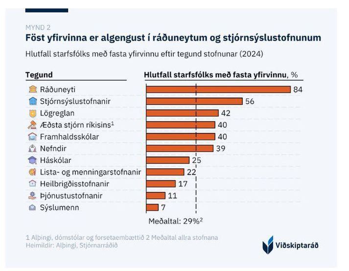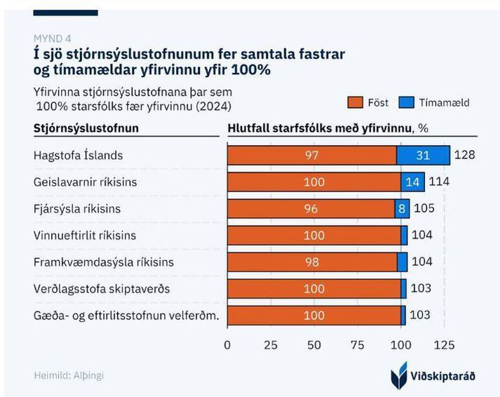 Hlutfall starfsmanna með fasta yfirvinnu er verulega mismunandi eftir stofnunum. Hjá ráðuneytunum er það 84 prósent en undir 20 prósentum hjá þjónustustofnunum og heilbrigðisstofnunum. Þá getur útfærslan verið gjörólík á milli stofnanna sem sinna áþekktri vinnu. Sem dæmi er 89 prósent af starfsfólki lögreglunnar í Vestmannaeyjum með fasta yfirvinnu en aðeins 24 prósent hjá lögreglunni á Vestfjörðum. Gunnar Úlfarsson, hagfræðingur Viðskiptaráðs, segir ekki liggja fyrir hve stórt hlutfall starfsmanna ríkisins hljóti fasta yfirvinnu en ítrekar að það sé hátt. „Árið 2006 var stefnt að því að útrýma þessu fyrirkomulagi vegna þeirra ýmsu galla sem væru á því og færa þá þessa föstu yfirvinnugreiðslu í fasta launatfölu.“ Hann segir fyrirkomulagið auka gjá milli vinnumarkaða enn frekar en einnig meðal starfsmanna ríkisins. „Þetta veldur misræmi og ógagnsæi á milli vinnumarkaða. Á milli stofnanna og jafnvel meðal starfsmanna innan sömu stofnunar. Það er óheilbrigt. Þar sem það er ekki eftirlit hvort þessi vinna sé innt af hendi þá fær maður þá tilfinningu að fyrirkomulag fastrar yfirvinnu sé raunar séð til þess að skapa dulda launahækkun fyrir skrifstofufólk hjá hinu opinbera.“ Sumar stofnanir greiði bæði fasta og tímamælda yfirvinnu sem leiði til tvöfaldrar yfirvinnu fyrir sama vinnuframlagið. „Þar sem önnur tegund yfirvinnunnar er tímamæld en hin er ekki tímamæld og í rauninni ekkert eftirlit með því.“ Hlutfall fastrar yfirvinnu hafi aukist frá árinu 2009 úr 75 prósent stofnana í 90 prósent stofnanna. Að mati Gunnars ætti þróunin að vera þveröfug. „Í ljósi þessara galla sem að fylgja þessu fyrirkomulagi þá leggur Viðskiptaráð fyrir að þetta fyrirkomulag, fastrar yfirvinnu, og það sé einungis greitt fyrir tímamælda yfirvinnu. Það er sannarlega fólk sem að leggur meira á sig en er mælst til samkvæmt launasetningu og svo eru aðrir sem gera minna. Þannig þetta væri líka skref í þá átt að auka sanngirni gagnvart starfsmönnum ríkisins miðað við vinnuframlag.“