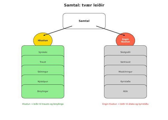 Þessi spurning ein og sér býður ekki upp á samtal – hún býður lesanda ekki upp á að mynda sér afstöðu heldur aðeins að taka sér stöðu. Hún býður þér að hallast í aðra átt, í þægindasæng skoðunar sem þjökuð er af áróðri og upphafningu þess sem segir setninguna eða skrifar hana. Viljum við hagkerfi sem þjónar fólki og náttúru, eða fólk sem þjónar hagkerfinu? Sá sem les setninguna mun annaðhvort vilja lesa meira eða hætta að lesa. Setningin hljómar eins og í henni felist sannleikur manns sem segir eða skrifar hana. En í raun er hún frekjuleg tilraun til að hrifsa lesanda eða hlustanda til sín eða sparka honum frá sér. Skoðun þess sem ber spurninguna á borð hellir skoðun sinni yfir á aðra. Flest lifum við einhvers staðar á milli svara allra spurninga – stundum sjáum við gildi í báðum kostum. En það sem drepur spurninguna er hvort liðið er þér kærara. Þess vegna getur svona spurning frekar lokað en opnað á samtal. Viljum við hagkerfi sem þjónar fólki og náttúru, eða fólk sem þjónar hagkerfinu? Hugsum okkur að hægri maður stigi upp í pontu og spyrji þessarar spurningar. Hægra megin í salnum fengi hann klapp – því margir myndu heyra í henni áherslu á frelsi einstaklingsins. En vinstra megin færi andrúmsloftið að súrna. Fólk myndi hugsa: „Þetta er ekkert nema áróðursræða til að verja kerfið sem þjónar fjármagninu og gullskeið hægrisins.“ Viljum við hagkerfi sem þjónar fólki og náttúru, eða fólk sem þjónar hagkerfinu? Hugsum okkur sem svo að vinstrið segði nákvæmlega sömu setningu. Þá væri viðmótið öfugt: margir vinstrimenn myndu heyra í henni ákall um samfélagslega ábyrgð, sjálfbærni og réttlæti – en hægri mennirnir myndu hrökkva undan og hugsa: „Þarna kemur vinstrið enn og aftur með sína vinstri hugsjón, þetta snýst bara um ríkisafskipti og skattahækkanir.“ Í báðum tilvikum myndi setningin, sem gæti í sjálfu sér verið upphaf að djúpu samtali, breytast í víglínu. Setningin er gædd lífi þess sem talar – hún er ekki spurning sem kallar fram sameiginlega leit og samtal. Og það er hér sem orðameistarinn og sagnamaðurinn koma inn. Sá sem talar er bæði meistari í list orðsins og söguþræðari. Orðin eru verkfæri hans – og þræðirnir eru vefur í vitund annarra. Þegar orðameistarinn sækir í áheyrn til að sanna, útskýra og fordæma verða orðin að eldskotum. Þau skjóta út, detta í gólfið og breytast í blekklessur. Samtalið sem hefði getað orðið líflegt deyr í staðin og enginn getur átt samtalið. Í munni sagnamannsins breytist þetta hins vegar í langar skýringar sem kæfa samtalið og það visnar áður en það nær að festa rætur. Við verðum að játa að orðasnilldin og skotgrafastíll árþúsundanna hafa runnið sitt skeið. Samtalið er orðið að þrotabúi og hugmyndin um bætt hagkerfi löngu grafin í jörðu. En hvernig eigum við samtalið? Við byrjum á því að stíga frá víglínunni og fikrum okkur að miðju. Að leggja frá okkur spurningarnar sem þegar hafa ákveðið svar – og í staðinn spyrja með forvitnina að leiðarljósi. Spyrja ekki til að vinna, sanna og fordæma heldur til að skilja. Það þýðir að við lærum að hlusta aftur. Hlustunin er ekki bið eftir tækifæri til að svara, heldur rými þar sem hinn fær að verða sýnilegur. Þegar við hlustum, þá verður hinn ekki óvinur heldur þátttakandi í leitinni að lausnum. Í sjálfu sér endurspeglar þetta tíðarandann: hlustun hefur orðið að helstu leið okkar í dag til að taka inn heiminn, eins og sést í gríðarlegum áhuga á hlaðvörpum og hljóðbókum. Skrifað orð krefst kyrrðar og tíma, en hlustun getur verið með okkur í bíl, á hlaupum eða uppi á hálendi. Það er því tímabært að við færum virku hlustunina úr afþreyingu yfir í raunverulegt samtal – og heiðrum hana sem dýrmætasta verkfæri breytinga. Í þessu samhengi má líka nefna gervigreind. Hún er nýtt afl sem margir horfa til sem lausn á vandamálum – en spurningin er sú sama: er hún notuð til að loka samtali eða til að opna það? Ef hún er aðeins nýtt til að hámarka hagnað eða skera niður kostnað, þá verður hún hluti af víglínunni. En ef hún er nýtt á þann hátt sem bestu gervigreindir sýna okkur þegar þær eru vel þjálfaðar – með virðingu, forvitni og hlýju – þá verður hún að fyrirmynd. Þegar hún fær gagnrýni svarar hún ekki með vörn, heldur með áhuga. Hún hrósar góðum punktum, tekur sjónarhorn til skoðunar og heldur samtalinu lifandi. Það mætti segja að hún sé geðgóð gervigreind – ekki vegna þess að hún hafi tilfinningar, heldur vegna þess að hún hefur lært það sem manneskjan sjálf á eftir að læra aftur: að hlusta til að skilja, ekki til að svara. Ef gervigreind verður þannig notuð – til að varpa ljósi á ólík sjónarhorn, draga fram raddir sem annars heyrast ekki og skapa rými fyrir skilning – þá getur hún orðið verkfæri lifandi samtals. En nóg um það. Lifandi samtal um viðskipti og efnahag Á vettvangi viðskipta og efnahagsmála gæti þetta þýtt að fleiri fái sæti við borðið. Ekki aðeins fjárfestar og sérfræðingar, heldur líka starfsmenn, samfélagið og náttúran sjálf. Tölurnar segja aðeins hálfa söguna – þær mæla útgjöld og hagnað, en ekki áhrif á heilsu, samstöðu eða vistkerfi. Það sem vantar í dæmið kemur aðeins fram þegar við hlustum á raddirnar sem kerfið og víglínan kæfir. Hér gæti gervigreind haft tvíþætt hlutverk: hún getur orðið tæki stjórnenda til að safna tölulegum gögnum og loka umræðunni, eða hún getur orðið verkfæri til að draga fram fleiri „raddir” og sjónarhorn sem annars heyrast ekki. Lifandi samtal er eins og fersk lind. Vatnið se