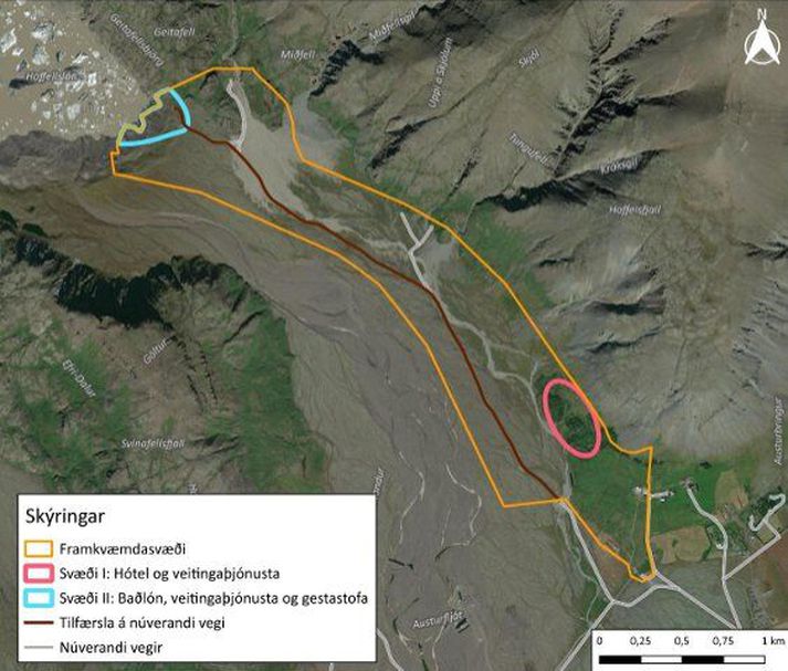 Þetta kemur fram í matsáætlun sem lögð hefur verið fram til kynningar. Til stendur að reisa allt að 120 herbergja hótel á skógræktarsvæði sem og baðlón með búningsklefum, stunda veitingarekstur og bjóða jöklasýningu við Hoffellslón. Gert er ráð fyrir því að framkvæmdir hefjist 2026 og að baðstaður opni 2028. Hóteluppbygging hefjist 2027 og ljúki 2029 eða 2030. Fyrstu fréttir sem bárust af verkefninu birtust sumarið 2024 þegar greint var frá því að Bláa lónið hefði fest kaup á jörðinni Hoffell 2 í Austur-Skaftafellssýslu. Fram kom í fréttatilkynningu frá Bláa lóninu að markmiðið væri að móta einstakan stað fyrir ferðamenn, við rætur Hoffellsjökuls og skapa segul sem styrki Suðausturland sem áfangastað ferðamanna. Gestastofa, sýningarhald og fræðsla Í matsáætluninni kemur fram að hönnun standi nú yfir og að verkefnið muni þróast samhliða vinnu við mat á umhverfisáætlun. Uppbyggingin muni fara fram á tveimur svæðum innan framkvæmdasvæðisins. Á skógræktarsvæði verði eins og áður segir byggð upp hótelgisting og veitingaþjónusta. Böðin við Hoffellslón eigi svo að verða einstakur baðstaður upp við lónið. Þar verði bygging sem felld verði inn í landslagið eins og best verði á kosið og færustu hönnuðir fengnir til hönnunarinnar. Tekið er fram að böðin verði opin almenningi og gert ráð fyrir allt að 1500 gestum á dag. Horft í norðurátt í átt að Hoffellsjökli og Hoffellslóni frá jökulgarðinum. Efla verkfræðistofa Gerð verði krafa um vandað útlit mannvirkja og lóðar og gæta skuli samræmis í heildaryfirbragði bygginga á svæðinu. Í byggingunni verði móttaka, sýningarhald, verslun, almenn veitingaþjónusta, baðlaugar og búningsklefar með 400 til 600 skápum. Einnig eigi að vera þar gestastofa með sýningarhaldi og fræðslu um Hoffellssvæðið og Hoffellsjökul. Fyrirhugað sé að vera með fræðslusýningu um jökla, rénun þeirra og loftlagstengdum málefnum því tengdu. Staðsetning og umfang mannvirkis við jökulgarð. Svæðið sem afmarkað er með bláu táknar það svæði sem talið er fara undir mannvirki, lón og landmótun tengda framkvæmdinni. Hvíta punktalínan sýnir hvernig fyrirhuguð stærð og umfang mannvirkis gæti verið. Frekari hönnun fari fram eftir jarðvegsrannsóknir. Efla verkfræðistofa Óvíst hvernig hönnun lónsins verður Bygging baðlónsins sjálf sé svo fyrirhuguð norðan megin við jökulgarðinn til þess að halda bæði ásýnd inn dalinn óskertu ásamt því að gestir fái að njóta útsýnis yfir jökulinn og jökullónið. Til skoðunar sé að nota þak byggingarinnar sem útsýnispall fyrir alla sem leggi leið sína inn í dalinn. Hótelið verði þrjár til fjórar hæðir og muni geta tekið við allt að 240 gestum. Þannig eigi jafnframt að tryggja og betrumbæta aðgengi fólks sem ekki eru gestir baðlónsis til að sem flestir geti áfram notið þess sem svæðið hafi upp á að bjóða. Þá kemur fram að nákvæm staðsetning baðlónsins innan jökulgarðsins og útfærsla mannvirkisins liggi ekki fyrir á þessu stigi. Þau atriði ráðist af niðurstöðum jarðtæknirannsókna sem fyrirhugaðar séu í lok þessa árs. Rannsóknirnar fela í sér jarðfræðiboranir sem miði að því að greina jarðlög og meta fýsileika þess að reisa mannvirki á svæðinu. Vegna þeirrar óvissu sé eki hægt að leggja fram myndir eða nákvæma lýsingu á útliti og hönnun baðlónsins að svo stöddu. Framkvæmdasvæði Hoffells ásamt svæðaskiptingu. Efla verkfræðistofa Hægt að baða sig inni og úti Þá segir að rík áhersla verði lögð á að bygging sé falin frá aðkomuleið að lóninu, sem sé eftir vegi sem lagður var á fjórða áratug síðustu aldar. Það verði gert til þess að halda útsýni að jökulgarðinum og jöklinum frá jökulaurum óskertu. Bílastæði verði staðsett við jökulgarðinn sem muni þá þjónusta bæði baðstaðinn sem og almenna gesti þjóðgarðsins. Baðstaðurinn verði staðsettur nálægt mörkum þjóðgarðsins, þannig geti gestir þjóðgarðsins sem ekki hyggist í bað einnig notið veitingaþjónustu og jöklasýningar í byggingunni við Hoffelsslón. Fyrirhugað er að staðsetja baðlón, veitingaþjónustu og gestastofu við jökulgarðinn. Á myndinni er horft til norðurs frá jökulgarðinum og má sjá tungu jökulsins, Hoffellslón til vinstri og Geitafellsbjörg til hægri. Efla verkfræðistofa Segir að við nánari útfærslu á baðstað, bílastæði, stígum og öðrum framkvæmdaþáttum í grennd við mörk þjóðgarðsins verði haft samráð við Vatnajökulsþjóðgarð. Þess er einnig getið að landslagið við jökulgarðinn sé í sífelldri mótun í kringum ölduna og vistkerfið viðkvæmt. Því gefi auga leið að stíga þurfi varlega til jarðar og styðjast við gögn frá jarðfræðingum og verkfræðingum til að tryggja lágmarksrask fyrir byggingu af slíku tagi á vistkerfi, landslag og útsýni. Unnin hafi verið skýrsla til að kortleggja jarðmyndanir og möguleg merki á yfirborð ium hreyfingu, skilgreina viðkvæm svæði og hreyfingu jökulsins. Þar sem allra veðra sé von sé fyrirhugað að baðlónið geti verið bæði innandyra og utandyra og mótað á þann hátt að gestir geti leitað skjóls frá veðri eða notið sólarljóss ef svo ber undir.