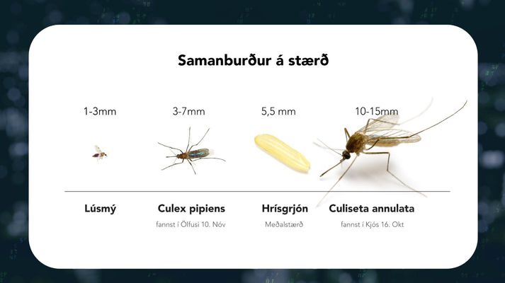 Moskítóflugurnar fundust á sveitabæ í Ölfusi á þriðjudag en í október fundust flugur af annarri tegund í Kjós. „Við fáum senda mynd af grunsamlegri flugu þaðan og förum á staðinn. Um leið og við opnum hesthúsið þá kemur ský á móti okkur,“ sagði Matthías Alfreðsson, skordýrafræðingur hjá Náttúrustofnun. Á þessari mynd er hægt að sjá stærðir flugnanna samanborið við hrísgrjón.Vísir/Heiðar „Ætlum að fara í það á morgun að banka upp á og fá að kíkja í gripahús“ Matthías segist hafa safnað um þrjúhundruð flugum á staðnum og drepið nokkra tugi til viðbótar. Hann ætlar að heimsækja fleiri bæi á svæðinu til að kanna hvort þær hafi dreift sér enn frekar. Hann ætlar að reyna að útrýma flugunum á staðnum. „Það er erfitt en ég held að við verðum að reyna það og sömuleiðis kanna hvort þetta sé á fleiri stöðum þarna í nágrenninu. Við ætlum að fara í það á morgun að banka upp á og fá að kíkja í gripahús á svæðinu.“ Tegundin sem fannst í Ölfusi er töluvert minni en sú sem fannst í Kjós en báðar eru þær stærri en lúsmýið sem við Íslendingar þekkjum orðið vel. Eftir á að staðfesta af hvaða tegund flugurnar eru sem fundust í vikunni þó líklega séu þær af tegundinni Culux Pipiens. „Hún lifir aðallega á fuglum og er aðallega að drekka blóð úr fuglum. Það er til önnur undirtegund sem heitir Culux pipiens molestus og hún er grimmari, bítur fólk meira. Í þessu hesthúsi reyndum við að láta hana bíta okkur og hún vildi ekkert okkar blóð þannig að mig grunar að þetta sé þessi sem er að nærast á fuglum.“ Í dvala að vetri til en fara af stað á vorin Matthías segist telja líklegt að moskítóflugur hafi borist hingað með vörum í innflutningi. Hann segir oft hafa verið talað um að moskítóflugur geti ekki borist hingað til lands með vindum þar sem þær fljúgi ekki hátt upp. „Þessar tegundir eru að sjúga blóð úr fuglum þannig að þær fara alveg hátt og ég sé ekki af hverju þær ættu ekki að geta borist með vindinum eins og önnur smádýr.“ Báðar tegundirnar sem fundist hafa hér á landi eru á fullorðnisstigi að vetri til, í hálfgerðum dvala og leita skjóls. „Svo fara þær af stað þegar fer að vora og leita sér af blóðmáltíð og undirbúa næstu kynslóð.“ Ekki þekktar fyrir að bera sjúkdóma í mannfólk Tegundin er þekkt fyrir að valda sjúkdómum í fuglum en ekki í mannfólki. Matthías segir þær ekki eins slæmar og lúsmýið og hvetur fólk til að senda myndir telji sig það sjá moskítóflugu. „Við hefðum aldrei fundið þessar flugur ef viðkomandi hefði ekki sent mynd. Við erum búin að fá fullt af myndum og pósthólfið mitt er fullt, en ég vil frekar fá meira en minna.“