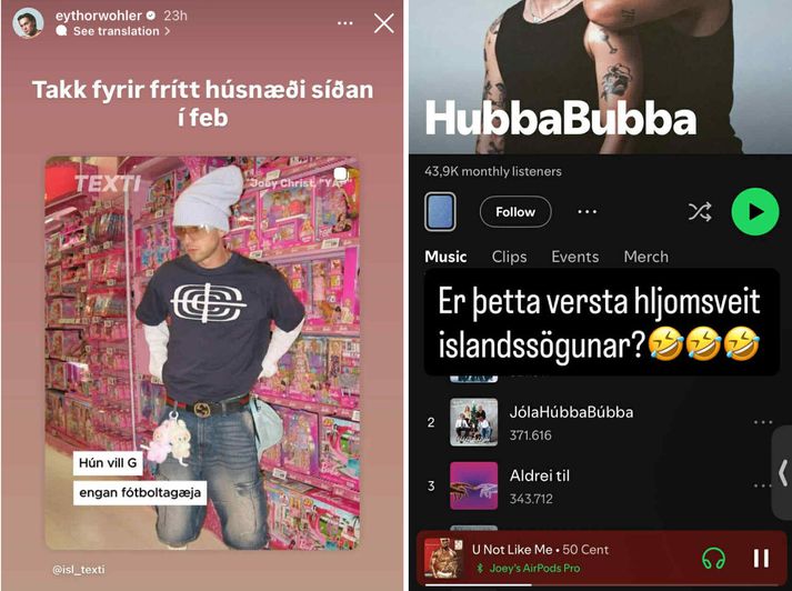 Eyþór Wöhler, sem er í HúbbaBúbba með Kristali Mána Ingasyni, deildi á Instagram-hringrás sinni mynd af textabroti úr laginu „YAP“ þar sem Jóhann Kristófer undir listamannsnafni sínu Joey Christ rappar: „Hún vill G, engan fótboltgæja“. Við myndina skrifar Eyþór „Takk fyrir frítt húsnæði síðan í feb“. Merkingin með fríu húsnæði er vísun í hugtakið „living rent-free“ í skilningum að maður búi ókeypis í huga einhvers því hann hugsar svo mikið um mann. Hvers vegna febrúar er ekki alveg ljóst, umsjónarmaður síðunnar Isl texti vill meina að það tengist útgáfu lagsins „Sjúk“ þar sem Jóhann rappaði: „Hvort ætlarðu að hlusta á mig eða þá, áratug í leiknum eða poppin’ í smá“. Myndirnar sem þeir félagar birtu á miðlunum á mánudag. Jóhann Kristófer svaraði hringrásinni skömmu síðar á Instagram og birti þar mynd af Spotify-síðu Húbba búbba og skrifaði við hana: „Er þetta versta hljómsveit Íslandssögunnar? 🤣🤣🤣“ Á myndinni var hann sjálfur að spila lagið „U Not Like Me“ með 50 Cent en merking þess segir sig nokkuð sjálf. Tónlistin kalli fram líkamleg viðbrgöð Það fyrsta sem maður hugsar er auðvitað að hér séu samantekin ráð um að skálda beef til að skapa umtal og vekja athygli fólks í blóðugri baráttunni á jólatónleikamarkaði. Húbbabúbba verða með tónleikana „HúbbaBúbba: Hinsti dansinn“ í Austurbæ 19. des og degi síðar, 20. des, stígur Jóhann Kristófer á stokk í sama húsi með „The Joey Christ Show“. Blaðamaður hafði samband við mann með innanbúðarþekkingu til að athuga hvort hér væru samantekin ráð. Heimildarmaðurinn hafði ekki heyrt af því að um skipulagðar deilur væri að ræða. Því til stuðnings benti hann á að saga Húbba Búbba og Jóhanns Kristófers teygði sig lengra aftur. Tónleikar þeirra félaga verða á sama stað helgina 19. til 20. desember. Fyrir síðustu kosningar sagði Jóhann á Instagram að hann myndi kjósa þann flokk sem myndi banna fótboltastrákum að gera tónlist. Jóhann hefði síðan haldið óbeinum skeytasendingum áfram í textum sínum og viðtölum. Blaðamaður ákvað því að heyra í Jóhanni til að forvitnast um málið. Eru menn í illdeilum eða er þetta bara spaug? „Þú veist, það er oft þunnt þarna á milli,“ sagði Jóhann Kristófer. Jóhann Kristófer braust fram á sjónarsviðið fyrir um tíu árum síðan og hefur auðgað menningarlífið með tónlist sinni, sjónvarpsþáttum og leikverkum. Þú ert ekki mjög hrifinn af þeim? „Nei, ekkert sérstaklega hrifinn,“ sagði hann. Eyþór vildi meina að þú værir með þá á heilanum, er eitthvað til í því? „Nei, ég hugsa ekki mikið um þá. Það kemur fyrir að ég heyri tónlistina og þá kallar hún fram sterk líkamleg viðbrögð.“ Þannig það er ekki von á samstarfi? „Ég tel það ólíklegt,“ sagði hann að lokum. „Það seldist engin plata, svo hann neyðist til að hata“ Blaðamaður ætlaði að reyna að ná í skottið á Eyþóri Wöhler í gær en hann var vant við látinn þar til síðdegis svo það símtal þurfti að bíða til dagsins í dag. Seint í gærkvöldi birti Eyþór svo myndband á Tiktok þar sem hann hafði samið lag til Jóhanns titlað: „Lag til 32 ára karlmanns sem er með mig á heilanum.“ Í myndbandinu syngur Eyþór og slær takt á gítarinn meðan gítarleikari spilar undir. Textinn hljóðar svo: Rosa týpa út á við/samdi ekki gott lag en reynir/já þessar vinsældir virðast ekki vera vinonur allra. Var ekki að reyna að angra neinn/á ekki heima í 101/svo fyrirgefðu mér ef það gengur vel og er gaman. Hann vill vera stór stór stór stór strákur/það seldist enginn plata/svo hann neyðist til að hata/rosa sniðugur, aldrei bókaður, ég skal taka þig með mér næst/rosa sniðugur, aldrei bókaður, ég skal taka þig með mér næst... Joey Christ. Um 12 þúsund manns hafa þegar horft á myndbandið og það fengið þúsund læk. Sagði Eyþór að fengi það fimm þúsund læk þá myndi sveitin gefa það út. Pirrandi að sjá fótboltagutta verða vinsælari „Mér líður eins og hann sé með okkur á heilanum, allt frá því að hann kom fram í vídjói í febrúar síðastliðnum þar sem hann skaut óbeint á okkur og ætlaði að taka sig saman og pakka þessu saman, það er að segja tónlistarsenunni. Það hefur mistekist, að mínu viti,“ sagði Eyþór um Jóhann þegar blaðamaður hafði samband í morgun. Þar að auki hefði Jóhann haldið áfram að skjóta á Húbbabúbba í lögum sínum og því hefði Eyþór fundið sig knúinn til að svara honum á TikTok. @eythorwohler @joey christ ♬ original sound - eythorwohler „Það er örugglega pirrandi fyrir Jóa að vera tíu ár í leiknum og svo koma einhverjir fótboltaguttar sem eru búnir að vera í tónlist í nokkra mánuði, gera þetta smá eins og „side-job“ og verða vinsælli, meðan aðrir taka þessu alvarlegar og fara flóknari leiðina að þessu,“ sagði Eyþór um það sem skýrði mögulega pirring Jóhanns í þeirra garð. Eyþór Wöhler og Kristall Máni fengu mæður sínar til liðs við sig á plötuumslagi jólaplötu HúbbaBúbba. Hann vildi meina að þið væruð versta hljómsveit Íslandssögunnar. „Færði hann einhver rök fyrir því?“ spurði Eyþór. Nei, hann rökstuddi það ekkert frekar en sagði tónlistina ykkar kalla fram líkamleg viðbrögð. „Það endurspeglar greinilega ekki mat þjóðarinnar, sýnist mér. Hann segir: „Tölurnar tala,“ en mér sýnist tölurnar ekki tala hjá honum allavega miðað við allar Spotify-tölur. Það er allavega það sem ég rýni í, það eru gögnin,“ sagði Eyþór. Að lokum minntist Eyþór á nýlegt viðtal þar sem Jóhann hefði haft áhyggjur af því að fótboltakrak