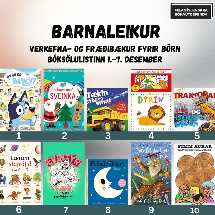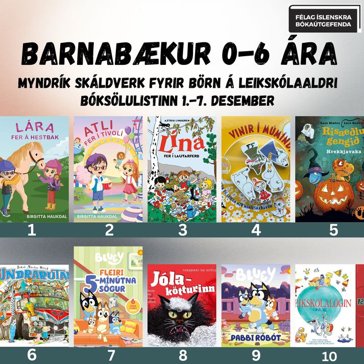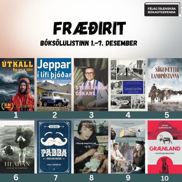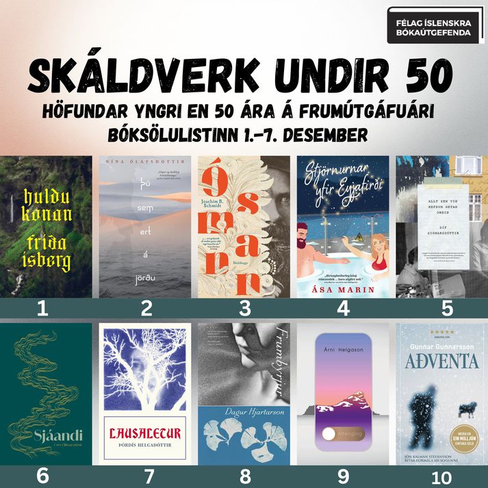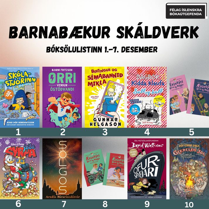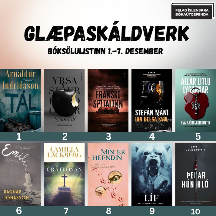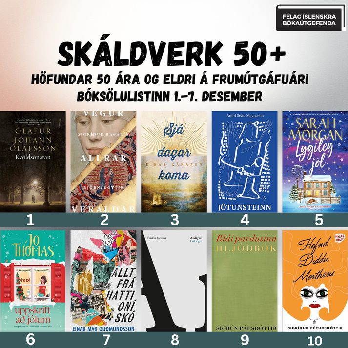 Og enn er Skólastjórinn á toppnum! „Þrátt fyrir pólitíska klæki og bellibrögð úr ýmsum áttum þá haggar ekkert veru þessa skólastjóra í toppsætinu eftir sölu fyrstu vikunnar í desember. Ævar Þór brosir breitt þessa dagana og hann hefur efni á því. Skólastjóri hans selst sem heitar lummur.vísir/valli Þetta er glæsilegur árangur hjá Ævari Þór sem lengi hefur skrifað vinsælar bækur fyrir börn,“ segir Bryndís Loftsdóttir framkvæmdastjóri Fíbút. Tál Arnaldur Indriðasonar situr áfram í öðru sæti en Syndafall Yrsu Sigurðardóttur flýgur úr ellefta sæti upp í það þriðja og skákar þar með bæði Kvöldsónötu Ólafs Jóhanns og Útkalli eftir Óttar Sveinsson. Aldrei hafa fleiri skáldsögur verið kynntar í Bókatíðindum svo nú er hægt að skoða alls kyns vinkla á sölu þeirra. „Þessa vikuna skiptum við skáldverkum upp í þrjá flokka; glæpasögur, sögur eftir höfunda sem á þessu ári ná fimmtíu ára aldri eða eru eldri og sögur eftir höfunda sem eru eða hafa verið undir fimmtugu við frumútgáfuár verks síns. Ég ætlaði reyndar fyrst að miða við fertugsaldurinn og var þá að horfa til þess að Arnaldur Indriðason var undir fertugu þegar hans fjórða bók, Mýrin kom út,“ segir Bryndís. Bryndís Loftsdóttir framkvæmdastjóri Félags íslenskra bókaútgefenda er komin í jólabókaham og hún leiðir lesendur Vísis í gegnum refilstigu íslenskrar bóksölu. Aldrei hafa fleiri skáldsögur komið út en nú. Líklega ráða ríkisstyrkirnir því en litlar sem engar bremsur virðast á því hvað kemur út og hvað ekki.vísir/vilhelm Halldór Laxness var búinn að gefa út Heimsljós, Sjálfstætt fólk og Sölku Völku fyrir fertugt, Vigdís Grímsdóttir gaf meðal annars út Kaldaljós, Ég heiti Ísbjörg, ég er ljón og Stúlkuna í skóginum fyrir fertugt og Auður Haralds gaf meðal annars út Hvunndagshetjuna, Læknamafíuna og fjórar Elíasarbækur áður en hún fagnaði fertugu. „Mér fannst ég vera alveg með þetta en þegar á hólminn var komið þá var einfaldlega betra jafnvægi á milli eldri og yngri deildarinnar með því að draga línuna við fimmtugt. Þarna flétta ég inn þýðingar til jafns við íslenskar frumútgáfur,“ að sögn Bryndísar. Það kom kannski helst á óvart að þýðingin á Aðventu eftir Gunnar Gunnarsson skyldi rata á yngri deildarlistann en hann var 47 ára þegar Aðventa kom fyrst út á þýsku árið 1936. „Það er óþarfi að fara nákvæmlega yfir þessa lista en vert að minna á að þó þarna séu upp talin 30 mest seldu skáldverkin þá er það aðeins rúm 10 prósent af heildarúrvali nýrra íslenskra og þýddra skáldverka og ljóða sem á boðstólnum eru á þessu ári.“ Óttar Sveinsson situr á toppi fræðibókalistans og hefur fyrir löngu slegið öll met með útgáfu á fjórða tug metsölubóka í þessari vinsælustu ritröð. Það verður svo enginn maður með mönnum sem ekki fær bæði Jeppar í lífi þjóðar og Steikarbók Óskars í jólagjöf. Hæsta flugið á þessum lista eiga svo Söguþættir landpóstanna sem virðast ætla að verða einn af óvæntari smellum ársins. Að lokum býður Bryndís upp á þrjá barnabókalistar, einn fyrir yngstu kynslóðina, annar fyrir þá sem farnir eru að lesa sjálfir og sá þriðji inniheldur alls kyns fræðibækur, handbækur og verkefnabækur. „Það sama á við hér og í skáldverkunum, þrátt fyrir að hér séu sýndar 30 mest seldu barnabækurnar þá er það aðeins um 10 prósent af heildarúrvalinu.“ Bóksölulistinn – mest seldu bækurnar 1.-7. desember 1. Skólastjórinn - Ævar Þór Benediktsson, myndir Elín Elísabet Einarsdóttir2. Tál - Arnaldur Indriðason3. Syndafall - Yrsa Sigurðardóttir4. Kvöldsónatan - Ólafur Jóhann Ólafsson5. Útkall : Ég er á lífi - Óttar Sveinsson6. Franski spítalinn - Ragnar Jónasson og Katrín Jakobsdóttir7. Lára fer á hestbak - Birgitta Haukdal, myndir A. Aleqsanian og E. Nazaryan8. Atli fer í tívolí - Birgitta Haukdal, myndir A. Aleqsanian og E. Nazaryan9. Jeppar í lífi þjóðar - Örn Sigurðsson10. Orri verður óstöðvandi - Bjarni Fritzson11. Birtingur og símabannið mikla - Gunnar Helgason, myndir Elías Rúni12. Hin helga kvöl - Stefán Máni13. Vegur allrar veraldar : Skálkasaga - Sigríður Hagalín Björnsdóttir14. Sjá dagar koma - Einar Kárason15. Bluey : Hvar er Bluey - Joe Brumm, þýð. Andri Karel Ásgeirsson16. Lína fer í lautarferð - Astrid Lindgren, þýð. Sigrún Árnadóttir17. Leikum með sveinka -18. Dagbók Kidda klaufa 19 : Sull og bull - Jeff Kinney, þýð. Helgi Jónsson19. Spegill þjóðar : Fréttamyndir í fimmtíu ár - Gunnar V. Andrésson og Sigmundur Ernir Rúnarsson20. Söguþættir landpóstanna - Helgi Valtýsson og Guðjón Ragnar Jónasson ritstýrðu