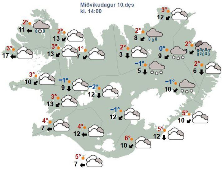 Á vef Veðurstofunnar segir að gefnar hafi verið út gular viðvaranir vegna vinds á Vestfjörðum og Suðausturlandi, en vegna hríðar á miðhálendinu. Fram kemur að það verði rigning eða slydda öðru hverju víða um land, en lengst af þurrt á Suður- og Vesturlandi. Lægðin fjarlægist norður í haf í kvöld og dregur þá úr vindi. Hiti verður á bilinu eitt til níu stig og mildast syðst. „Á morgun, fimmtudag kemur ný lægð sunnan úr hafi, sem dýpkar ört, en virðist ætla að sveigja til suðvesturs frá landinu. Gerir þá austanhvassviðri eða -storm með rigningu eða slyddu, en snjókomu til fjalla. Hægari suðaustlæg átt og skúrir eða slydduél sunnantli seinnipartinn, en rofar smám saman til fyrir norðan. Sama lægð nálgast aftur á föstudag með allhvassri eða hvassri suðaustanátt, skúrum eða rigningu, en þurru veðri fyrir norðan. Áfram þó fremur milt veður,“ segir í hugleiðingum veðurfræðings. Spákort fyrir klukkan 14.Veðurstofan Veðurhorfur á landinu næstu daga Á fimmtudag: Gengur í austan 15-25 m/s með rigningu eða slyddu, en en snjókomu til fjalla, talsverð úrkoma um tíma suðaustantil. Hiti 1 til 8 stig, hlýjast syðst. Á föstudag: Austan og suðaustan 10-18 m/s og skúrir eða él, en lengst af þurrt norðantil. Hiti 1 til 6 stig. Á laugardag: Ákveðin suðlæg átt, en norðaustlægari á Vestfjörðum. Slydda eða snjókoma með köflum, en skúrir eða él suðvestantil síðdegis. Hiti 0 til 5 stig. Á sunnudag: Útlit fyrir stífa suðlæga eða breytilega átt éljum eða snjókomu, einkum sunnan heiða og hita nálægt frostmarki. Á mánudag og þriðjudag: Líklega breytileg átt, dálítil él og svalt í veðri.
