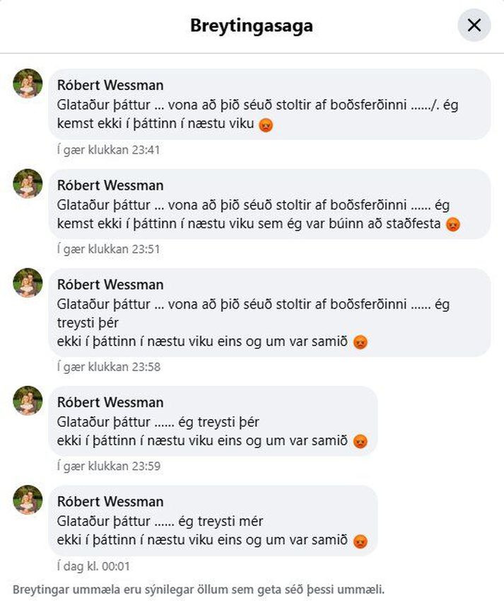 Róbert hættur við að mæta í hlaðvarp vegna viðtals við Albert Árni Sæberg skrifar 12. desember 2025 12:25 Róbert Wessman mætir ekki í hlaðvarpið Chess After Dark. vísir Róbert Wessmann, stofnandi Alvotech, hefur afboðað komu sína í hlaðvarpið Chess after dark vegna viðtals við Albert Guðmundsson knattspyrnumann, þar sem hann ræðir nauðgunarmál á hendur honum. Stjórnendum hlaðvarpsins þykir miður að Róberti sé svo misboðið að hann sjái sér ekki fært að mæta í viðtal. Albert var eins og þekkt er sýknaður í Landsrétti af ákæru fyrir nauðgun á dögunum. Hann tjáði sig um málið í yfirlýsingu á Instagram í byrjun desember en hefur að öðru leyti ekki rætt málið opinberlega. Það er að segja þangað til að hann ræddi það við þá Birki Karl Sigurðsson og Leif Þorsteinsson, stjórnendur hlaðvarpsins Chess after dark, í þætti sem fór í loftið í gær. Málið hafi tekið á Þar rakti Albert meðal annars daginn sem ákæra á hendur honum var gefin út og málið var sem mest í kastljósinu. Hann sagðist hafa verið á æfingu með Genoa, þáverandi liði sínu, þegar fréttir birtust. „Ég kem inn af æfingu og fer inn í klefa, er að slaka á og kíki á símann. Sé að mamma er búin að hringja í mig sex sinnum, pabbi fjórum sinnum, Gulla [barnsmóðir hans] þrisvar og Villi Vill svona átta sinum.“ Þá sagði hann að málið hefði tekið mikið á sig og ekki hefði verið auðvelt að ganga í gegnum það. Hann væri aftur á móti stoltur af sjálfum sér vegna þess hvernig hann tæklaði aðstæður, hafi náð að setja málið til hliðar og einblína á það sem skipti máli í lífinu, fjölskylduna, vini og fótboltann. „Glataður þáttur“ Stjórnendur Chess after dark tilkynntu á Facebook í gær að þeir hefðu ákveðið að skella sér til Flórens á Ítalíu, til þess að taka viðtal við Albert. Albert býr þar í borg þar sem hann leikur með Fiorentina. Tilkynning þeirra virðist hafa farið fyrir brjóstið á Róberti Wessmann, stofnanda Alvotech. „Glataður þáttur …… ég treysti mér ekki í þáttinn í næstu viku eins og um var samið,“ segir hann í athugasemd við færsluna og lætur lyndistákn fylgja, sem sýnir fram á að hann sé reiður. Á breytingasögu athugasemdarinnar má sjá að Róbert virðist ekki hafa verið nægilega ánægður við upphaflega útgáfu athugasemdarinnar. Hann breytti henni fjórum sinnum á tuttugu mínútum þangað til að hann varð sáttur, líkt og sjá má á myndinni hér að neðan. Skjáskot Samkvæmt heimildum Vísis er Róbert góður vinur fjölskyldu brotaþola í máli Alberts. Staðið til að ræða við Albert um árabil Þeir Birkir Karl og Leifur hafa sent Vísi yfirlýsingu vegna málsins. Þar kemur fram að þeim þyki leiðinlegt að Róbert, sem þeir hafi lengi hlakkað til að ræða við, sé svo misboðið að hann hætti við að mæta til þeirra. „Flestir sem hafa fylgst með hlaðvarpinu okkar síðustu fimm árin vita að viðtöl við okkar fremsta knattspyrnufólk hefur verið stór þáttur af dagskrárgerðinni. Við höfum verið afar lánsamir að fá að heimsækja fjölmargar íslenskar stjörnur undanfarin ár. Það má segja að það hafi staðið til árum saman að setjast niður með Alberti og ræða feril hans og stöðu. Við töldum það þó ekki við hæfi á meðan þetta erfiða mál fór sína leið í gegnum réttarkerfið. Málinu er hins vegar lokið og í takt við okkar stefnu í dagskrárgerð tókum við viðtal við einn okkar fremsta knattspyrnumann og lífi hans sem stórstjarna í einni stærstu knattspyrnudeild heims.“ Í slíku viðtali hefði beinlínis verið einkennilegt að spyrja ekki hvaða áhrif þetta mál hefur haft á knattspyrnuferil Alberts og hann hafi svarað því með sínum hætti. „Við höfum fullan skilning á því að þetta er sorglegt og viðkvæmt mál sem bjó til sár sem munu eflaust seint gróa og tilfinningarnar eru sterkar. Við reyndum hins vegar að nálgast það af nærgætni og virðingu.“ Mál Alberts Guðmundssonar Landsliðsmenn sakaðir um kynferðisofbeldi Dómsmál Ítalía Hlaðvörp Samfélagsmiðlar Alvotech Mest lesið Róbert hættur við að mæta í hlaðvarp vegna viðtals við Albert Lífið Íslenskt La(m)bubu úr gæru, soðnu kindahorni og fiskaugum Tíska og hönnun Framkvæmdastjóri Eurovision bregst við ákvörðun Íslands Lífið Sannir Finnar lýsa yfir stuðningi við slaufuðu fegurðardrottninguna Lífið Húsið fallega í Eyjum komið langt á veg Lífið Innlit í glænýja mathöll í Smáralindinni Lífið Frumsýning á Vísi: „Sýna fólki hver Bubbi er í raun og veru“ Bíó og sjónvarp Sigurvegari Eurovision skilar bikarnum Lífið Svipt krúnunni eftir að hafa gert sig skáeygða Lífið Stiklusúpa: Allt það helsta sem kynnt var á Game awards Leikjavísir Fleiri fréttir Róbert hættur við að mæta í hlaðvarp vegna viðtals við Albert Sannir Finnar lýsa yfir stuðningi við slaufuðu fegurðardrottninguna Innlit í glænýja mathöll í Smáralindinni Hanskar Gunna Nels, árituð ManU-treyja og Elli Egils á uppboði Húsið fallega í Eyjum komið langt á veg Sigurvegari Eurovision skilar bikarnum Krökkt af kempum í útgáfuhófi Óla Jó Framkvæmdastjóri Eurovision bregst við ákvörðun Íslands Svipt krúnunni eftir að hafa gert sig skáeygða Spígsporandi górilla á fyndnustu dýralífsmynd ársins Tóku áskoruninni og Joey Christ sver af sér sviðsetningu Opnar sig loksins um sambandið umtalaða Þetta þykja flottustu jólaskreytingarnar í miðborginni Listaverkin í World Class sem gjarnan hafa verið á milli tannanna á fólki Hvert er burðarþol íslensks almennings fyrir kjaftæði? Sjö tilnefndir til Íslensku þýðingarverðlaunanna Stærstu stjörnubrúðkaupin á árinu Skorar HúbbaBúbba á hólm: „S
