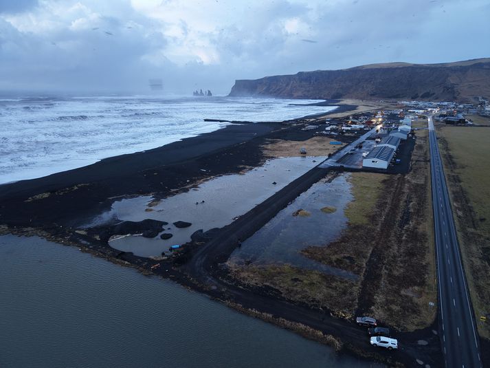 Mikill sjór gekk á land við Vík í Mýrdal í gær með þeim afleiðingum að flóð var austan við Vík og sunnan við þjóðveginn og mikill sjór safnaðist saman við bæinn. Austan við Vík gekk sjór yfir þjóðveginn. Þó nokkur sjór safnaðist saman á landi við Vík í Mýrdal.Einar Freyr Elínarson Mbl.is greindi fyrst frá. Einar Sveinbjörnsson, veðurfræðingur Vegagerðarinnar, segir sjóganginn í gær vera áhyggjuefni og koma verulega á óvart. „Það virðist vera sem að breytingar hafi orðið á sandinum framan við Vík og líka við Reynisfjöru. Þannig að sjórinn gekk lengra inn á land en venja er til, í ekki verra veðri en var þó. Það var einhver öldugangur og einhver vindur en alls ekki verulega slæmt veður. Ég held að þetta hafi komið fólki í Vík á óvart. Ég var hissa að sjá myndir af þessu í gær.“ Hætta geti fylgt svo miklum sjógangi. Hann segir þetta skýrt dæmi um að það sé mikilvægt að vera vakandi fyrir ágangi sjávar við strendur landsins. „Það gildir um þetta eins og aðrar náttúruvár. Við megum ekki sofna á verðinum. Við þurfum að vera stöðugt meðvituð um þessa hættu. Þessi hætta er ekki ný til komin heldur hefur verið lengi en það er eins og við látum alltaf taka okkur í bakaríið á endanum. Eins og við séum hálfsofandi allavega margir hverjir. En auðvitað er Vegagerðin og almannavarnir að fylgjast með þessu, þó það nú væri.“ Einhver öldugangur var í gær en búast má við enn meiri ákafa á næstu dögum.Einar Freyr Elínarson Hann bendir á að í Kötlugosinu 1918 hafi jarðefni bæst við meðfram ströndinni sem hafi veitt dálitla vörn. Sú vörn sé þó á undanhaldi. „Það er stöðugt verið að naga af viðbótinni frá Kötlugosinu. Það verður að segjast eins og er að þetta er eitt af því fáa jákvæða sem kæmi með nýju Kötlugosi. Þá kæmi nýtt framburðarefni og meira land.“ Hann segir verra veður í vændum fyrir jólin.