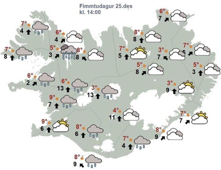 Frá þessu segir á vef Veðurstofunnar en fyrra met var 19,7 stig, sett á Kvískerjum 2019. „Nú er sunnanáttin farin að ganga niður, víða 8-15 m/s með morgninum og súld eða rigning með köflum, en léttskýjað á Norðaustur- og Austurlandi. Áfram hlýtt í veðri þó hitatölur nái líklega ekki sömu hæðum og í gærkvöldi. Í kvöld nálgast kuldaskil úr vestri, þá bætir heldur í vind og úrkoman verður samfelldari vestanlands. Þegar skilin ganga yfir í nótt kólnar nokkuð skarpt og það fer að snjóa til fjalla.Vestan og suðvestan 10-18 m/s á morgun og lítilsháttar él, hvassast norðanlands. Í fyrramálið verður skilaúrkoman þó enn viðloðandi austantil á landinu en þar léttir til þegar líður á morguninn. Hiti um eða yfir frostmarki. Síðdegis verður svo þurrt að mestu á landinu og það dregur smám saman úr vindi,“ segir í hugleiðingum veðurfræðings. Spákort fyrir klukkan 14 í dag.Veðurstofan Veðurhorfur á landinu næstu daga Á laugardag: Vaxandi suðvestanátt norðanlands, 10-18 m/s þar seinnipartinn, en annars mun hægari vindur. Skýjað vestantil, sums staðar dálítil væta og hiti 0 til 6 stig, en léttskýjað og svalara um landið austanvert. Á sunnudag: Suðvestan og vestan 5-13 m/s, skýjað að emstu og dálítil væta á stöku stað, en bjart með köflum austantil. Hiti víða 0 til 6 stig. Á mánudag: Hæg vestlæg eða breytileg átt og bjart með köflum, en líkur á stöku skúrum eða éljum norðan- og vestantil. Heldur kólnandi veður. Á þriðjudag: Suðvestlæg átt og skýjað með köflum, en dálítil él á víð og dreif. Hiti nærri frostmark. Á miðvikudag (gamlársdagur): Útlit fyrir ákveðna vestan- og síðan norðvestanátt og víða dálitla úrkomu, en þurrviðri suðaustanlands. Fremur svalt í veðri.