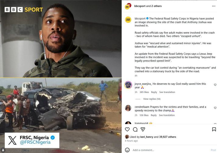 Nú hefur verið staðfest að þeir tveir sem létust í bílslysinu voru þjálfarar og nánir vinir hans, Latz og Sina. Sina var styrktar- og þrekþjálfari hans, sem undirbjó hann fyrir bardagann við Jake Paul fyrir aðeins tveimur vikum, en Latz var einkaþjálfari Joshua. View this post on Instagram A post shared by SPORTbible KO (@sportbibleko) Umferðaröryggisstofnun Nígeríu hefur birt mynd sem sýnir slysstaðinn þar sem Anthony Joshua lenti í slysinu. Yfirvöld umferðaröryggismála segja að fimm fullorðnir karlmenn hafi lent í slysinu – tveir þeirra létust. Tveir aðrir „sluppu ómeiddir“. Joshua var bjargað á lífi en hafði hlotið minni háttar meiðsl. Hann var fluttur á sjúkrahús til aðhlynningar. Í tilkynningu frá Umferðaröryggisstofnun Nígeríu segir að grunur leiki á að Lexus-jeppinn sem kom við sögu hafi verið á „meiri hraða en leyfilegt er“. Þar segir að ökumaðurinn hafi misst stjórn á bílnum við „framúrakstur“ og ekið á kyrrstæðan vörubíl við vegkantinn. Hér fyrir neðan má sjá myndirnar frá slysstað. @bbcsport