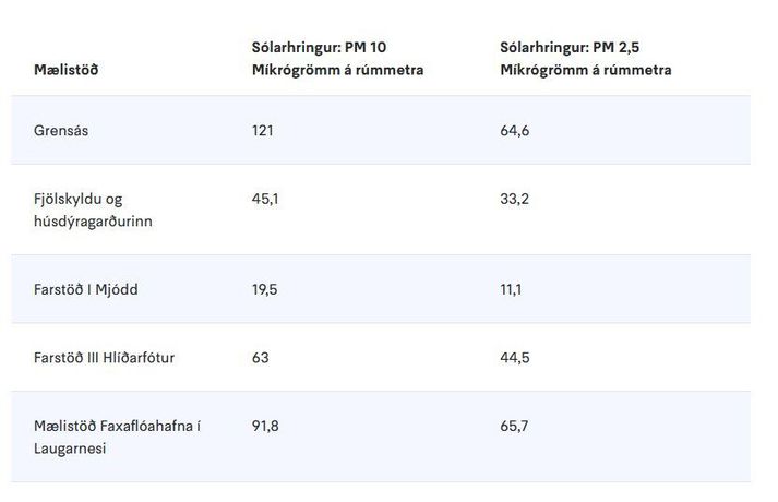 Svifrykið sem myndast þegar flugeldum er skotið upp er fíngerðara en umferðartengt svifryk og hlutfall smæstu agnanna, PM 2,5 og PM1, hærra. Þær agnir fara lengra niður í lungu og eiga greiðari aðgang inn í blóðrásina. Af þeim orsökum er fínasta svifrykið mun hættulegra heilsu en stærri agnirnar. Flugeldamengun inniheldur bæði þungmálma og önnur óæskileg efni sem myndast við bruna. Sólarhringsmeðaltal svifryks (PM10 og PM2,5) þann 1. janúar 2026 í míkrógrömmum á rúmmetra. Reykjavíkurborg Hæsta mælda klukkustundargildi PM10, svifagnir um 10 míkrógrömm að stærð, í Reykjavík mældist klukkan tvö um nótt í mælistöðinni við Grensás og var 1.043,4 míkrógrömm á rúmmetra. Á sama tíma mældist þar hæsta gildi PM 2,5 sem var 676,3 míkrógrömm á rúmmetra. Svifryk fór yfir sólarhringsheilsuverndarmörk PM10 í þremur af fimm mælistöðvum í Reykjavík. Engin sólarhringsheilsuverndarmörk eru fyrir PM2,5 en Alþjóðaheilbrigðisstofnunin (WHO) mælir með sólarhringsheilsuverndarmörkum upp á 15 míkrógrömm á rúmmetra. Sólarhringsgildi PM2,5 fóru yfir þau mörk í öllum stöðvum nema einni á nýársdag í Reykjavík. Þetta kemur fram í tilkynningu frá Reykjavíkurborg. Þar kemur fram að svifryk er fínasta gerð rykagna sem á greiða leið í öndunarfærin en heilsuverndarmörk miðast við 50 míkrógrömm á rúmmetra á sólarhring fyrir PM 10 (svifagnir um 10 míkrógrömm að stærð).